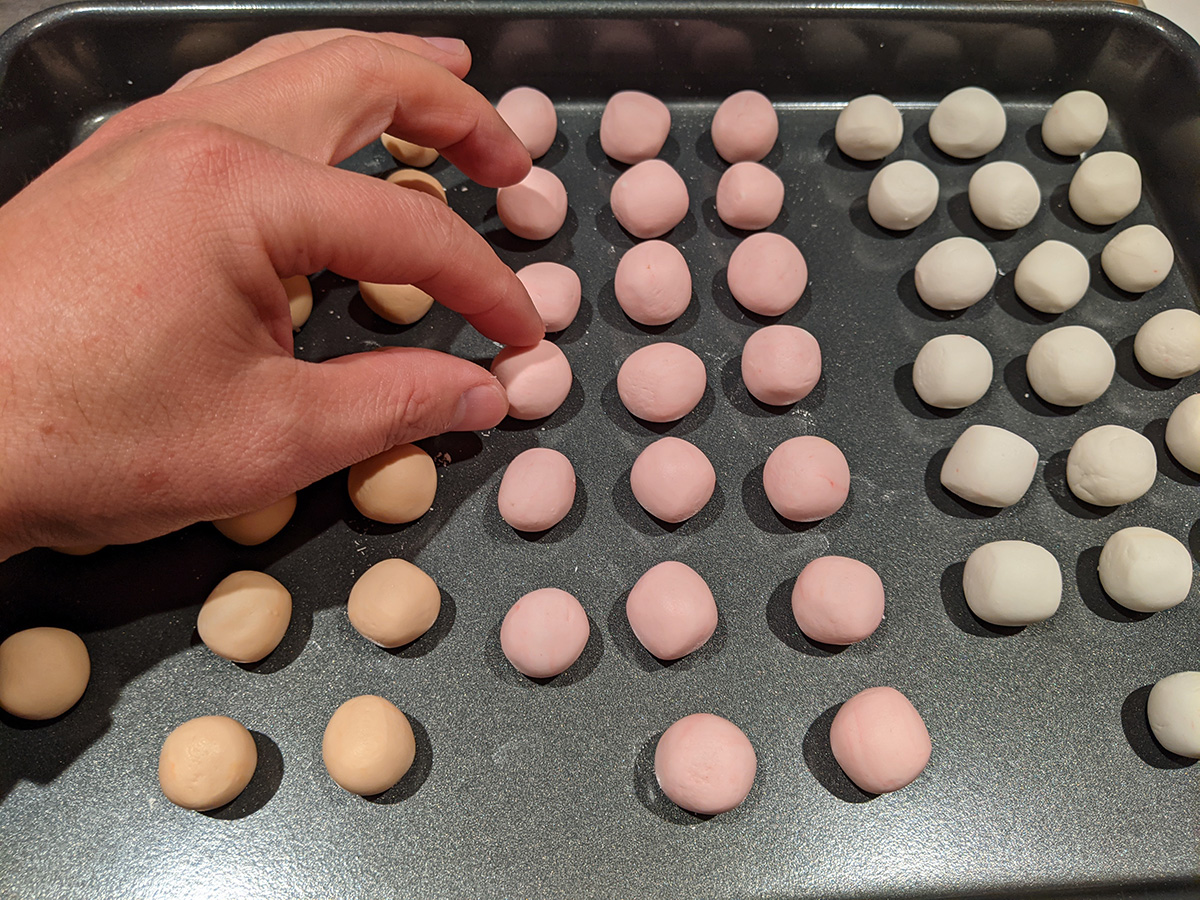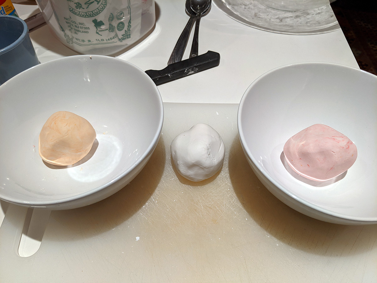 for some reason i had the bright idea of making orange tangyuan as well as the usual white (plain) and pink. i mixed a cup of glutinous rice flour with 1/2 cup of warm tap water. from a single dough ball i separated it into 3 individual dough balls. i added a single drop of food coloring to make the pink and combined a drop of red and yellow to make the orange. in hindsight i should've gone with yellow instead of orange, since it looked more peach.