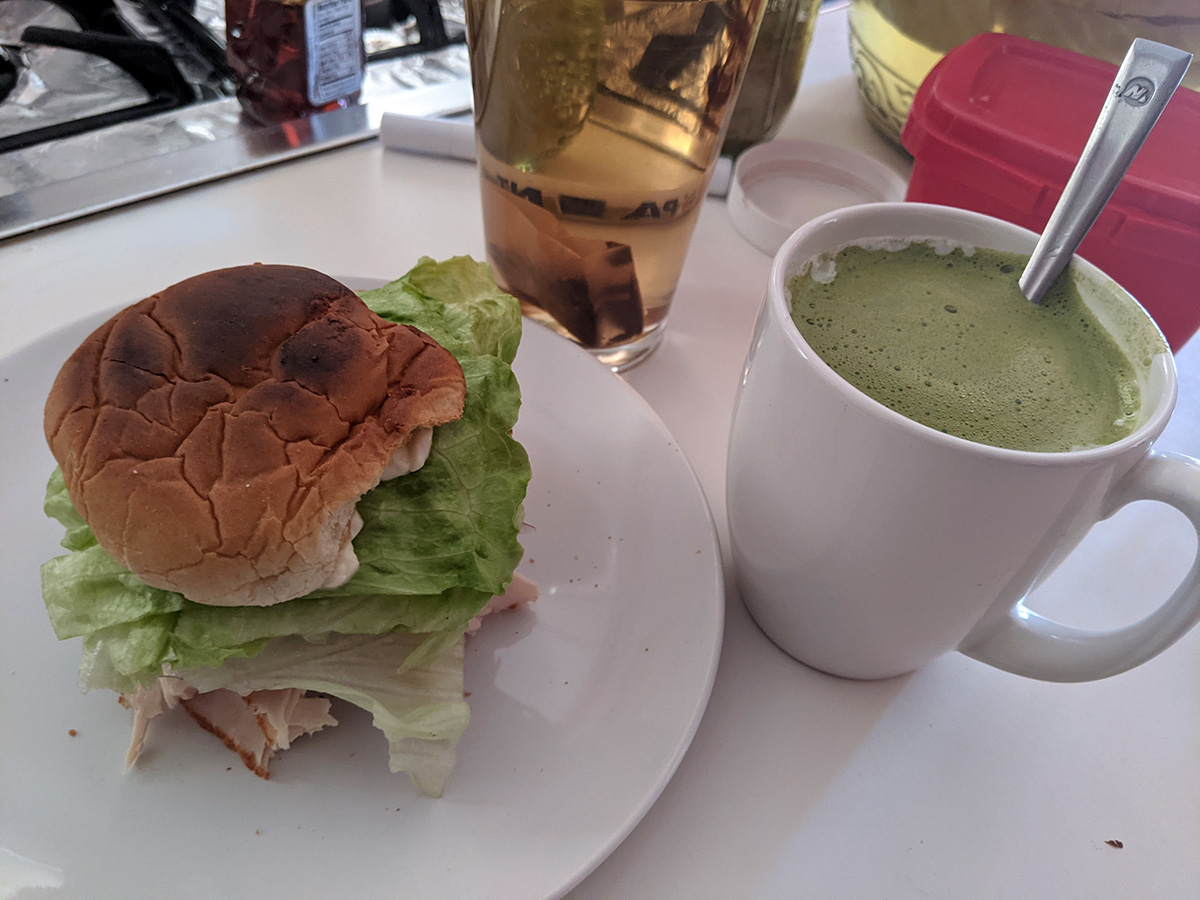 besides a matcha latte, i also made a simple turkey sandwich with my deli turkey slices, lettuce, and mayo served on a leftover blue ribbon barbecue burger bun that's been sitting on my kitchen counter since february 8th. it was pretty good considering it was just an improvised sandwich made with unwanted ingredients. i also went over to bruce's place to get some cabbage and celery soup he told me about last night. he also told me that jack slip and fell by danehy park and he had to drive over there to get him. when jack complained he felt a little woozy, bruce called the ambulance an jack went to the emergency room at mt.auburn hospital. bruce said it looked like jack might've dislocated his arm, which is better than being broken, but they won't know until after the x-ray.