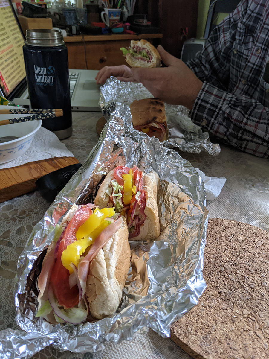 my father gave me a ride around noontime because it was raining. earlier he and my sister were helping her godmother move more things to her new central square apartment. i made two italian subs with my remaining cold cuts. while i waited for my ride, i also had a bowl of cereal, trying to use up all my milk before it goes bad.