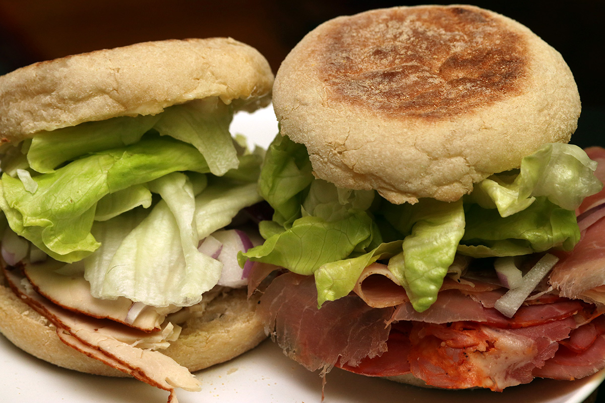for dinner i made two different english muffin sandwiches: lettuce-onion-turkey with mayo, and lettuce-onion-capicola-prosciutto with spicy mustard. the turkey sandwich was better. i ate one of the sweet bee apples for dessert while rewatching ted lasso.