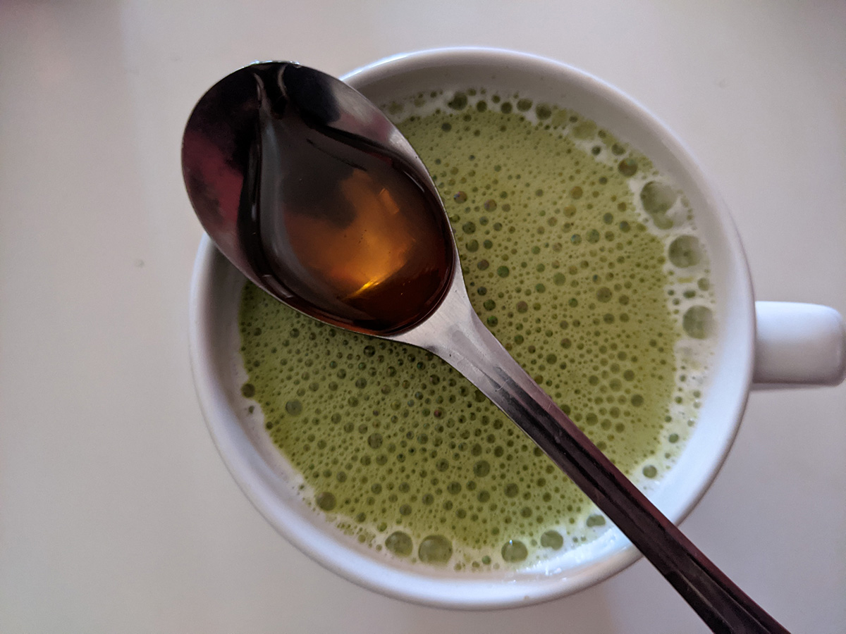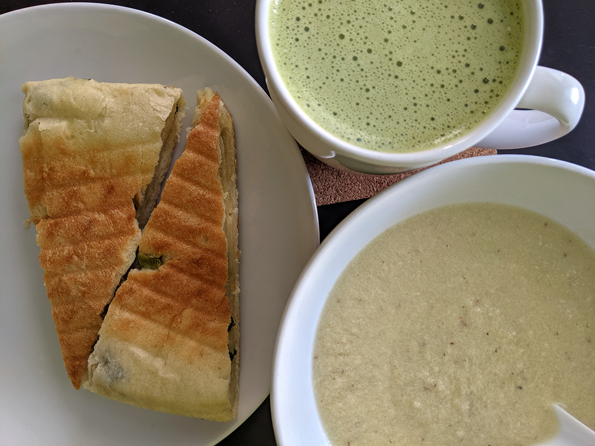 lesson learned: when you froth milk, it makes it turn cold. i used too much warm milk to mix the matcha powder so when i poured it into the rest of the warm milk, it turned lukewarm at best. next time, use the minimum amount of milk to mix the matcha. i also warmed up the rest of the cabbage celery soup bruce gave me and had some scallion bread. i prefer day-old scallion bread as it turns softer, compared to bread that's right out of the electric pan which is too crispy.