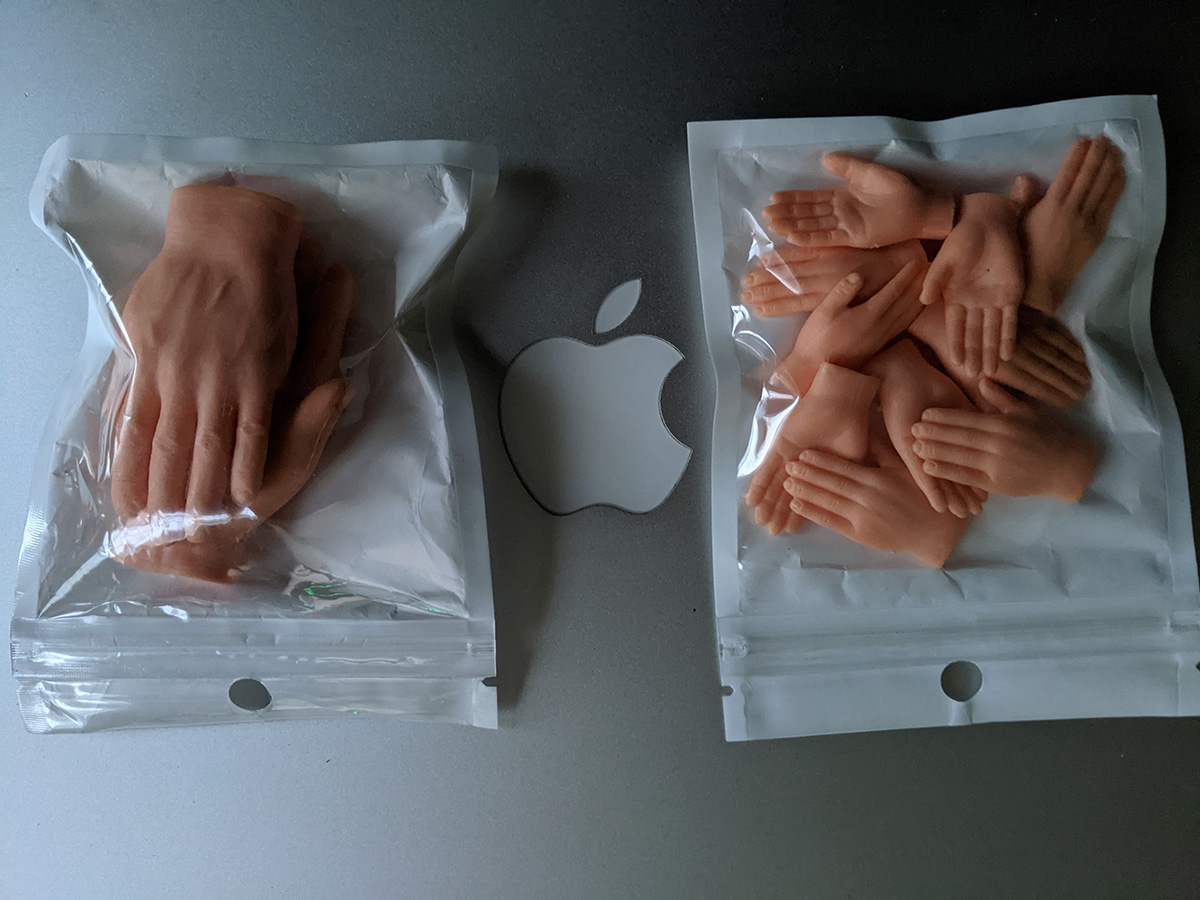 my finger hands arrived today from china courtesy of ebay. i bought a pair of 7cm hands ($3.22) and a pair of 3.5cm even smaller hands ($2.45). so i was pretty surprised when i discovered they sent me 10 smaller hands (looking at the ebay listing again, it did say 10pcs in the photo even though text description only said 2pcs). these tiny hands look a bit creepy, like i chopped off a bunch of little hands. they're pretty realistic too, especially the larger sized ones, which includes details like tendons and blood vessels.