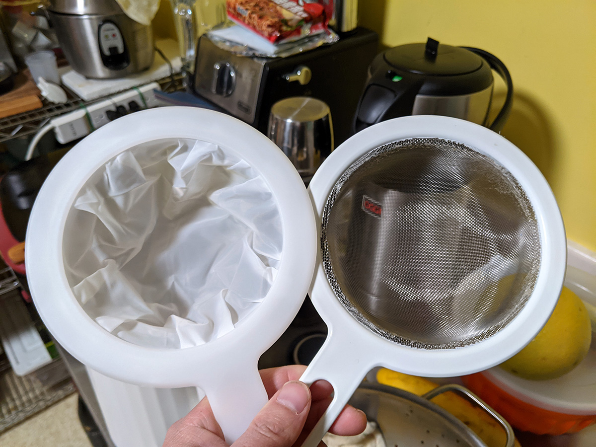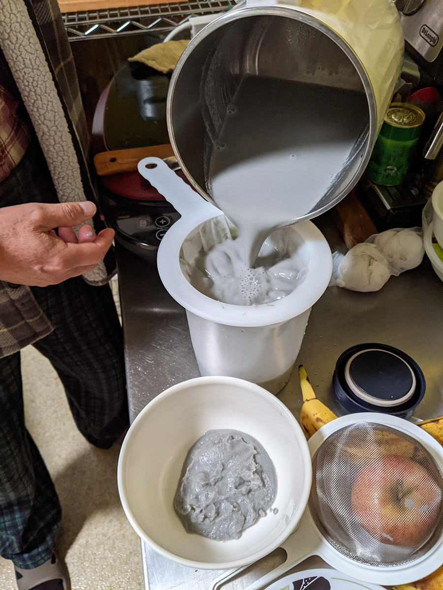 when i got to belmont i had beef noodles for lunch. later in the afternoon my parents cooked up a fresh batch of soy milk with black rice and nuts. the soy milk strainer we bought 3 months ago off of ebay finally arrived and we used it to strain the soy milk. it looked like the mesh was too fine for anything to pass through, but it did a very good job of capturing all the solids and still allowed the liquid to strain, though my father had to keep on tapping the strainer. the final strained soy milk was 100% liquid, not a speck of solid. it worked so well we ended up buying a nut milk bag from ebay, so we can strain the soy milk with our hands.