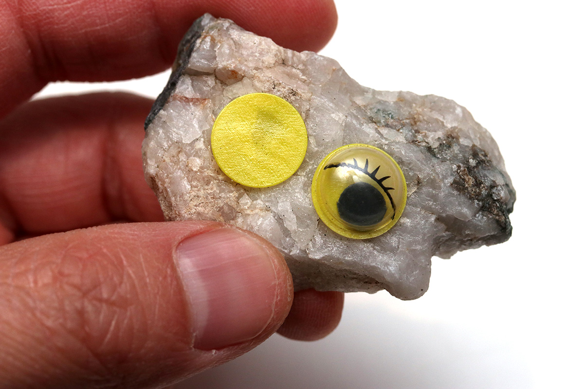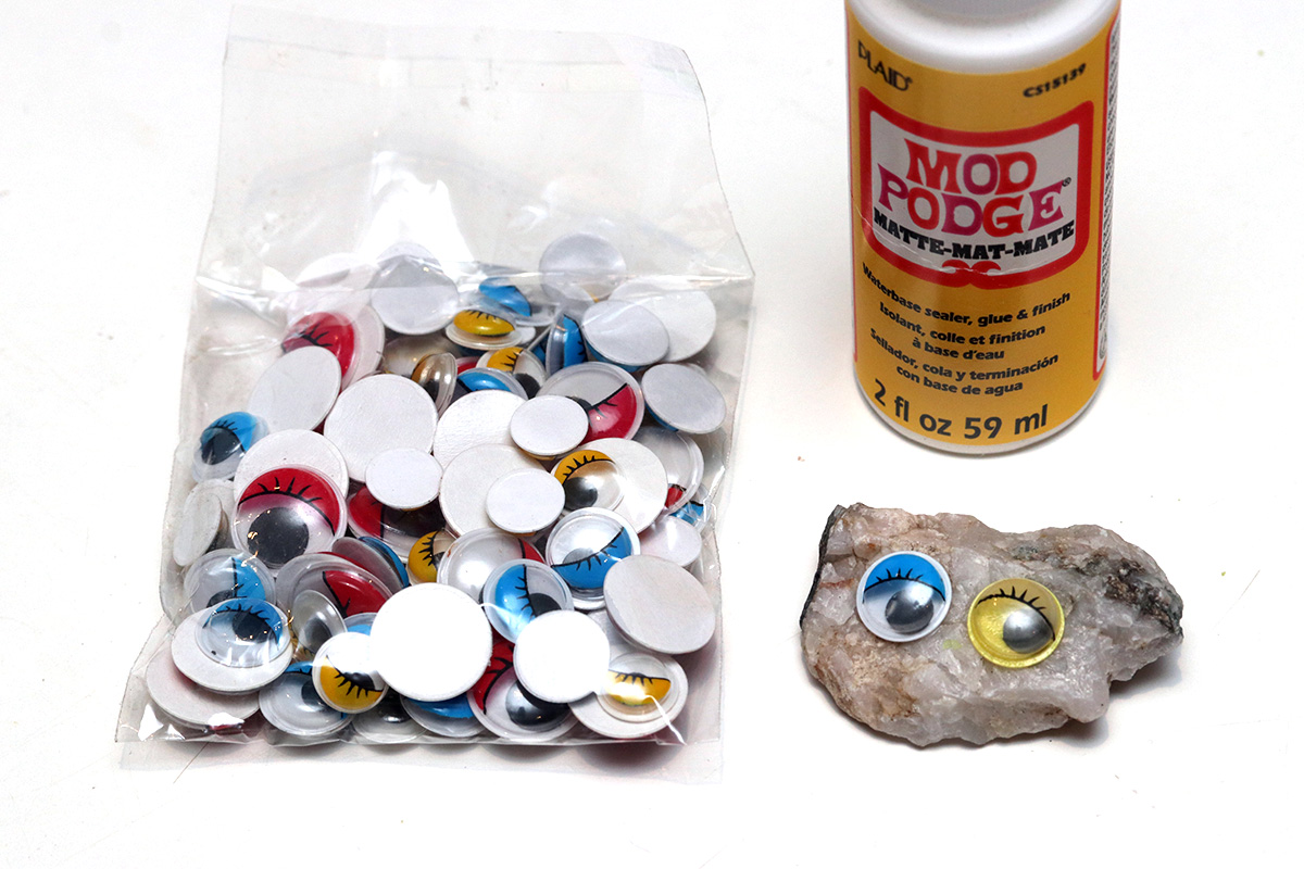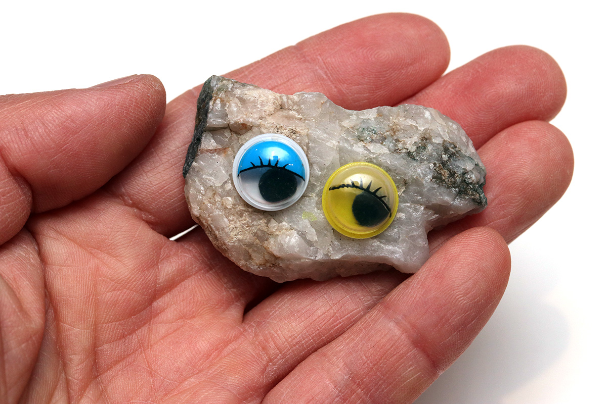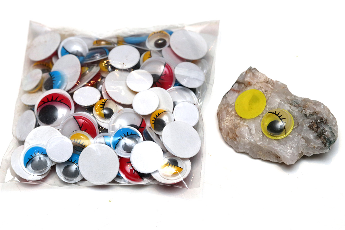 i repaired the googly eyed quartz somebody left on my doorstep during the pandemic. one of the eyes had fallen off. what's special about it though is the googly eye has eyelashes. i tried to find matching googly eyes but i couldn't. the closest i found had a white background, while the original eyes had yellow. i ended up order a packet ($1.59) from china via ebay, it took 1-1/2 months to finally arrive. now i have way more googly eyes than i know what to do with them.