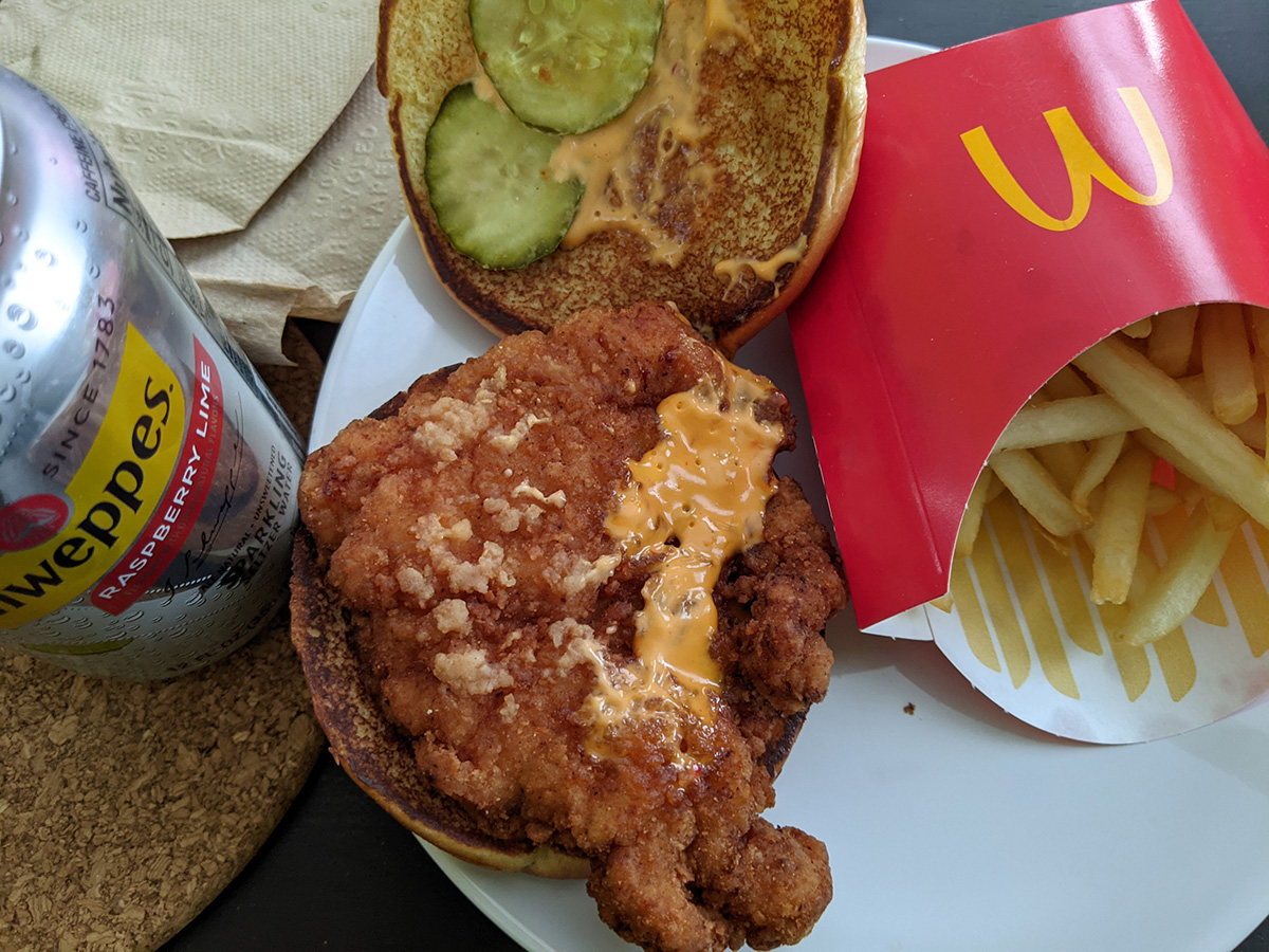 with that i was finished. i figured i'd around a bit longer to see if the craig's list seller had responded yet. minutes later i received a text message - chris - saying we could meet at the storage place around 1:15pm. that storage place turned out to be the one by market basket, so i know it well. that meant i had a little over an hour before i had to meet chris. my original plan for the day was to do some drone flying above cambridgeport but now i didn't have time. i did however make a mcdonalds order through their app, got a free spicy chicken sandwich with a $2.99 medium order of fries. i packed up my things and left the apartment.