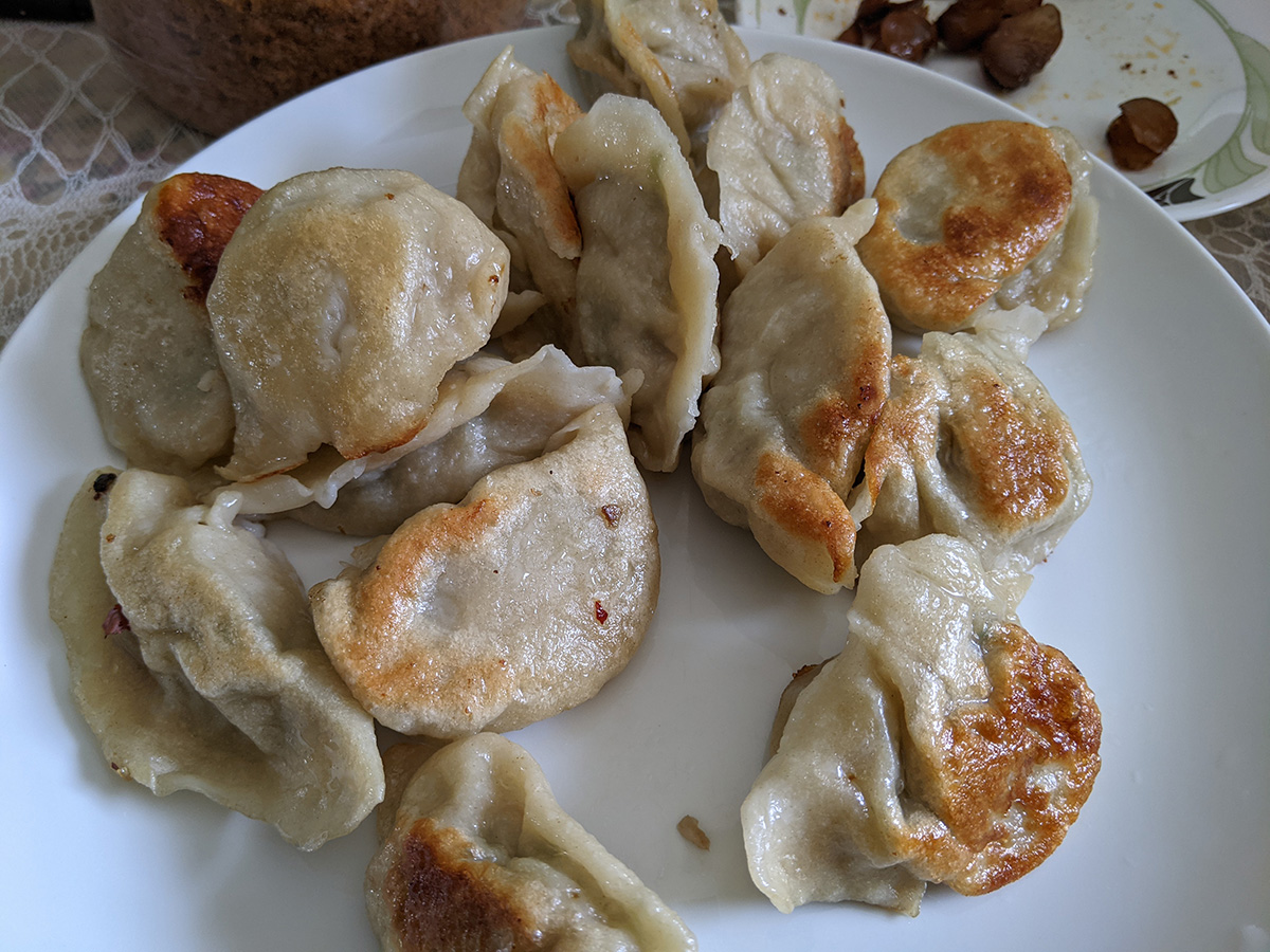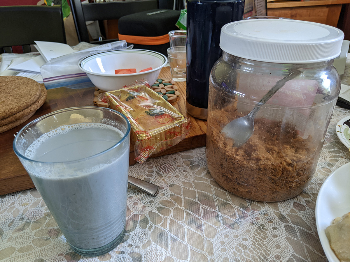 the first thing we did when we arrived in belmont was to start cooking the corned beef in the slow cooker. my mother didn't think there'd be enough time to prepare it, but 6 hours of high heat slow cooking until dinner was plenty of time for the corned beef to be ready. we didn't add any vegetables, just enough water to submerge the meat and i added an additional tablespoon of pickling spices for additional flavor. for lunch i had some pan-fried dumplings and some grainy soy milk (unstrained).