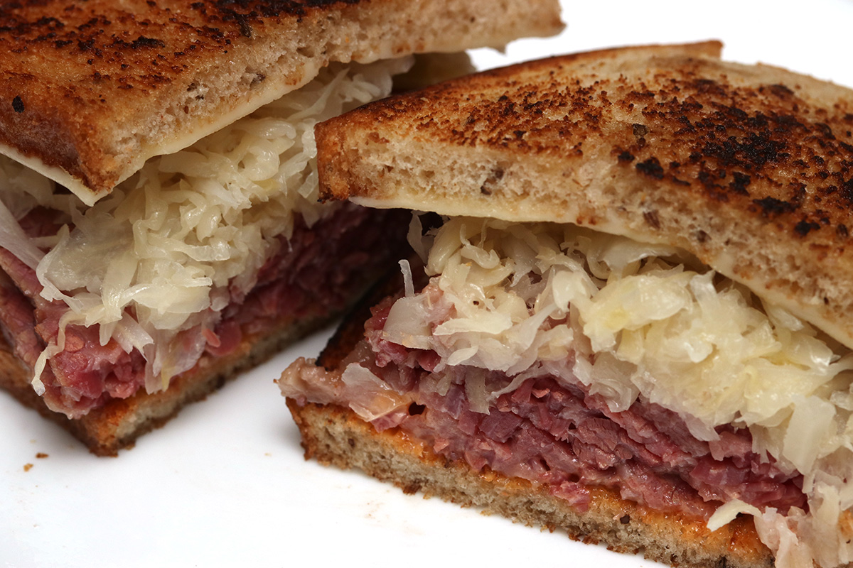 my mother kept checking on the corned beef every half hour. she point a plate on top of the beef to keep it from floating up. by 6pm the corned beef was finally done cooking and ready to be assembled into reuben sandwiches. while my father sliced the beef into thick layers, i toasted the rye bread in some butter and put on a slice of baby swiss cheese to melt. on the other piece of bread we slathered a layer of russian dressing. slices of corned beef were stacked onto the bread along with a layer of hand-squeezed thin sauerkraut. these sandwiches were pretty decadent, although i found the bread to be too thin. i have another corned beef in my own fridge that my mother suggested i bring over next weekend for a second round of reuben sandwiches.