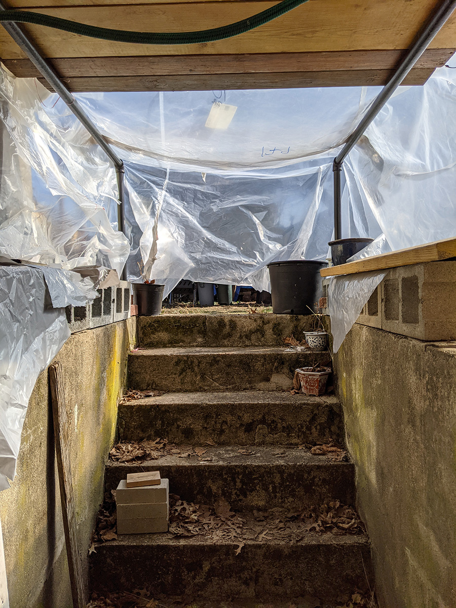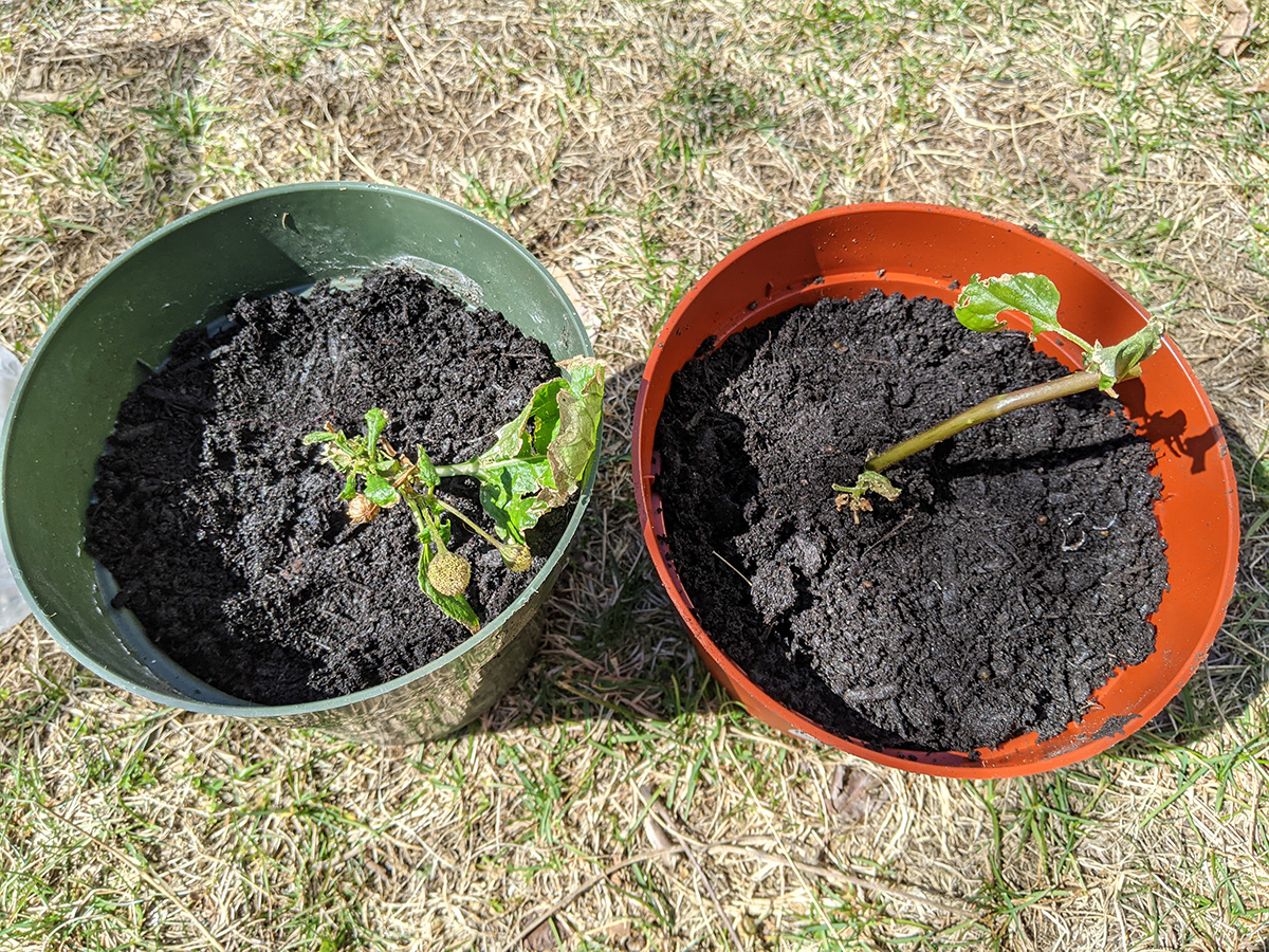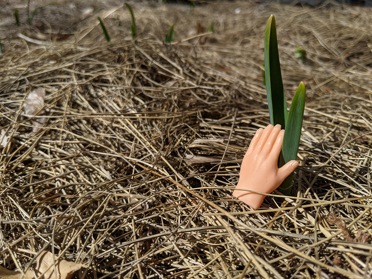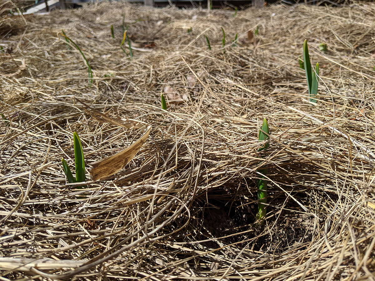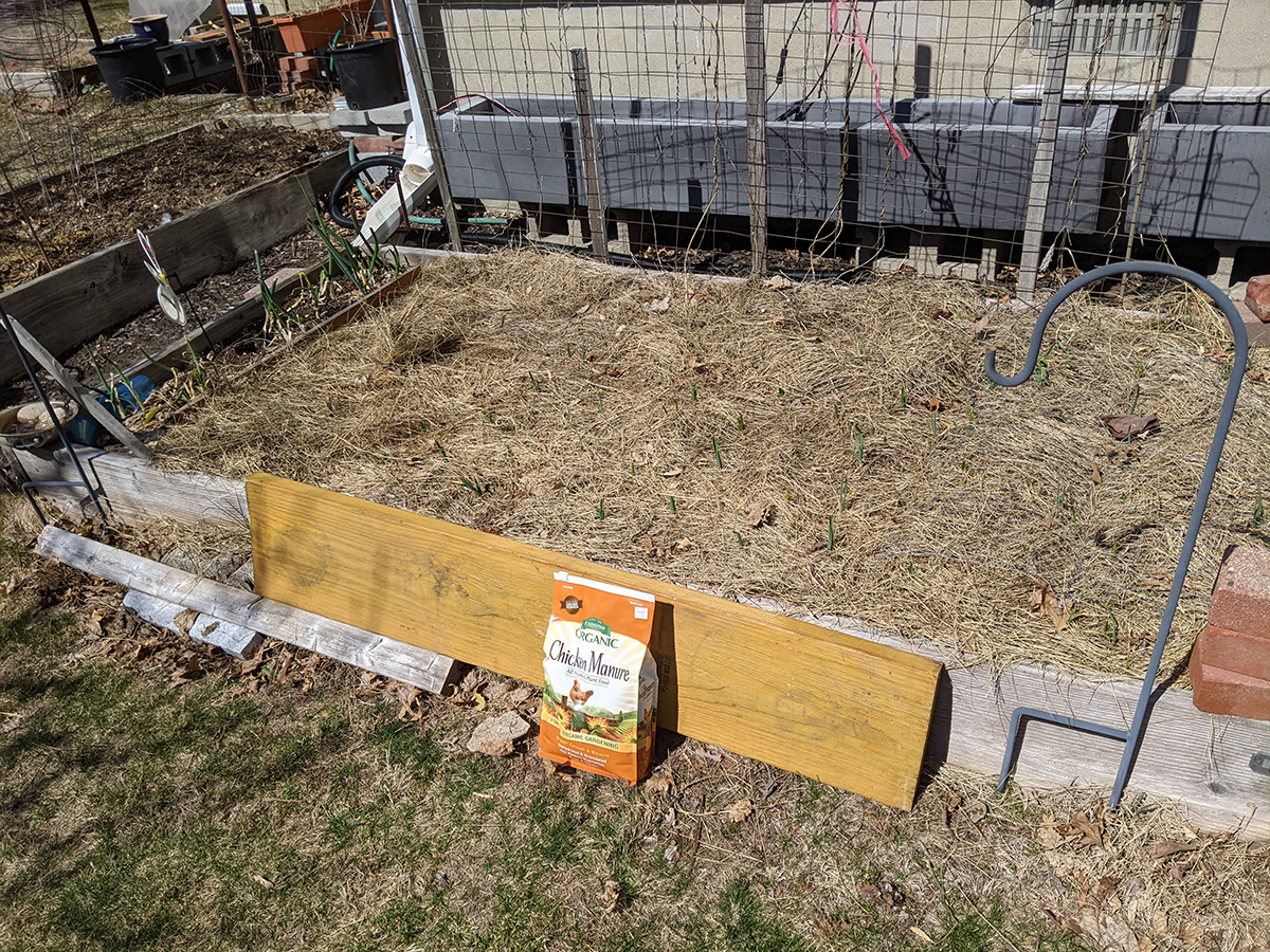 i fertilized the garlic bed (RB2) with chicken manure granules. i'd first dug out the garlic and used my hand to scoop out a small handful and scatter it around the garlic base. fortunately i planted in a logical pattern so even though some garlics were still buried underneath the protective layer of salt marsh grass, i could still find it. i did discover a few garlics were missing, taken by squirrels soon after i planted them last fall. after i was finished i put the chickenwire back over the garlic to prevent squirrels from digging in the bed. once they get bigger i'll remove the mesh.