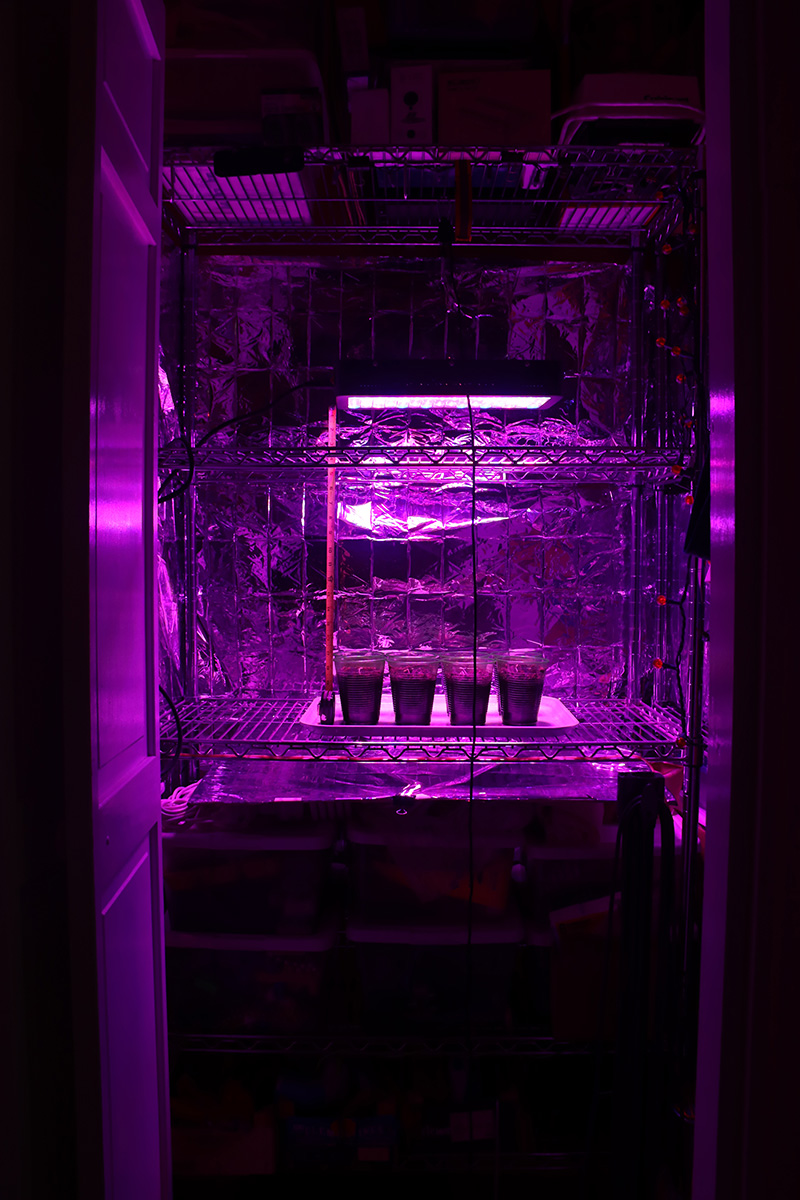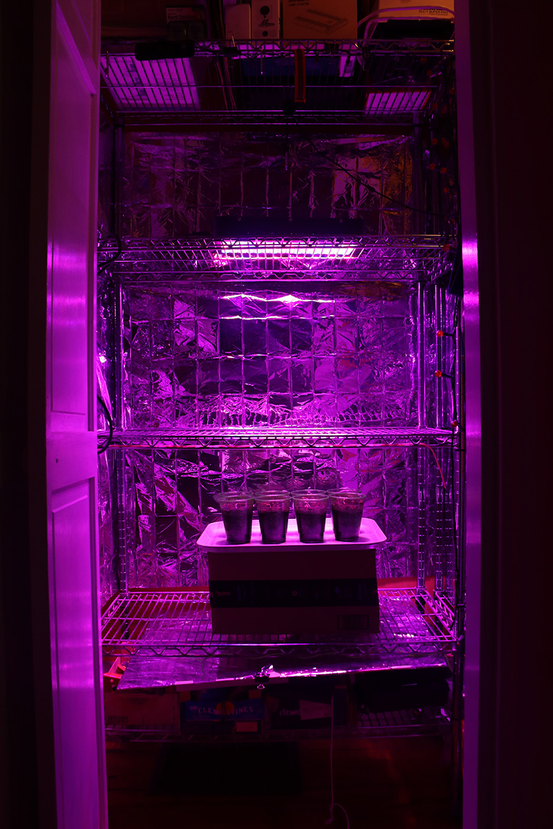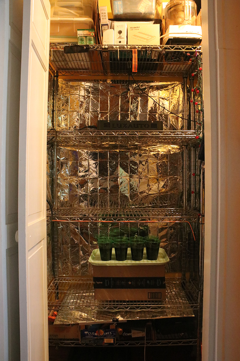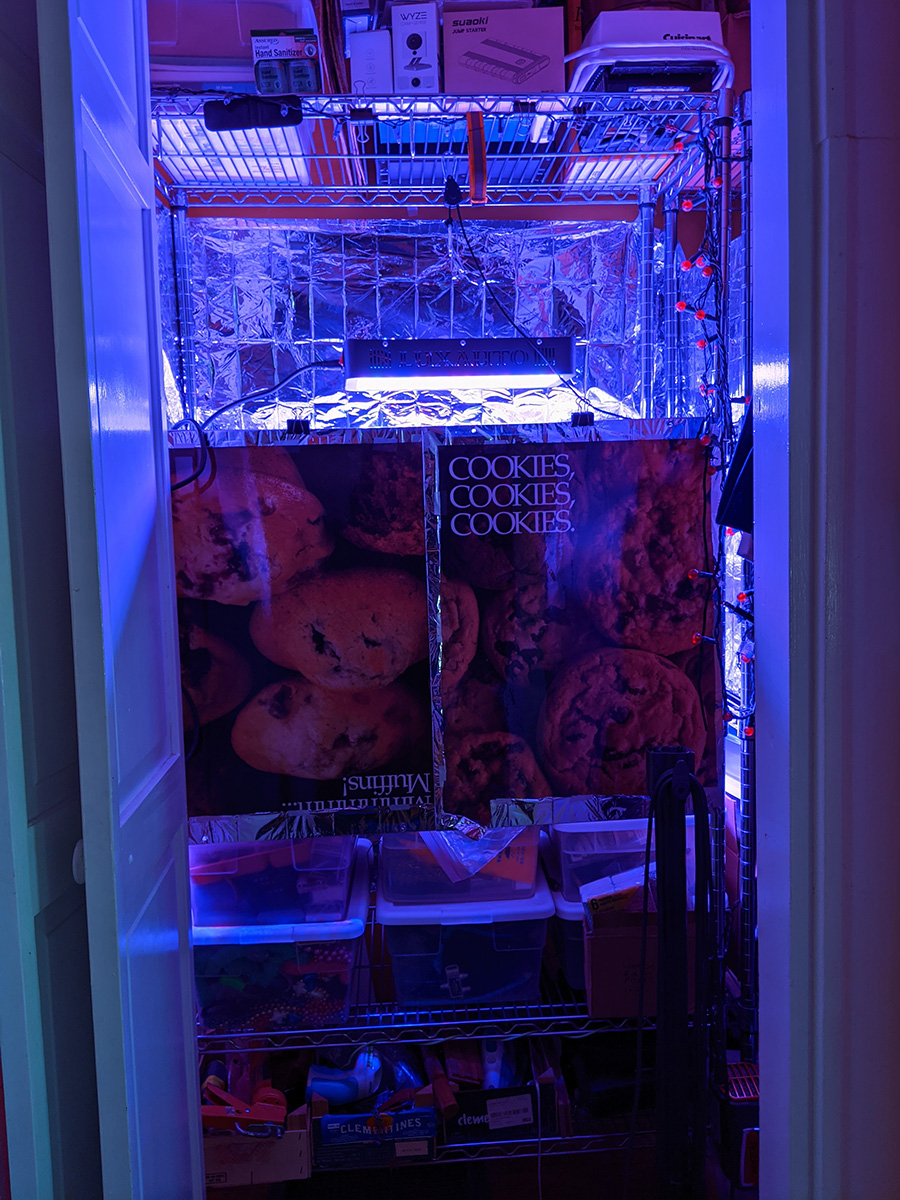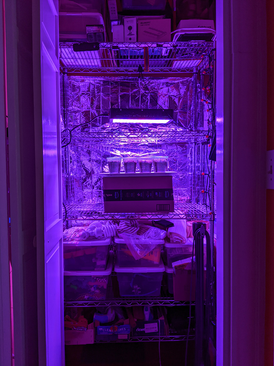 last night i noticed that my tomato seedlings had started to germinate. when i woke up this morning i removed all the plastic boxes from my closet so i could convert it into a grow closet. initially i had the seedlings too close to the grow light, just 10 inches. i then lowered it, but it was still 18 inches. i ended up moving the plants to a lower shelf entirely, finally allowing 24 inches of distance. this setup is only temporarily, until my barrina led strip lights arrive, whenever that may be.