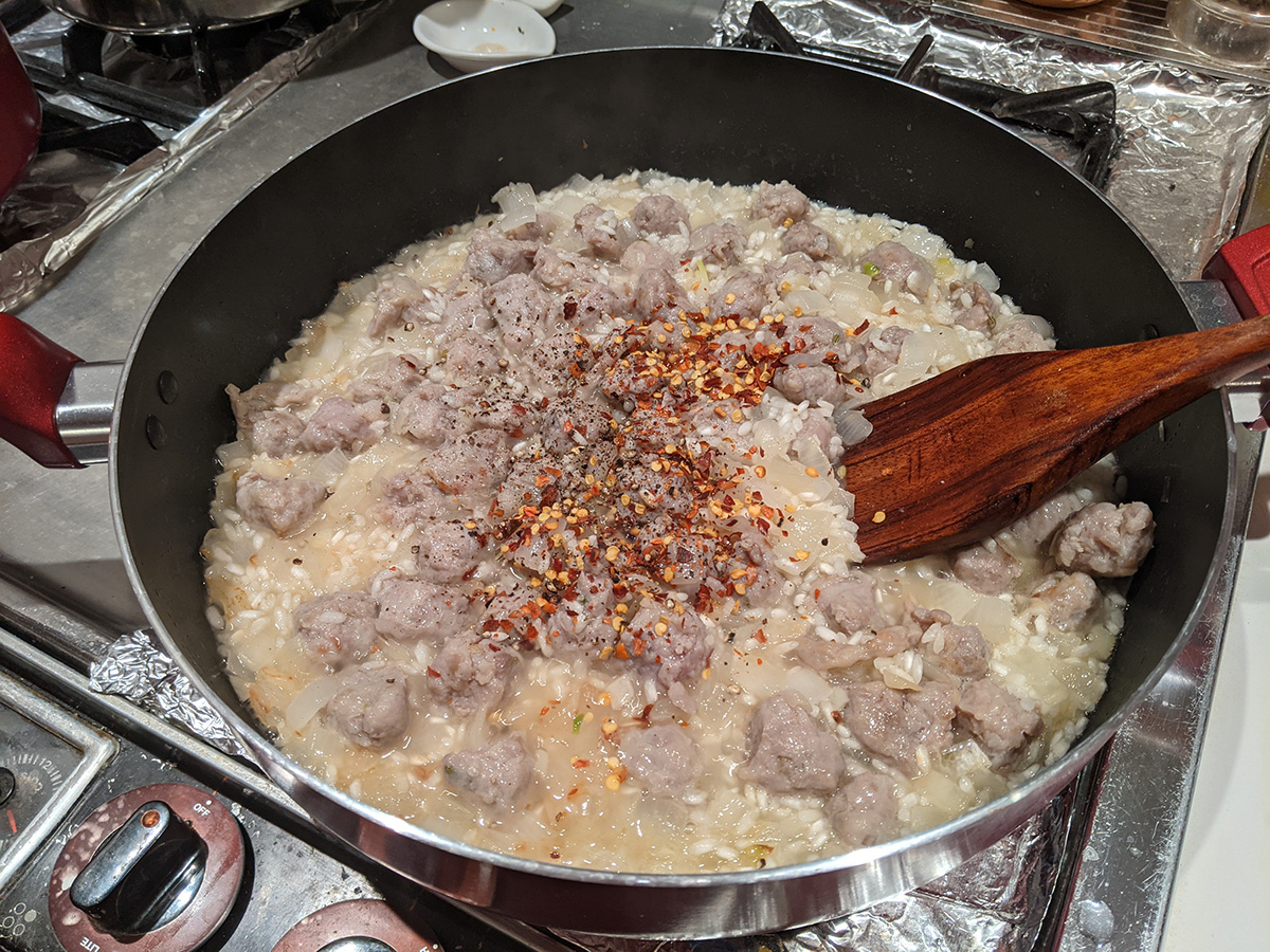 1 cup arborio rice 1 cup white wine 1 tbsp red pepper flakes fresh ground pepper