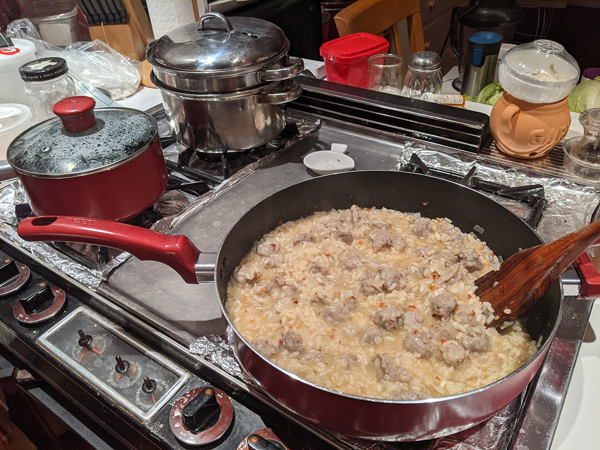 i made the risotto the old-fashion way (by hand) instead of using the instant pot, because i think hand-stirred tastes better, and its a labor of love. it also gave me a chance to use my largest t-fal pan. it worked very well, the wider surface area meant a bigger cooking surface. the risotto was pretty good, i was so hungry i could've easily ate the whole thing.