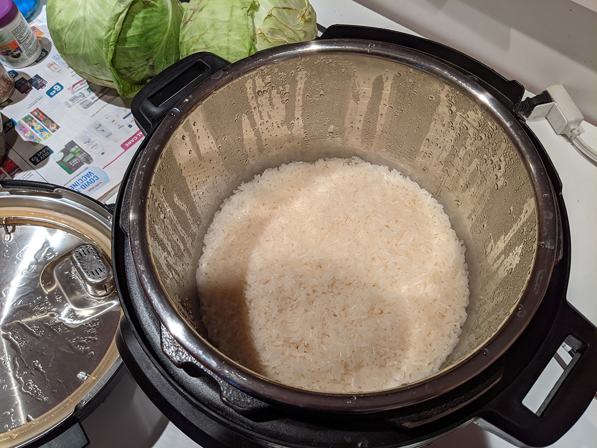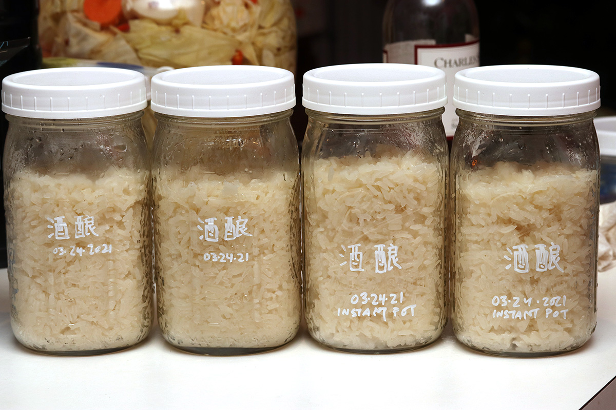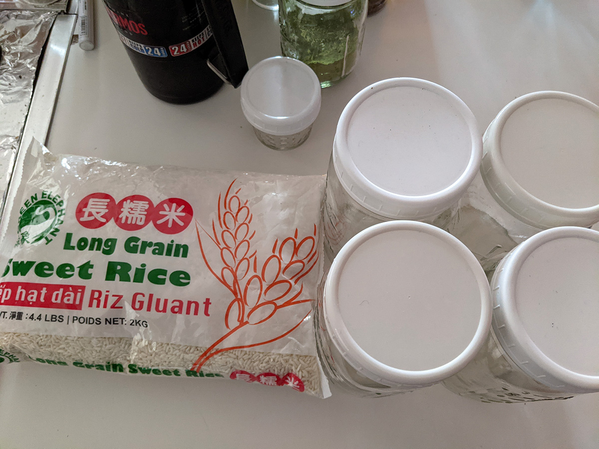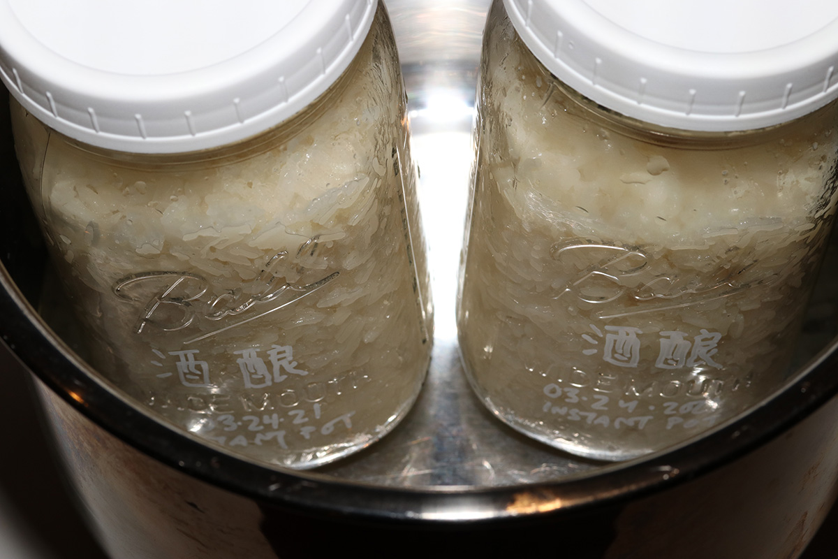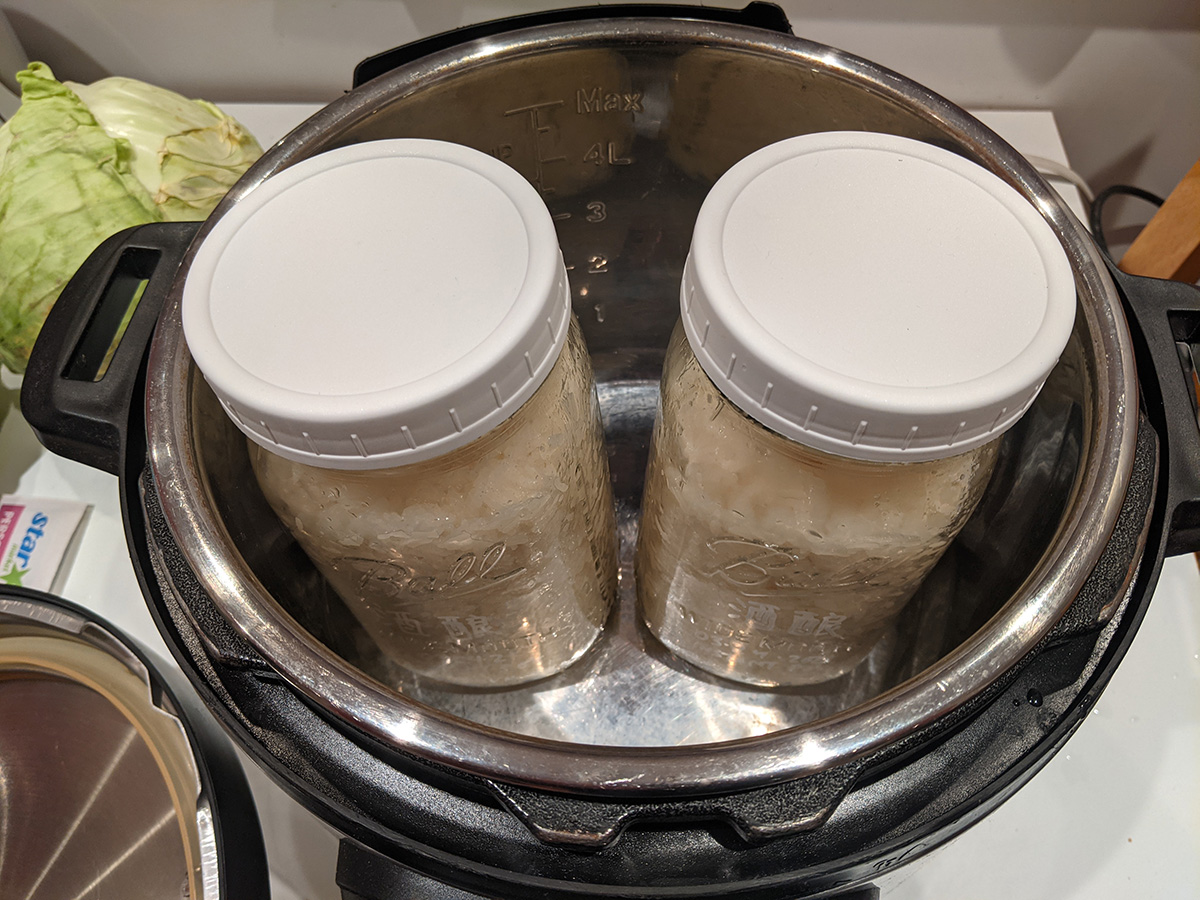 i had enough quart-size mason jars to run two batches of long-grain glutinous rice jiu niang: one using the slow ferment method, the other utilizing the instant pot for a heated 48 hours fermentation. the goal is to not only test for sweetness, but also in the case of the instant pot to see if i can purposely induce the fermentation to produce wine. for this experiment i used the old-fashion ball jiu niang yeast ball. in my experience they produce more alcohol than the angel rice leaven powder. i cooked two batches of rice, 2 cups rice with 2 cups water. only later did i realize i could've simply cooked all the rice in one batch and divided them up evenly, saving me some time. the first batch of rice i kind of forgot about and left it warming for 44 minutes. the second batch i only warmed for 7 minutes. the first batch of rice will be slow fermented, while the second batch will be quick fermented in the instant pot.