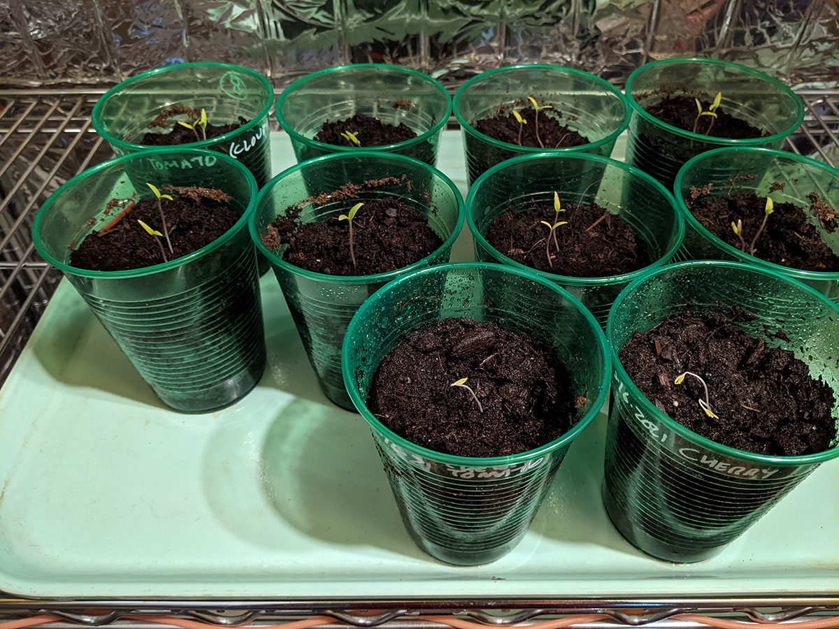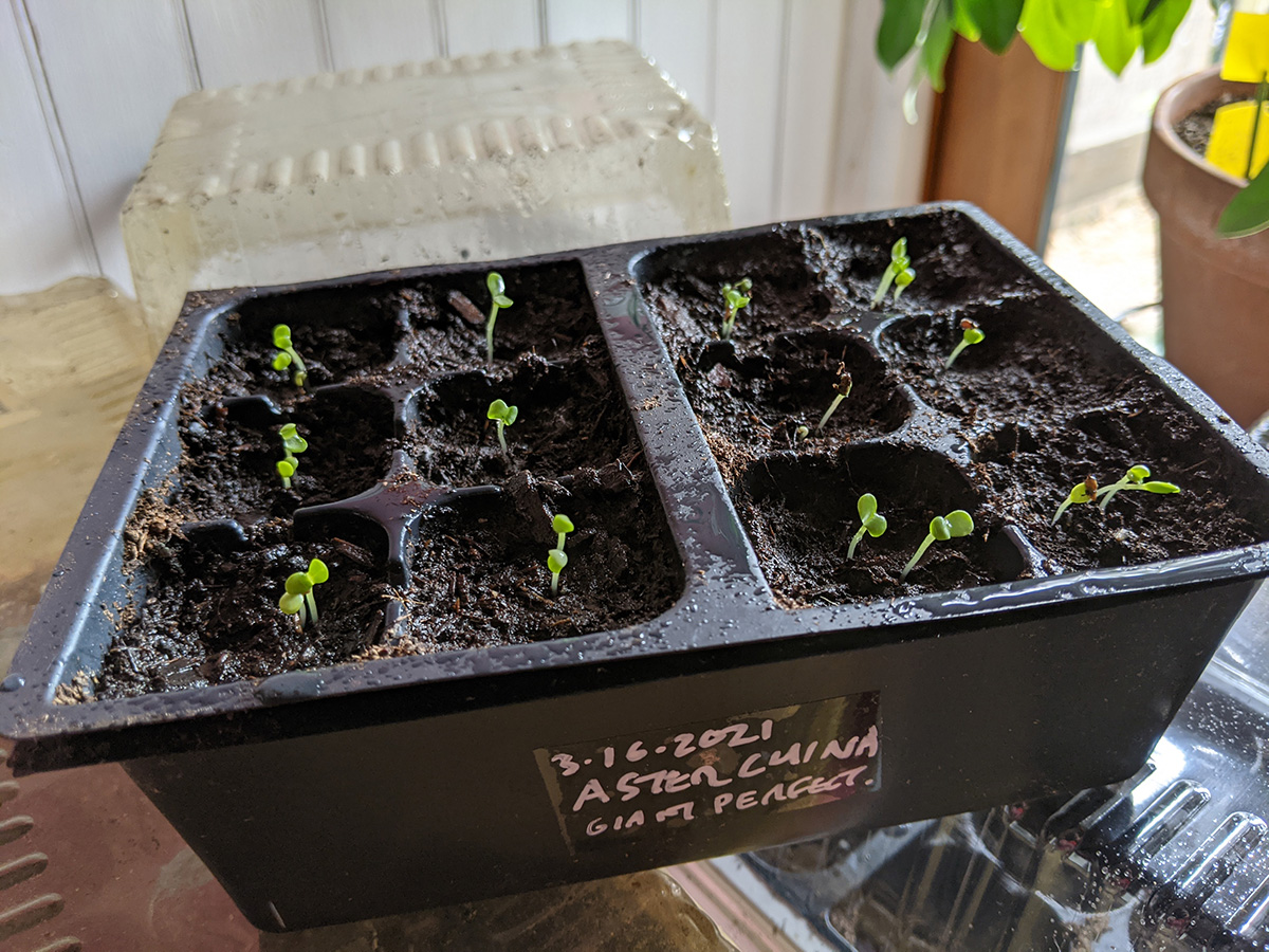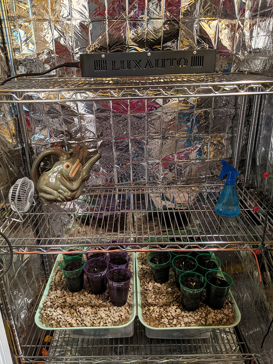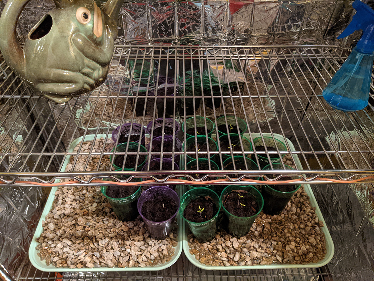 last night i noticed some cherry tomato seedlings had also germinated. this morning i moved them into the grow closet as well. hyacinth beans had also sprouted, both the new seeds and the old seeds. and i'm glad i checked my seed starter containers because the chinese asters have also germinated at 100%. i moved all of them to the grow closet. i set up two trays now, with a water-soaked gravel bed to provide moisture.
