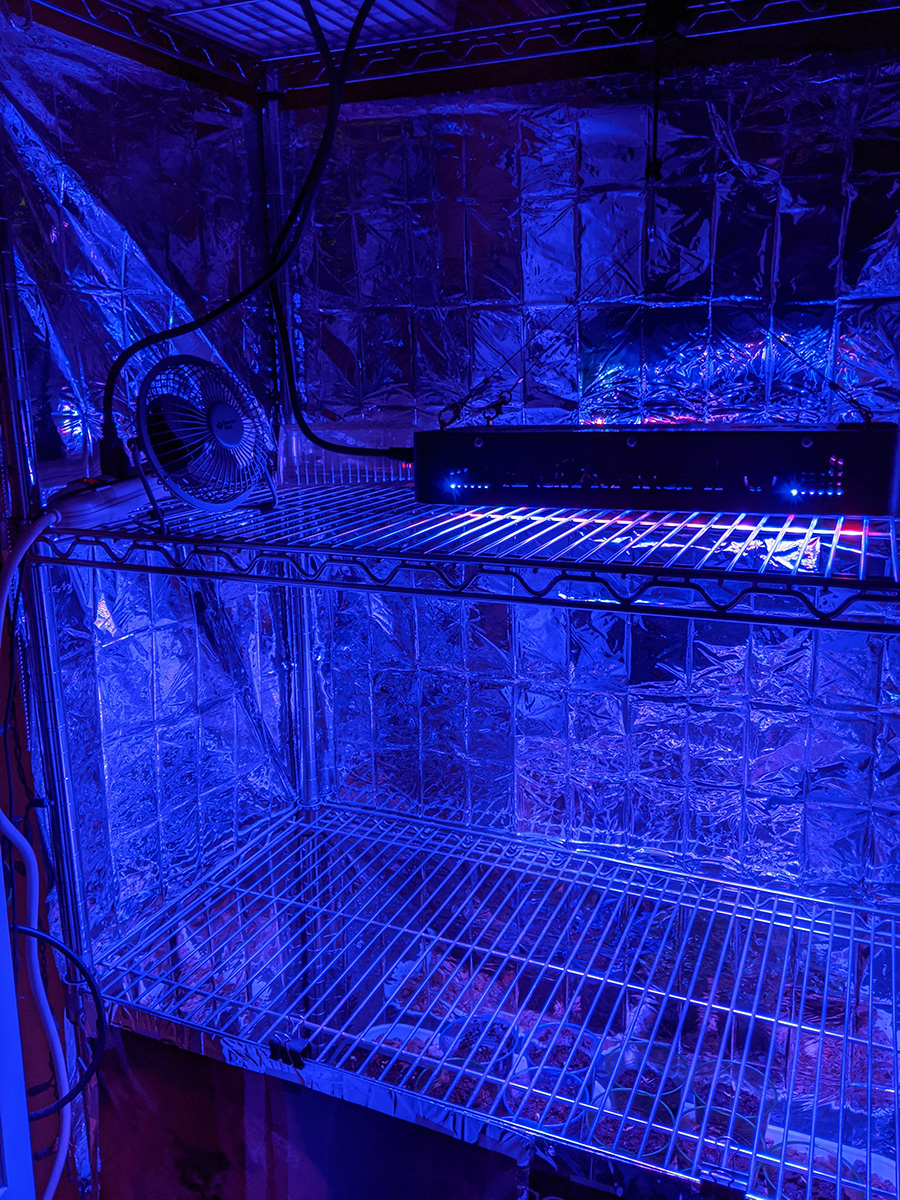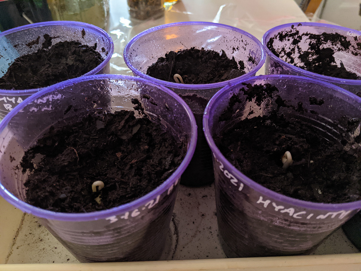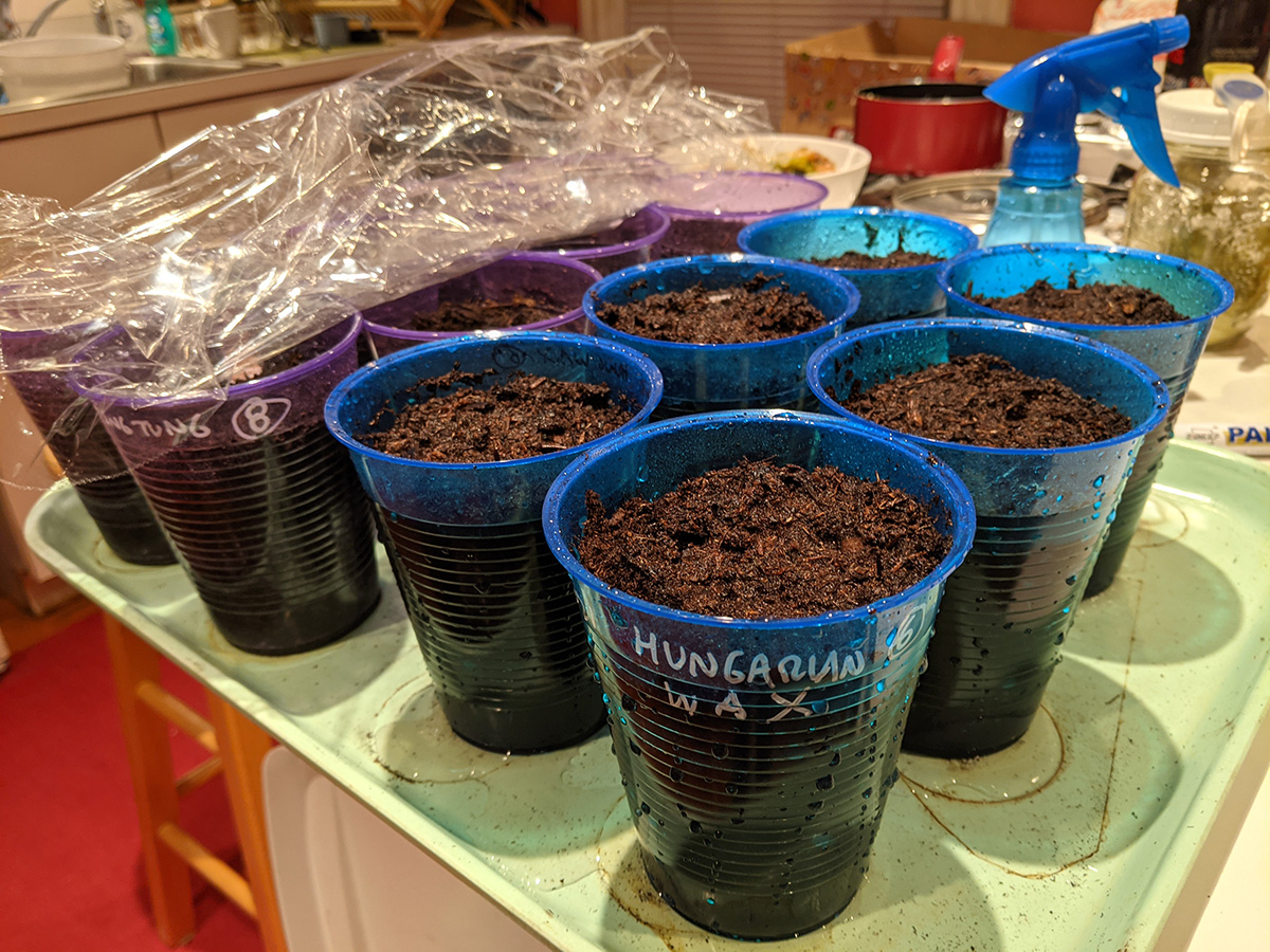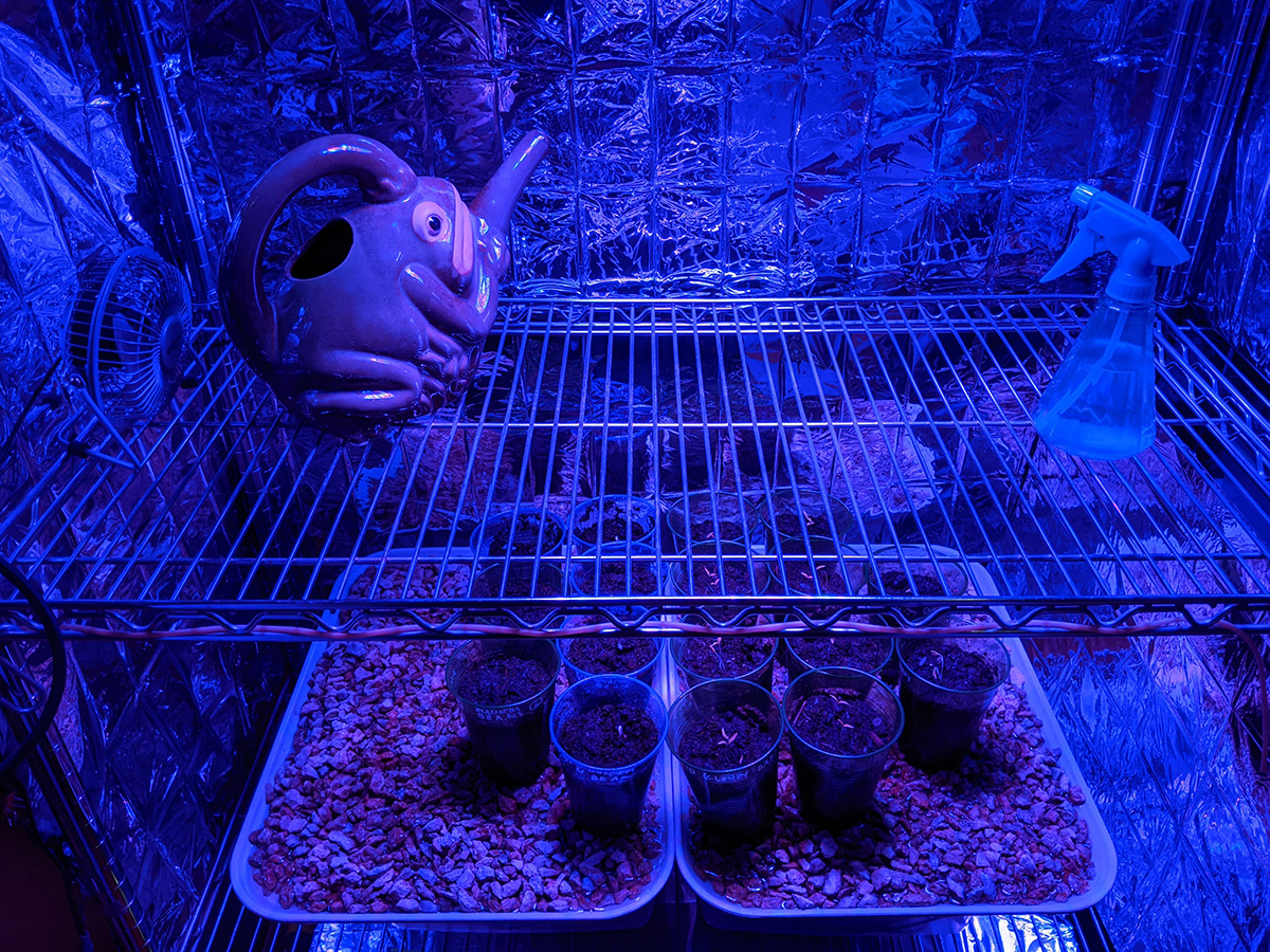 last night i noticed some cherry tomato seedlings had also germinated. this morning i moved them into the grow closet as well. hyacinth beans had also sprouted, both the new seeds and the old seeds. and i'm glad i checked my seed starter containers because the chinese asters have also germinated at 100%. i moved all of them to the grow closet. i set up two trays now, with a water-soaked gravel bed to provide moisture.