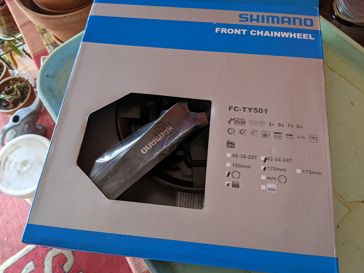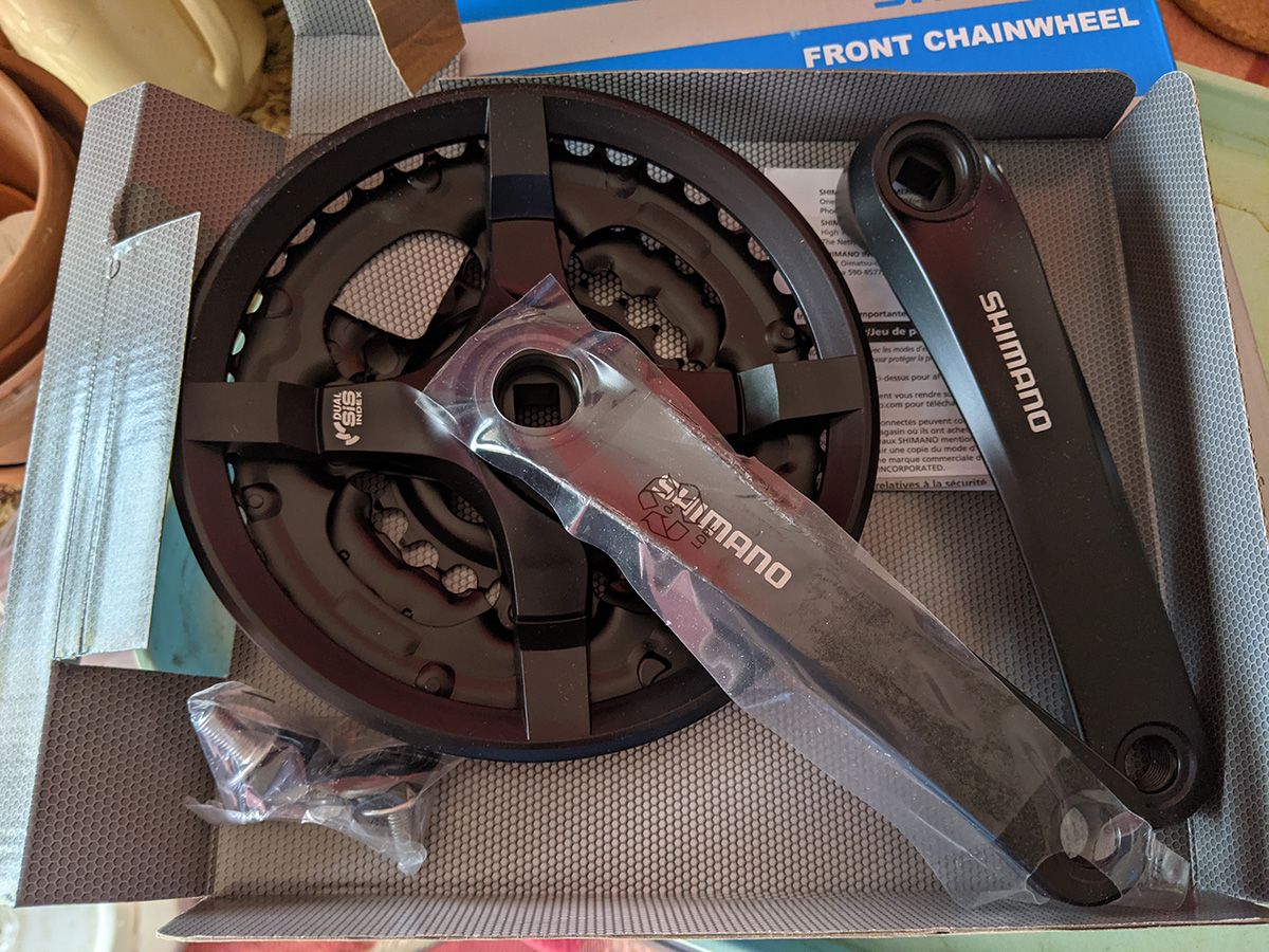 my new shimano chainwheel was waiting on my doorstep. i opened it up to see if it included the left crank arm. at first i thought it was just the chainwheel, but when i took a closer look in the book, i found the other crank arm. i actually think most chainwheel come with the other crank arm. if not, then a lot of bikes would have mismatched cranks whenever they replace their chainwheel. getting new cranks makes me feel like getting new pedals as well. the ones that i currently have are a little beat up, and one of the reflectors even fell off.