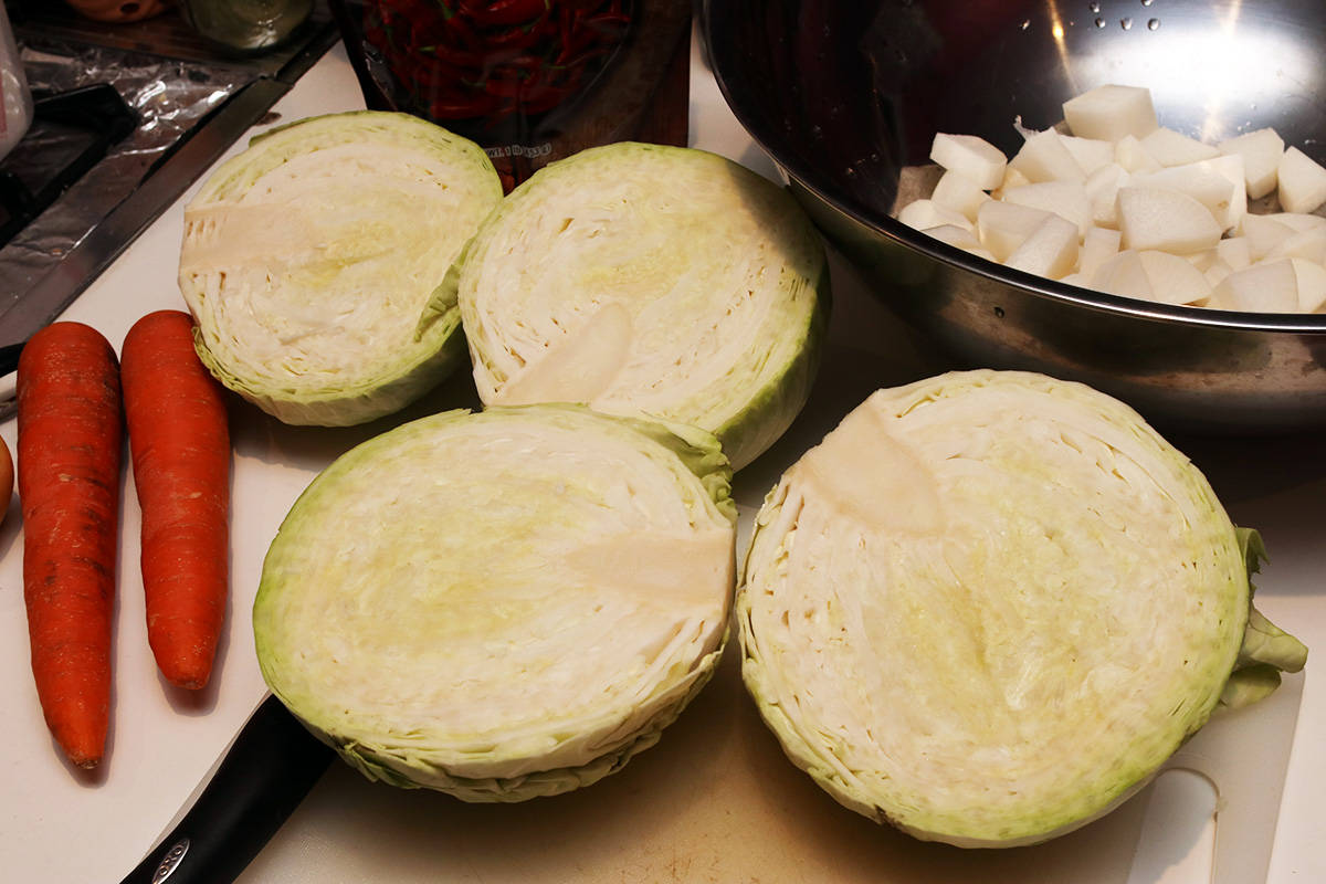 6.81 lbs. green cabbage (2x) 1.75 lbs. daikon radish 5 tbsp kosher salt