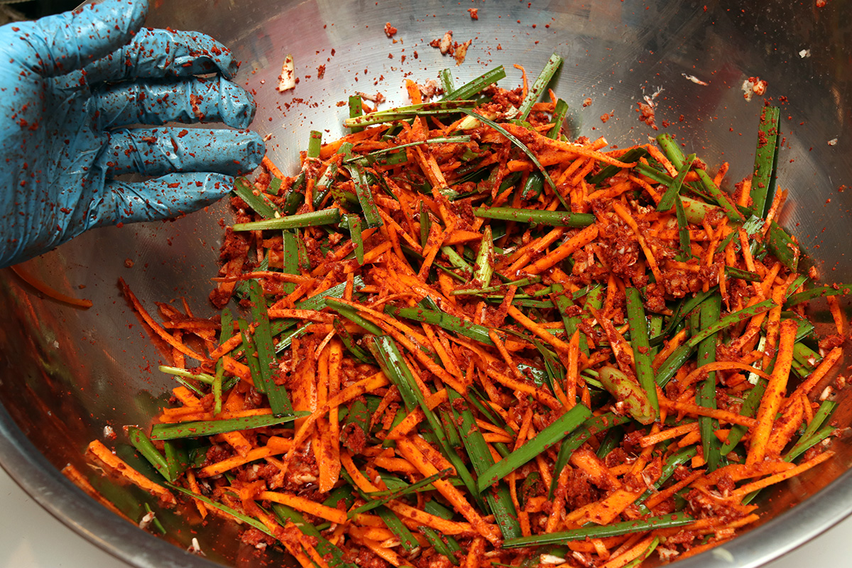 by 10pm i drained the reduced cabbage and daikon radish, and started preparing the other ingredients. using only one gloved hand (so my other free hand could take photos, naturally), i mixed all the "sauce" ingredients together before adding the reduced vegetables. instead of packing the kimchi into jars that i normally would, instead i filled a 10 cup plastic container with kimchi, saving myself some time. i did still fill up 2 jars with kimchi.