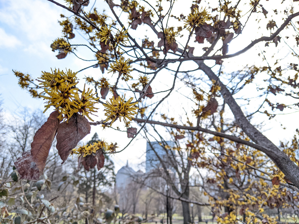 passing by the boston garden and beacon street, i stopped to admire some flowers. there were witch hazel in the garden, i was smell the fragrance though my mask. on beacon street some white magnolias were in bloom. seems a bit early, but these particular trees have full sun all day.