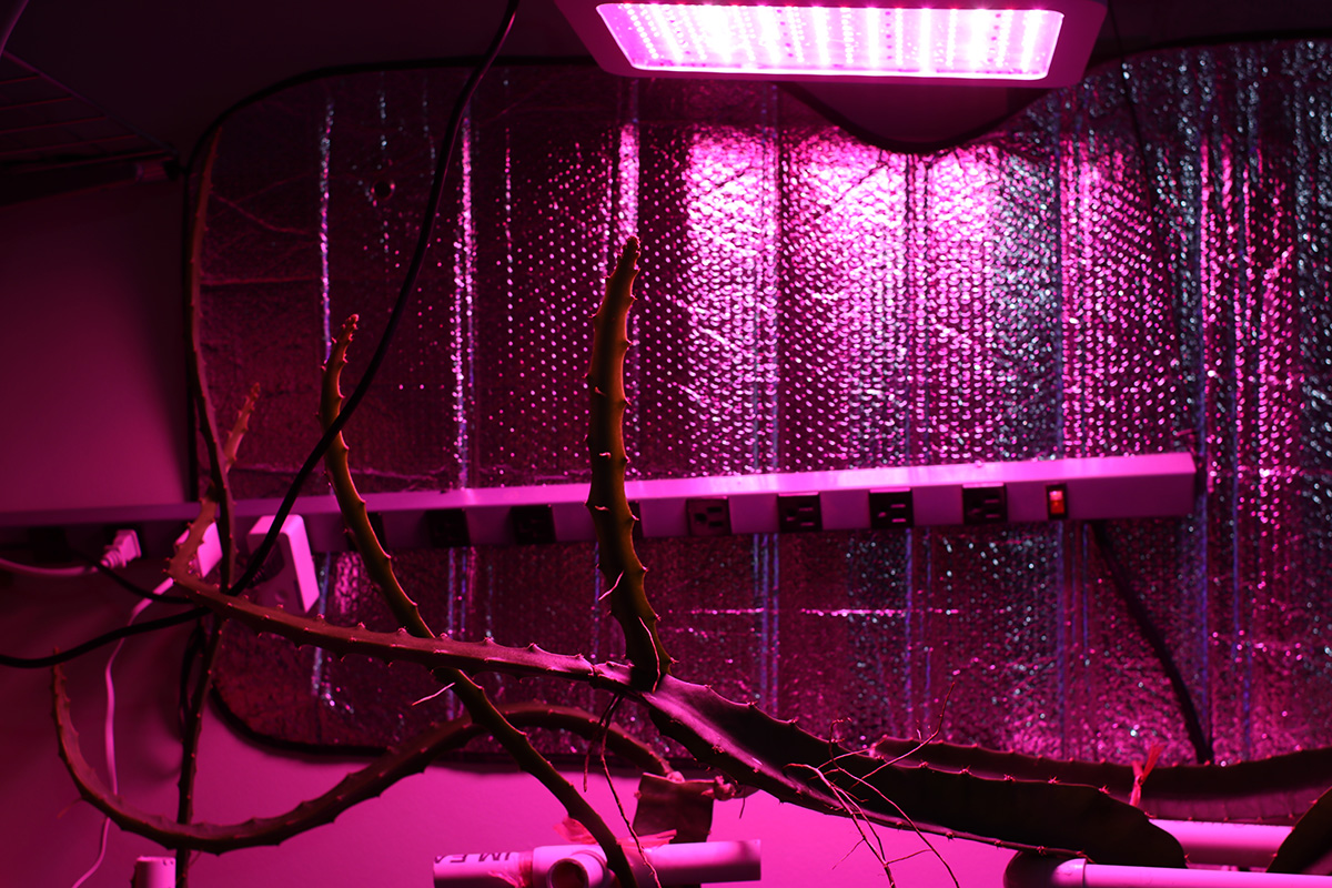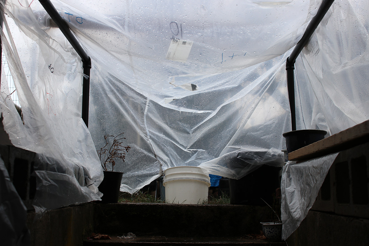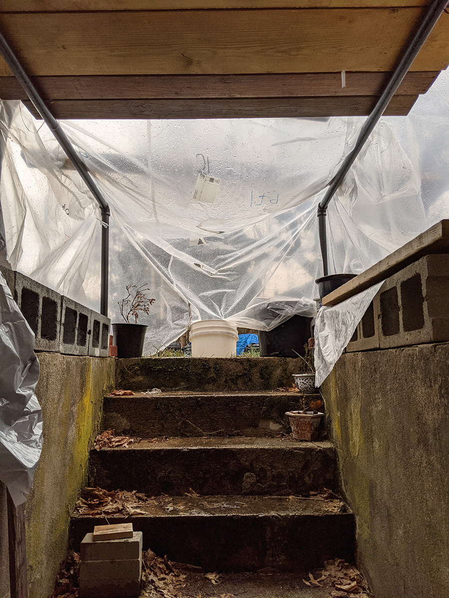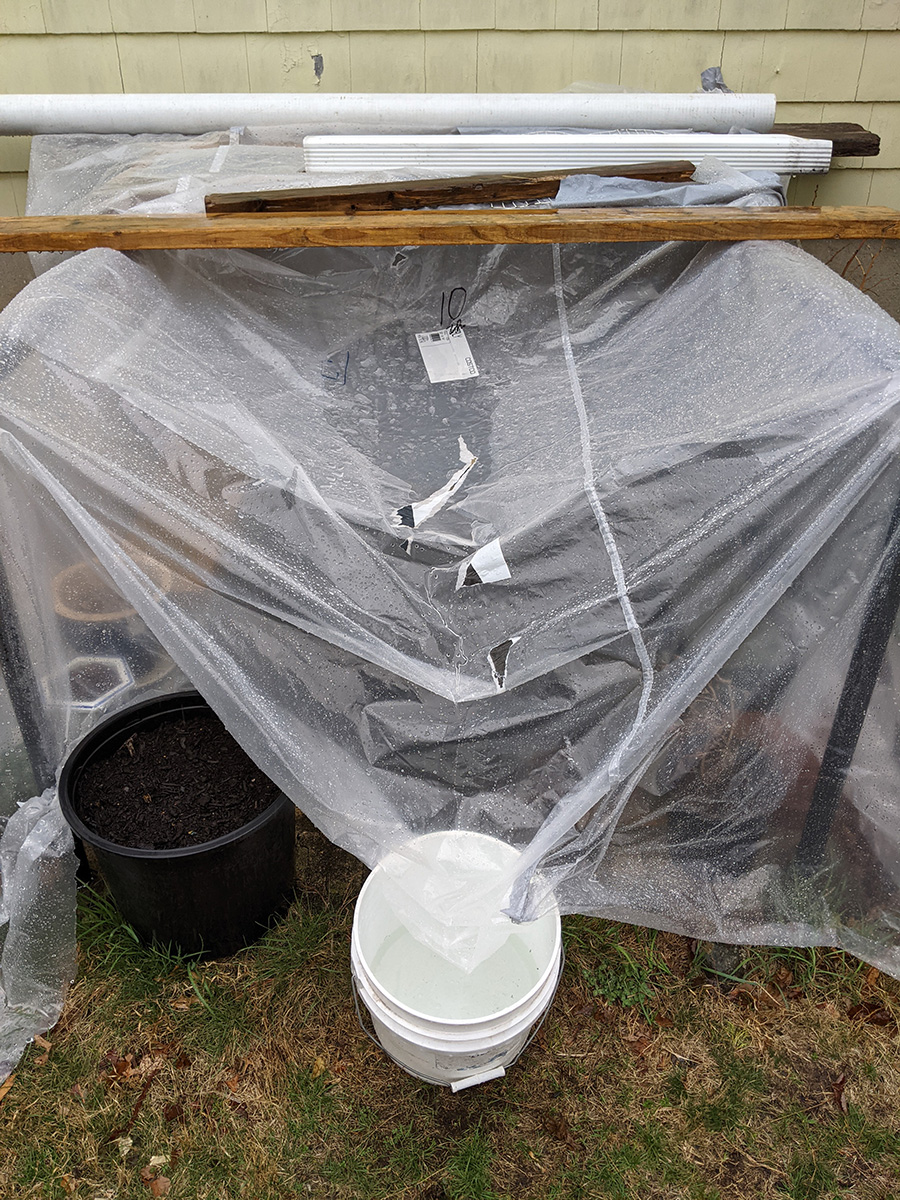 later in was in the basement doing my weekly weekend plant maintenance. first i swabbed any mealybugs i saw with alcohol. then i sprayed any additional areas with neem oil. finally i watered the plants with some mosquito bit-soaked water. since it was raining out, i figured i could fill a bucket with rain water if i just left it out in the backyard. but the plastic sheet my father had placed over the basement entrance managed to funnel all that rain water into a central location that i could then collect with a bucket.