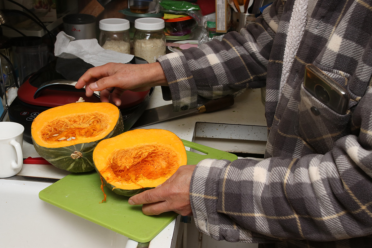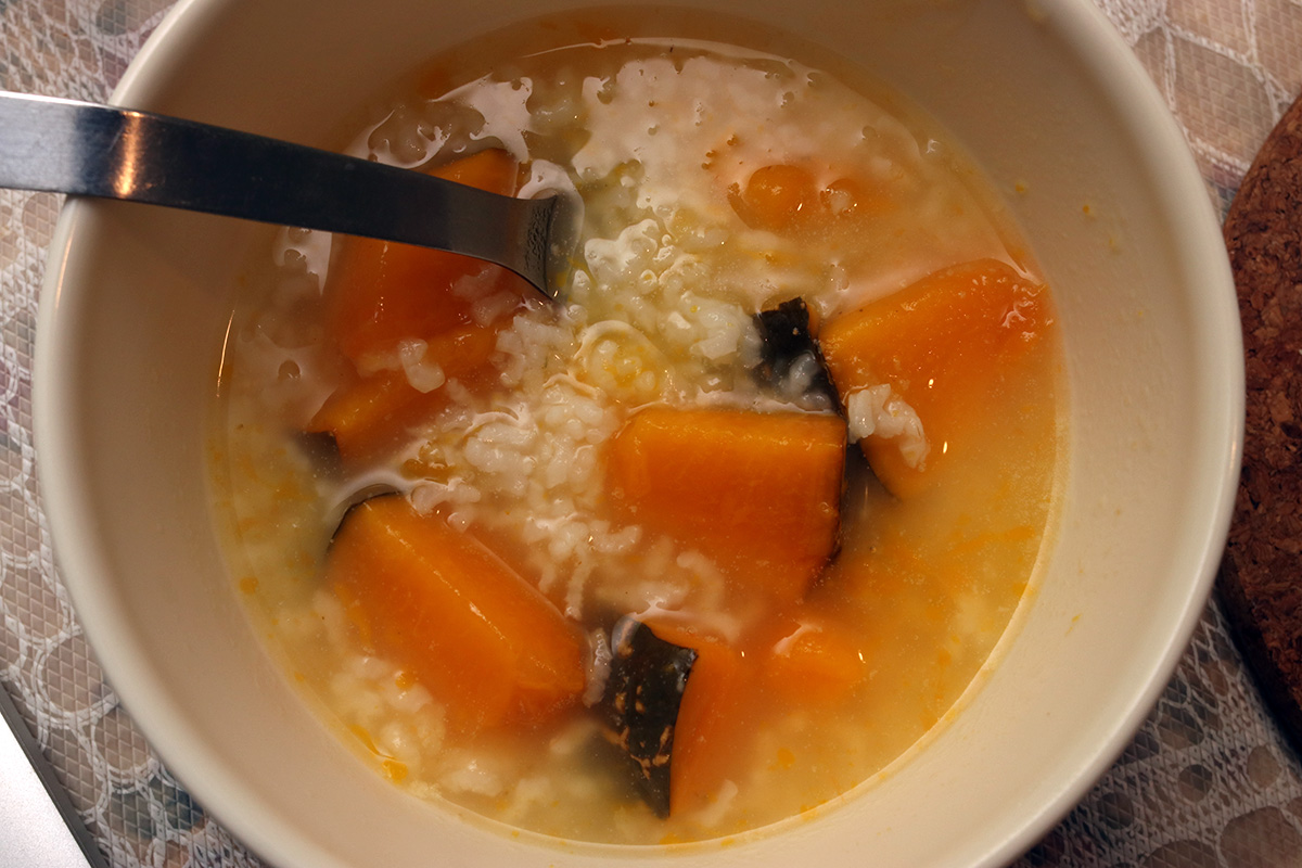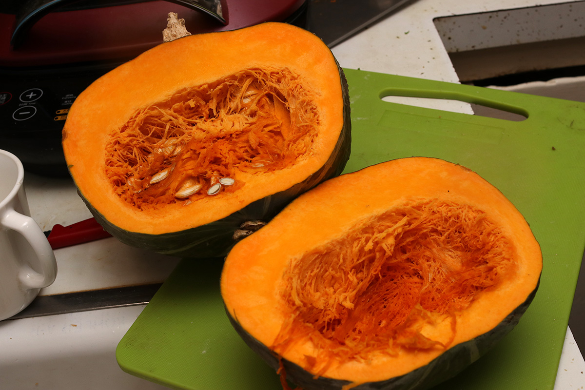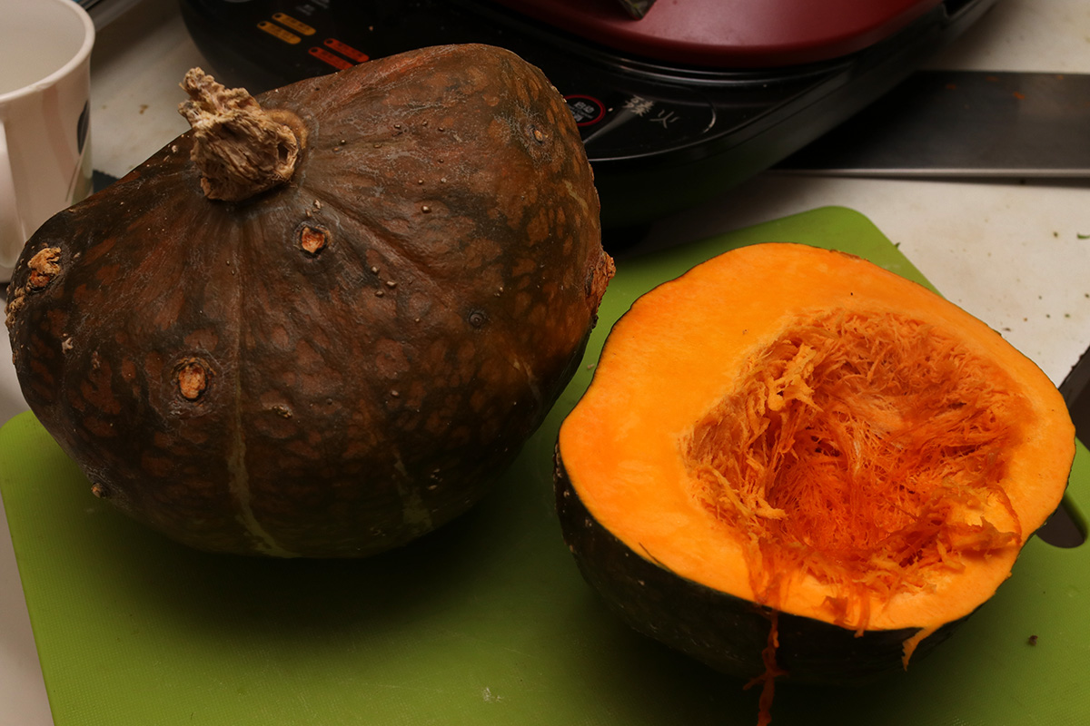 in the late afternoon my father cut up the last of our homegrown buttercup squash. even though it looked old and the green had faded on the outside, on the inside the squash was right orange and still fragrant, a miracle that it was able to keep for all these winter months. my father used the squash to make some sweet porridge. my parents also made some beef patties, cooked in the electric baking pan. we ended up eating "dinner" around 3:30pm.