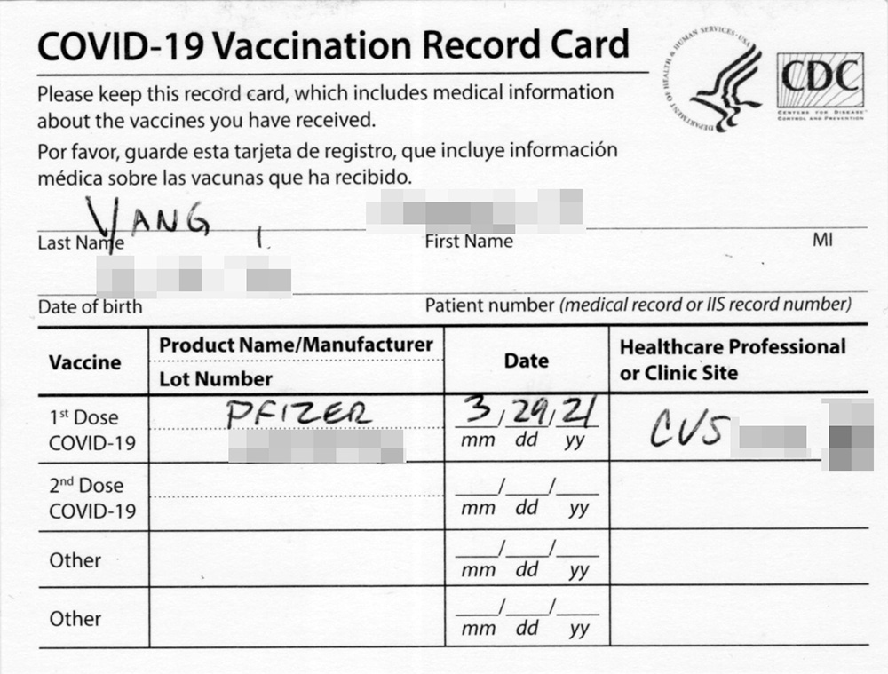 i returned to CVS by 12:45pm. alyssa looked me up on her printout of people coming in for a vaccine today and i wasn't on the list. she said in that case i had to register first at the pharmacy at the back of the store. i waited in line and turned it was the wrong line, the pickup line, where i should've been in the dropping off line. when i finally spoke to the pharmacist, she tried to enter my insurance info into their computer but there was something wrong with my insurance and it took her 10 minutes before she finally managed to put me in their database. i then went back to the front of the store to wait to speak with alyssa. she was going on her break and a man checked me in. he filled out a covid-19 vaccination card with my name, my birthday, and the type of vaccine and lot number i was receiving. i then waited in another line to be called by the nurse to get my shot. i took off my jacket and my shirt.