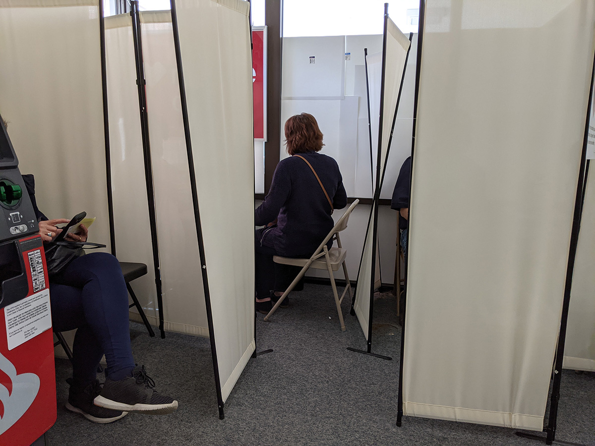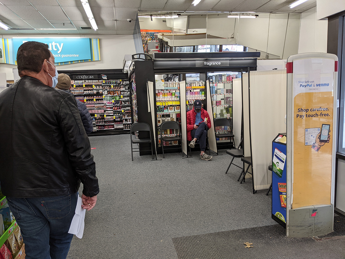 when i went in i saw a crowd of people sitting in close proximity to one another, shielded by fabric barriers. later did i realize they weren't waiting for their vaccine, they'd already gotten it, and were waiting the 15 minutes to make sure they didn't have any allergic reactions before leaving. inside of a tented area were two nurses administering the vaccine. the whole area seemed very makeshift, just a 12x18ft unused corner of the store. there was a young woman named alyssa behind a podium, and i checked in with her. i was actually there early, 12:30pm, and alyssa told me she couldn't check in me until 15 minutes before the appointment.