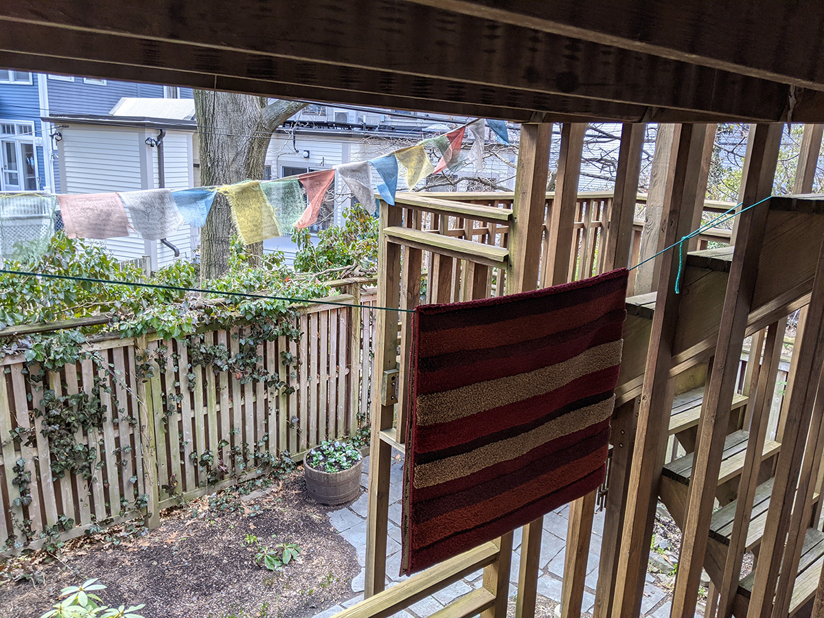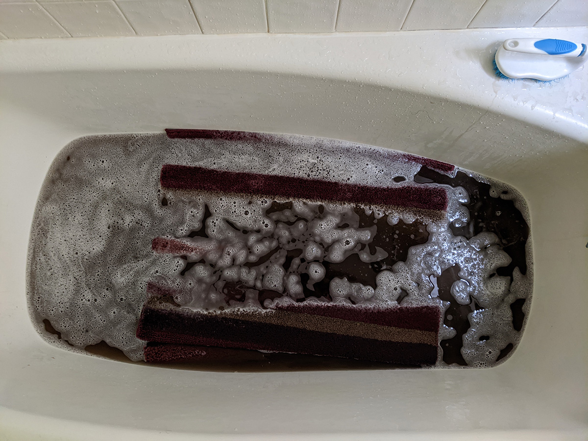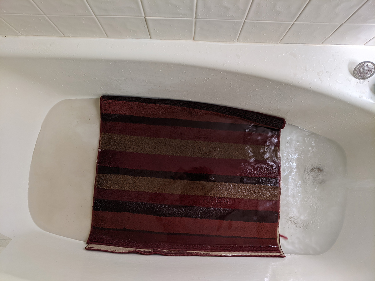it all started this morning when i decided to wash the rug from my foyer. caked in salt and mud, vacuuming wasn't going to work, it needed a deep wash to get rid of all the grime. i got that rug from marshalls a few years back after an extensive search. it's so old that the rubber backing underneath has started flaking off and turning into powder. so i had to wash carefully, to prevent more peeling. it'd be a lot easier just to get a new rug, but it's got sentimental value. after shaking the run outside to get rid of the dirt, i soaked it in the bath tub with some hot water and a scoop of oxiclean powder. the water was coming out black. after draining, i rinsed it again in hot water, the water was now dark brown. i kept repeating until the water came out relatively clear. i think hug up the rug in the backyard to dry. it'll probably take at least 2 days, i'm not in any hurry.