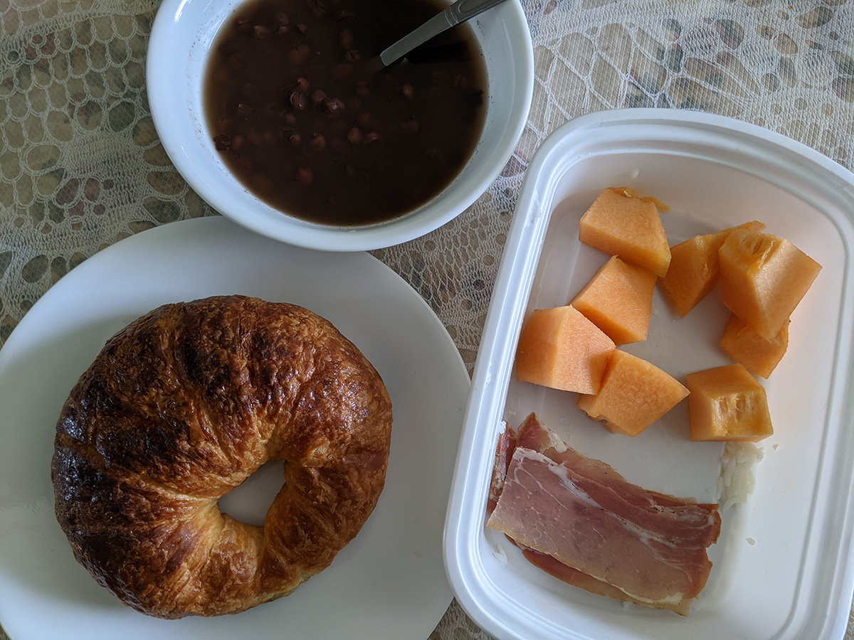though today wasn't as cold as yesterday, it was still a cold day, with temperature in the 40-50's. i brought a bag of flour and a box of mandarins to belmont. for lunch i had a croissant, some adzuki bean soup, and some melons with prosciutto.