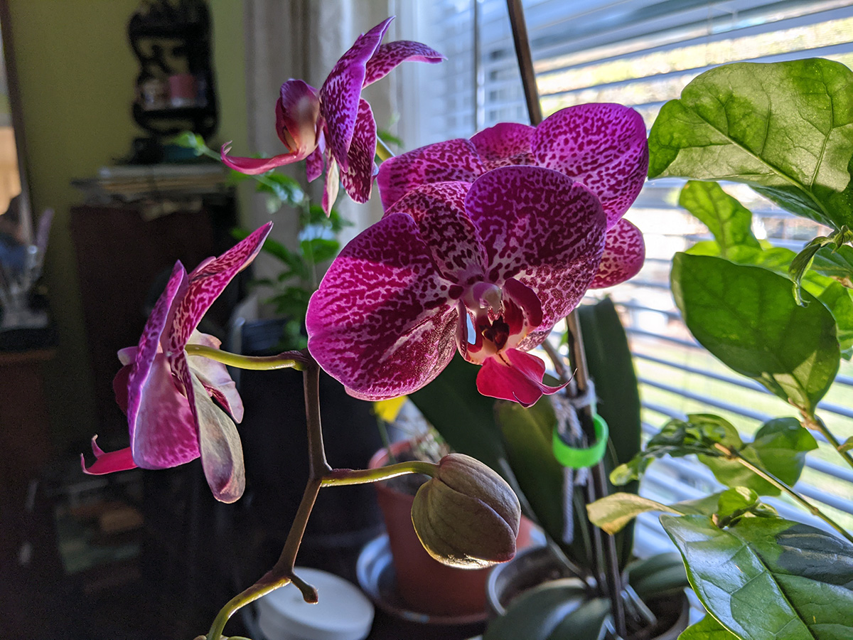 not much going on this saturday. it was cold but sunny, perfect solar weather, and today we broke 50kWh for the first time this year, at 51.472 kWh. i brought an orchid into the bathtub and sprayed it with neem oil when i noticed some mealybugs. my father and i noticed our opposite door neighbor's Prunus mume were blooming. these seemed to be the pink "peggy clark" variety. we were wearing masks and the neighbors noticed we were poking around their front lawn so we didn't get a chance to notice any fragrance.
