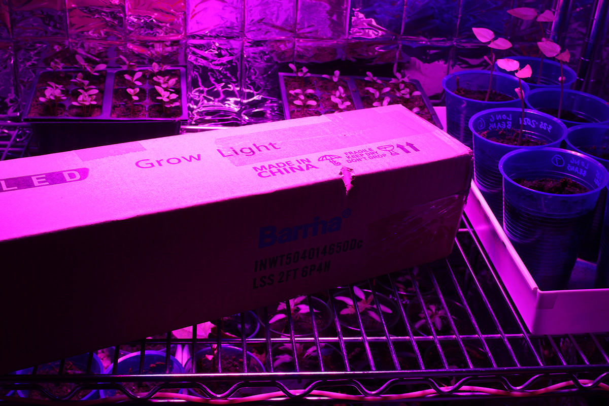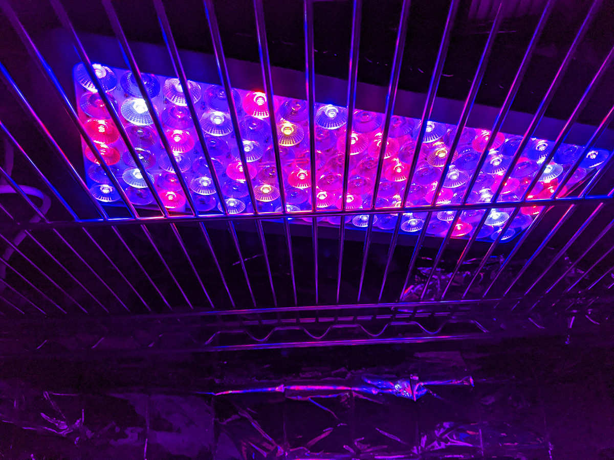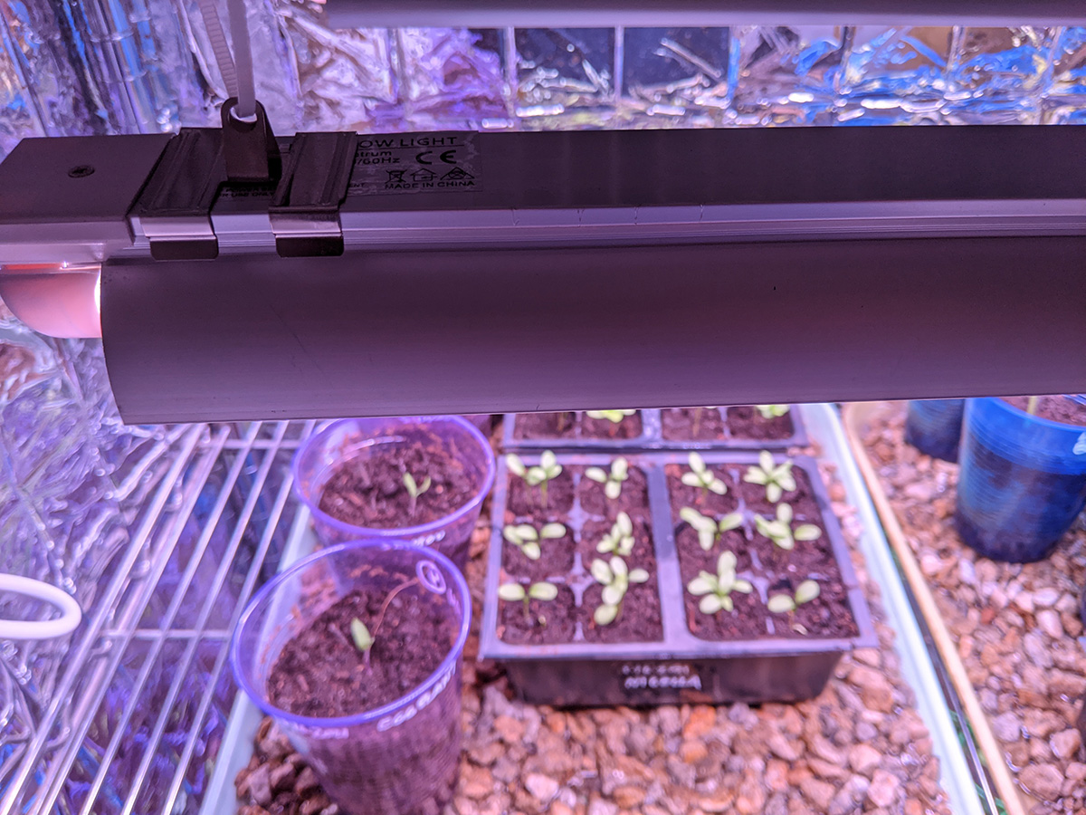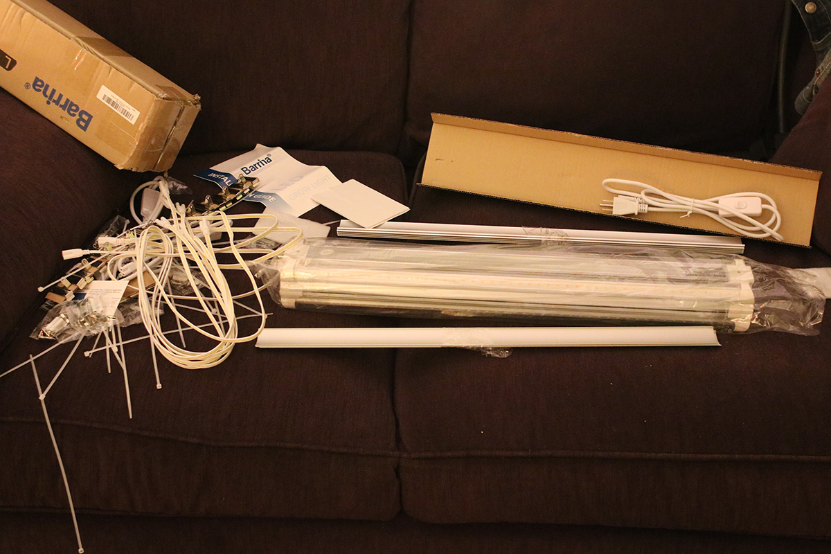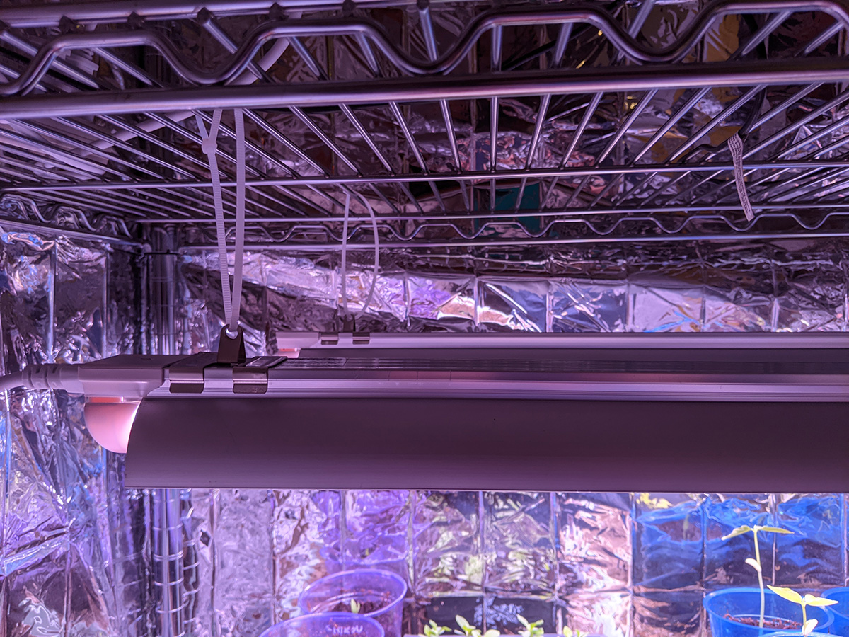 i immediately set up the new grow lights when i got back home. quality-wise they're okay, maybe a little cheap but about what i paid for ($70). i plugged in one strip just to see how bright it was and it seemed pretty bright. these lights come with deflectors that are basically thin sheets of metal you slide into place. they could've been better designed but they serve their purpose. the lights come with various ways to mount, from screws to double-sided tape to hanging. their hanging solution is to use zip ties, but i need to find something better, more durable and adjustable.