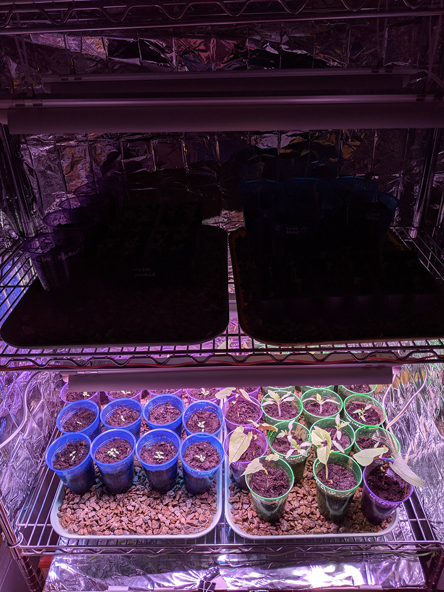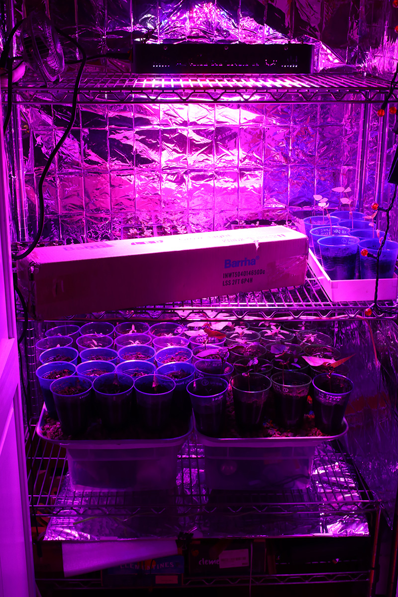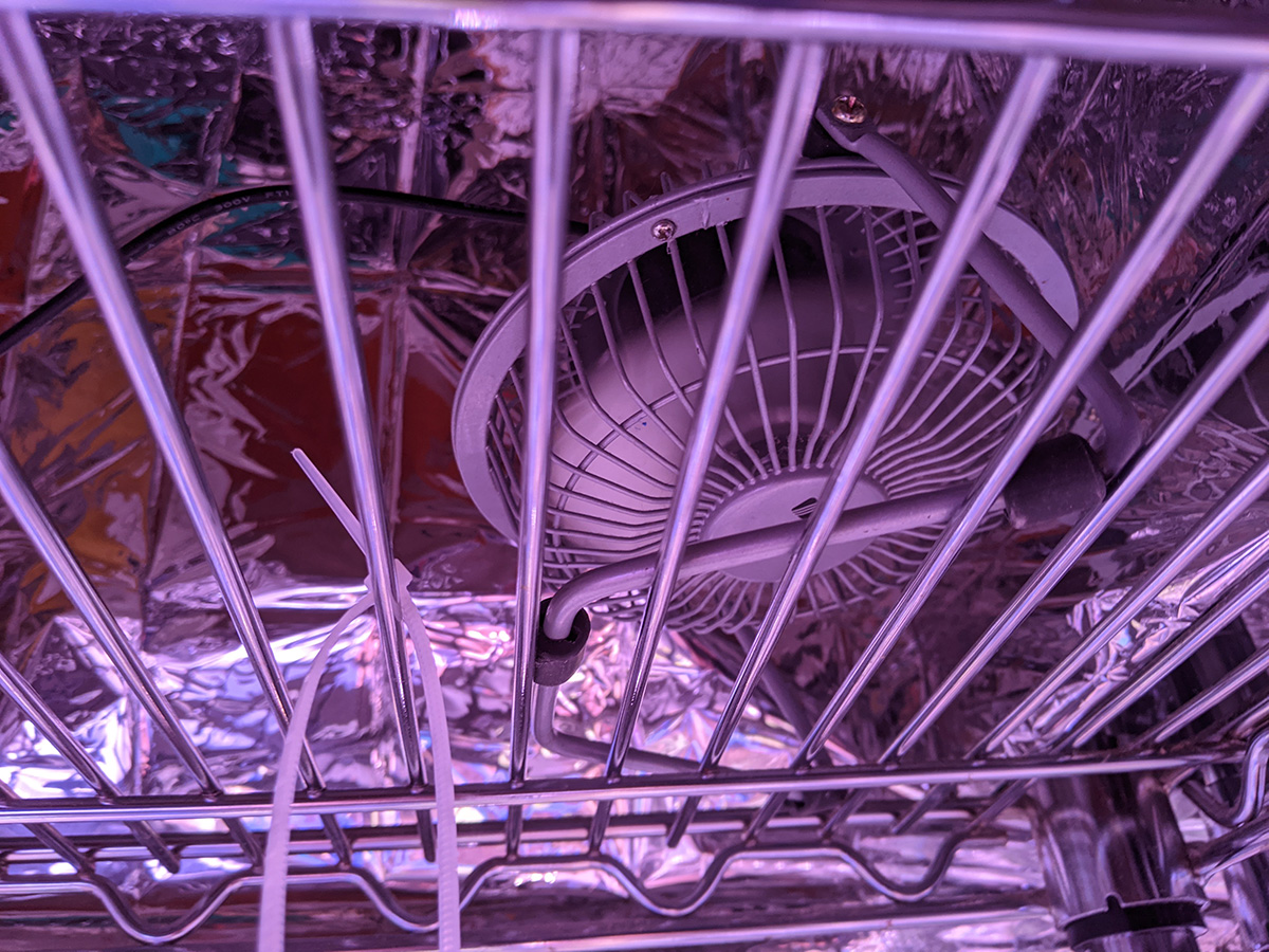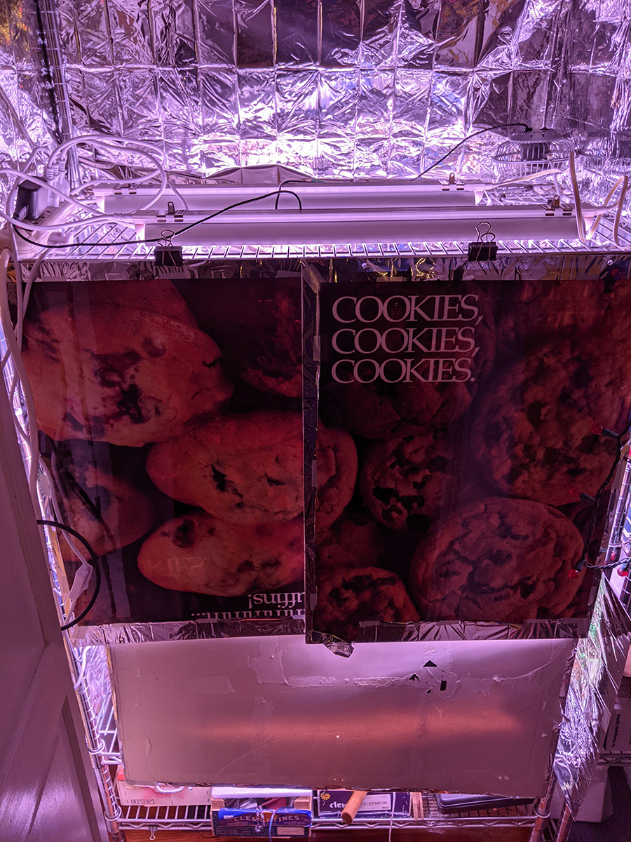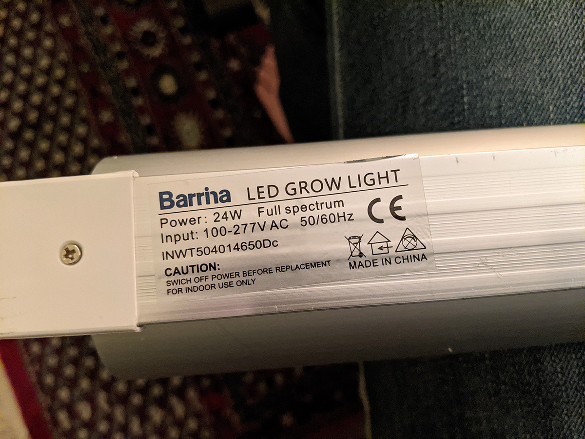 i immediately set up the new grow lights when i got back home. quality-wise they're okay, maybe a little cheap but about what i paid for ($70). i plugged in one strip just to see how bright it was and it seemed pretty bright. these lights come with deflectors that are basically thin sheets of metal you slide into place. they could've been better designed but they serve their purpose. the lights come with various ways to mount, from screws to double-sided tape to hanging. their hanging solution is to use zip ties, but i need to find something better, more durable and adjustable.