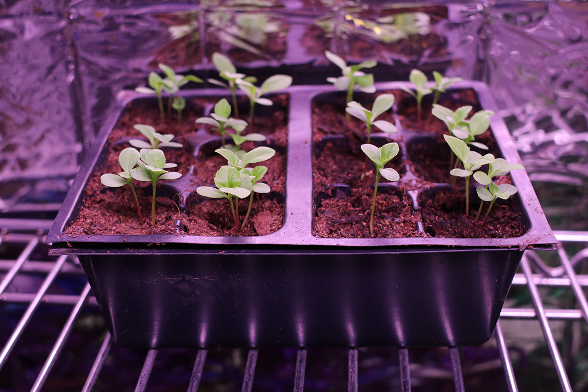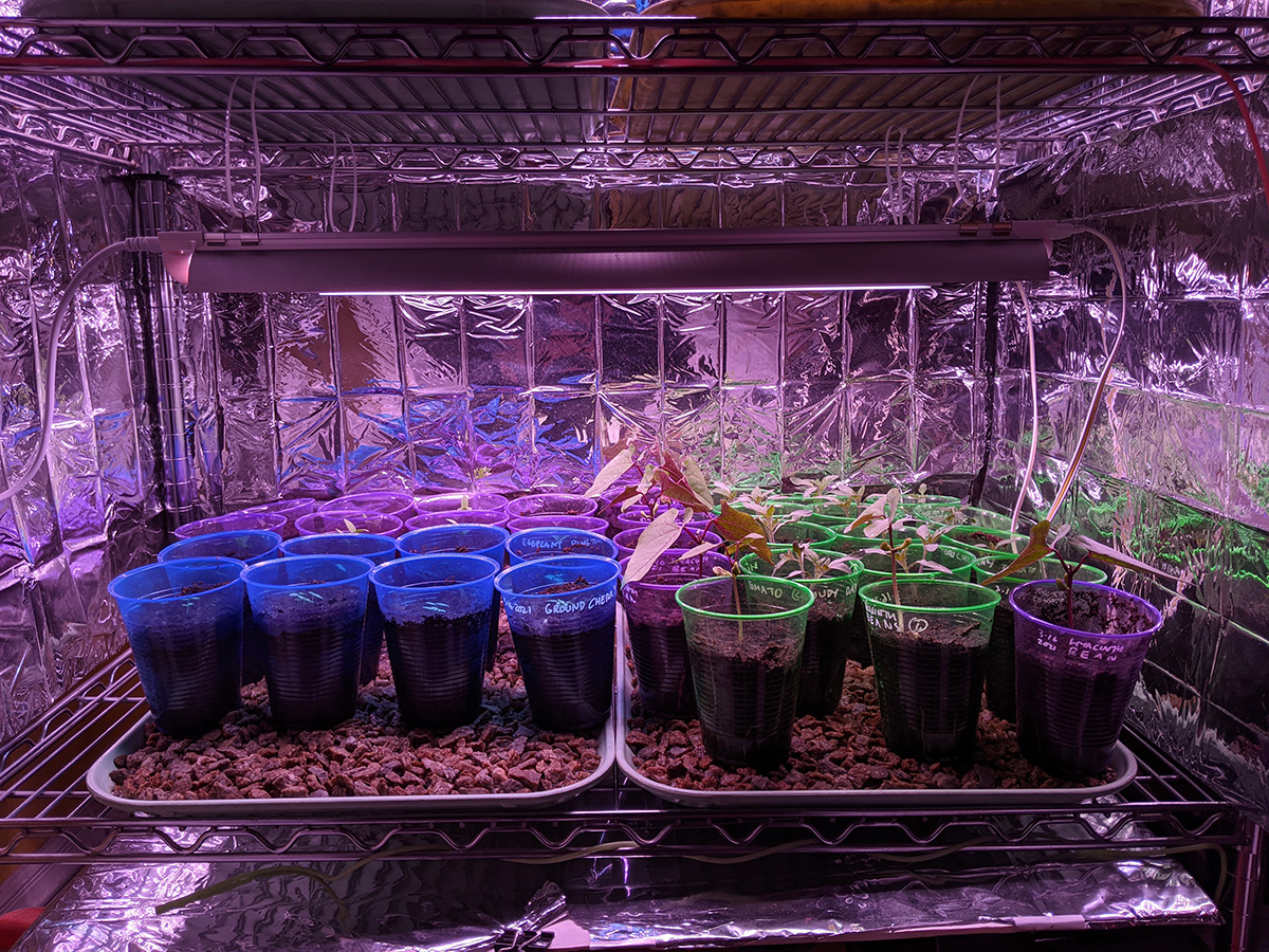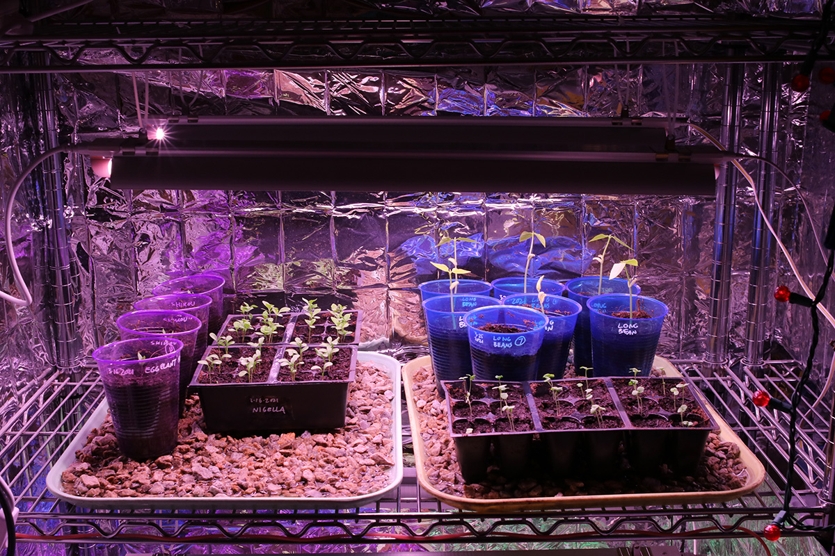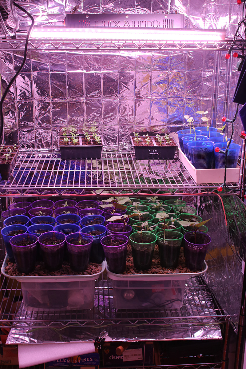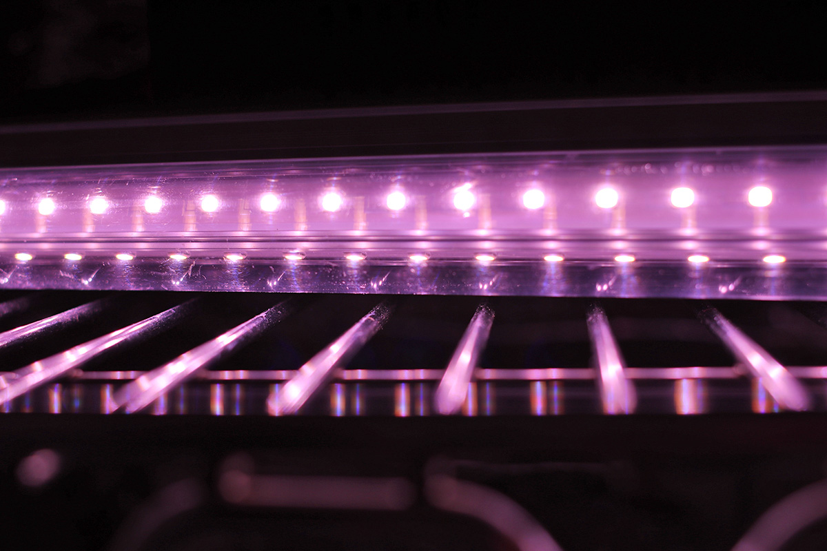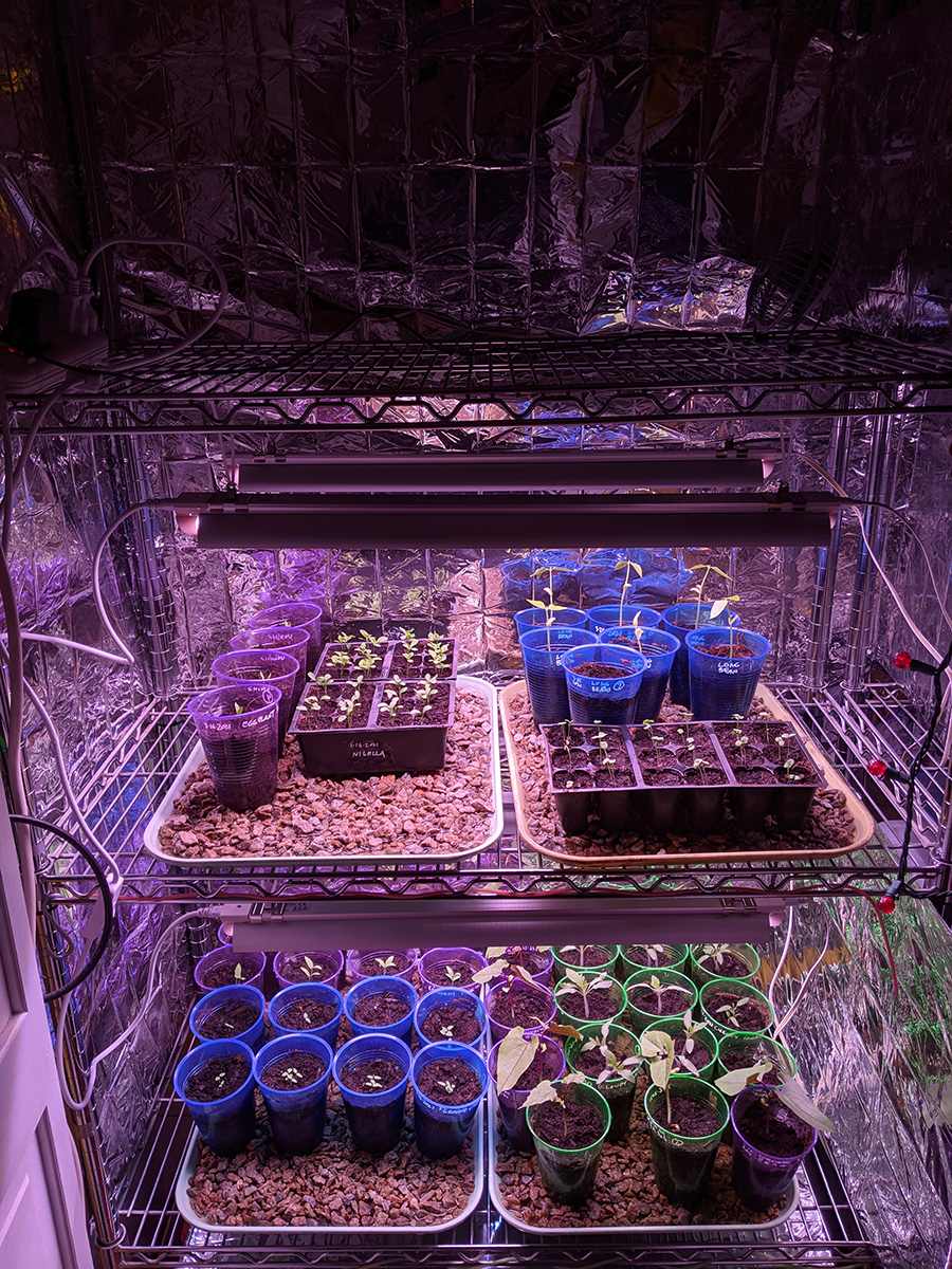 i immediately set up the new grow lights when i got back home. quality-wise they're okay, maybe a little cheap but about what i paid for ($70). i plugged in one strip just to see how bright it was and it seemed pretty bright. these lights come with deflectors that are basically thin sheets of metal you slide into place. they could've been better designed but they serve their purpose. the lights come with various ways to mount, from screws to double-sided tape to hanging. their hanging solution is to use zip ties, but i need to find something better, more durable and adjustable.