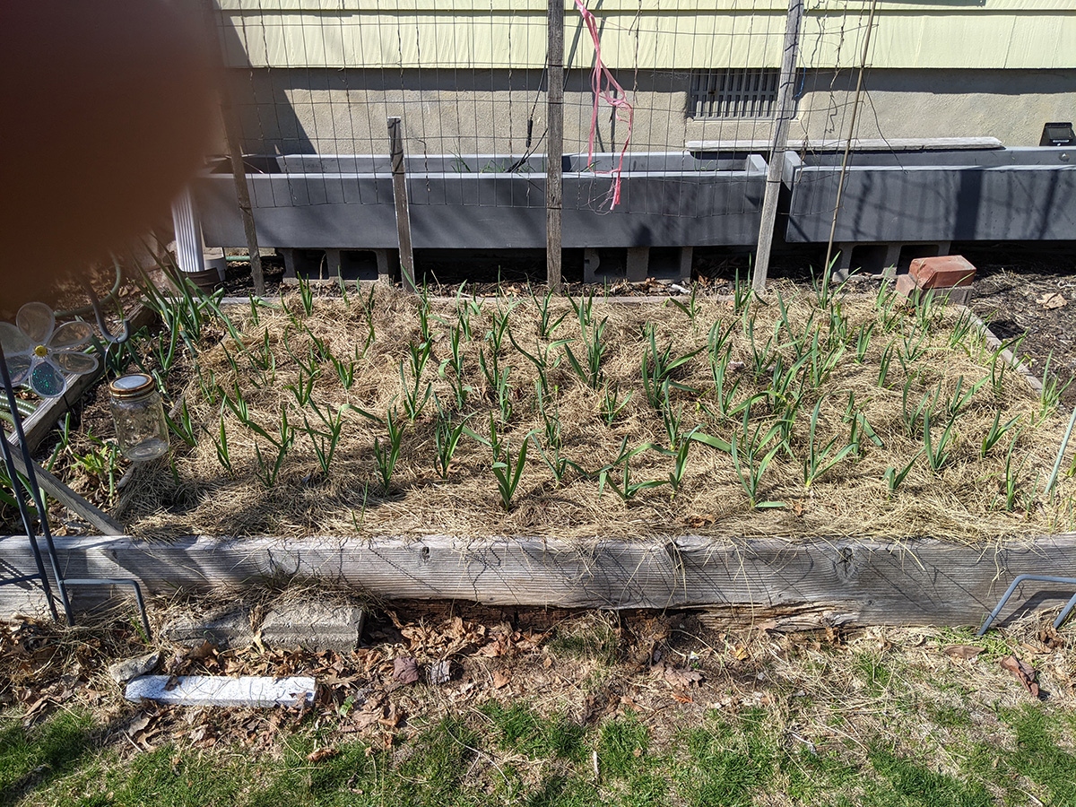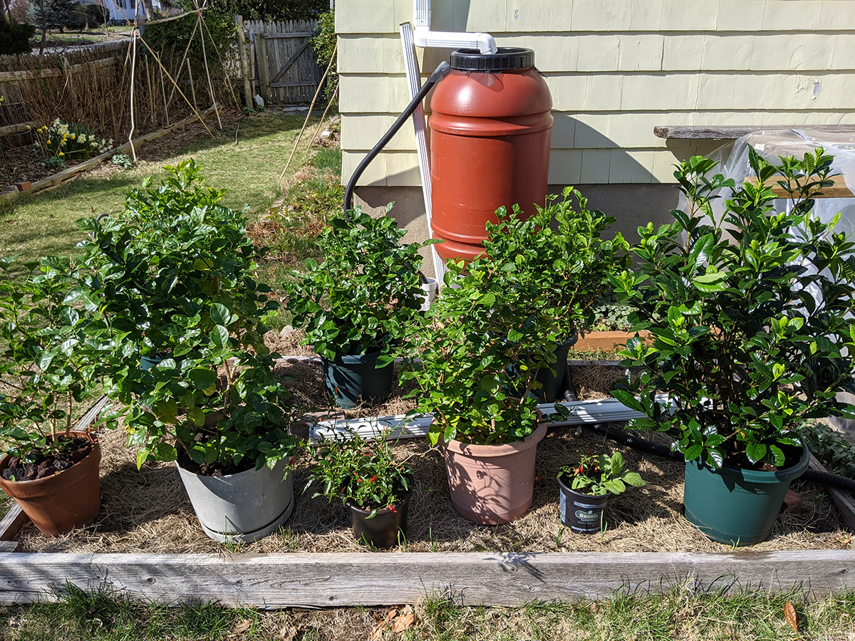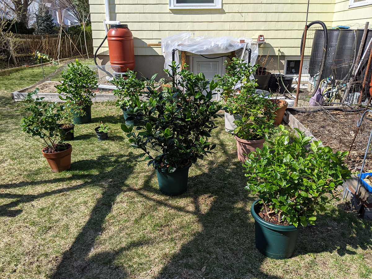 we returned home by 12:30pm, where my mother went out again, this time with my sister to walk hailey somewhere in waltham. since the temperature was above 60 degrees, my father and i moved outside all the jasmines and gardenia from the basement grow room so i could gave them a neem oil spray. my father also set up the remaining rain barrels while my mother and i were out. i wanted to do some maple tree pruning but we never got around to it. i added more chicken manure to the garlic bed. later i went online and ordered some miracle-gro soluble all-purpose fertilizer as well as special acid-loving fertilizer for the gardenia.