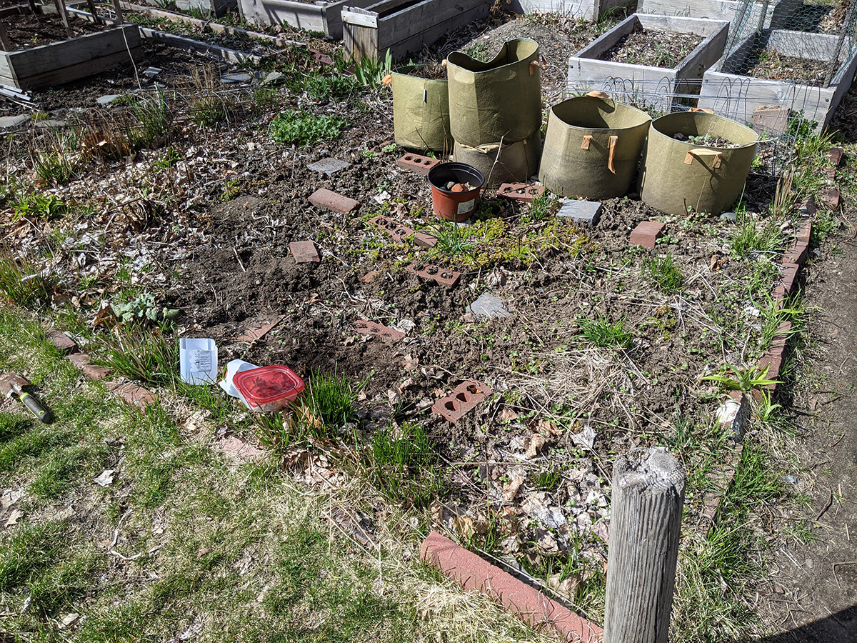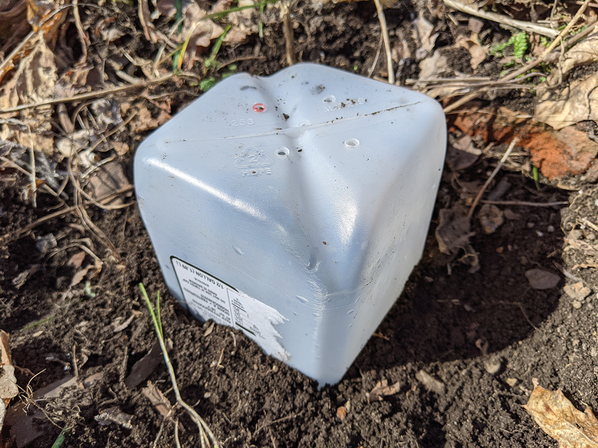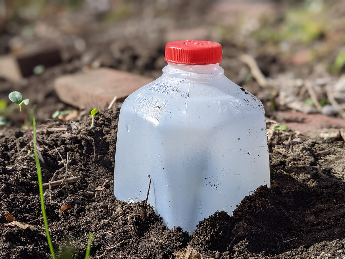 i decided to transplant my spare tomato seedlings directly into my community garden plot. i cut a half gallon milk jug in half so i could have 2 makeshift green houses to protect two of the seedlings. using a heated awl, i melted a few holes. passing by the school, there was a crowd of parents outside waiting for their kids (now that MA has mandated all public elementary schools to open). this was my first time in the community garden this year. nothing much was going on in the garden overall, just some daffodils, some hyacinths. i planted the seedlings but i'm not sure if they'll survive, though a better fate than the trash. i probably have the earliest tomatoes in the garden.