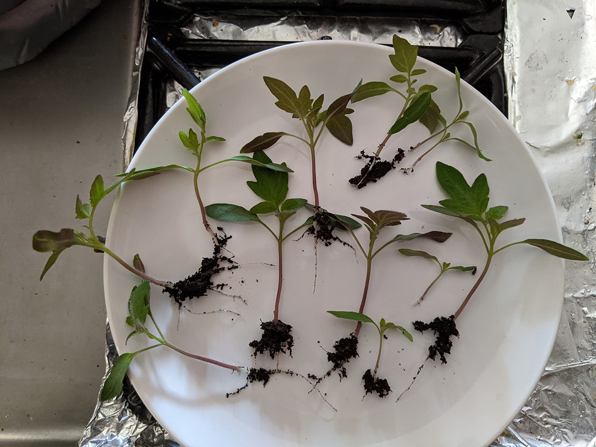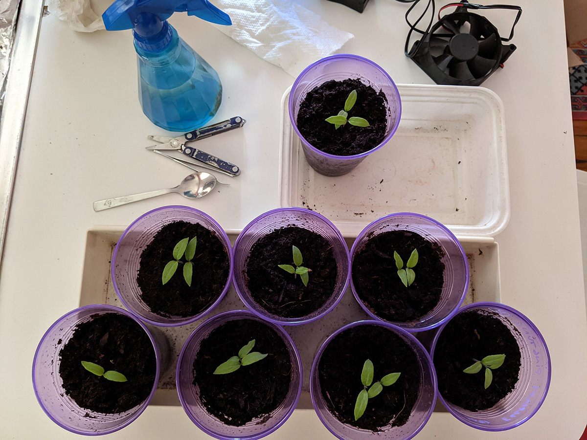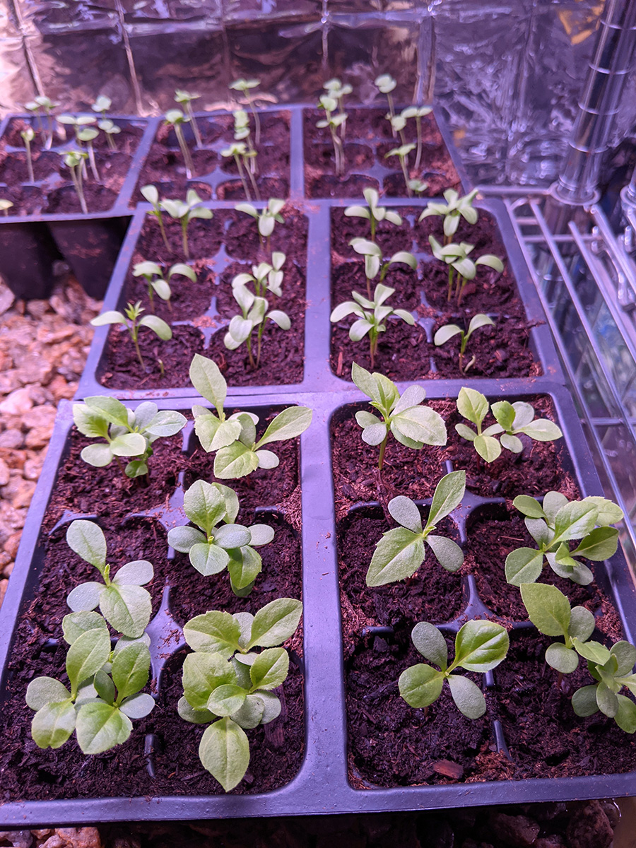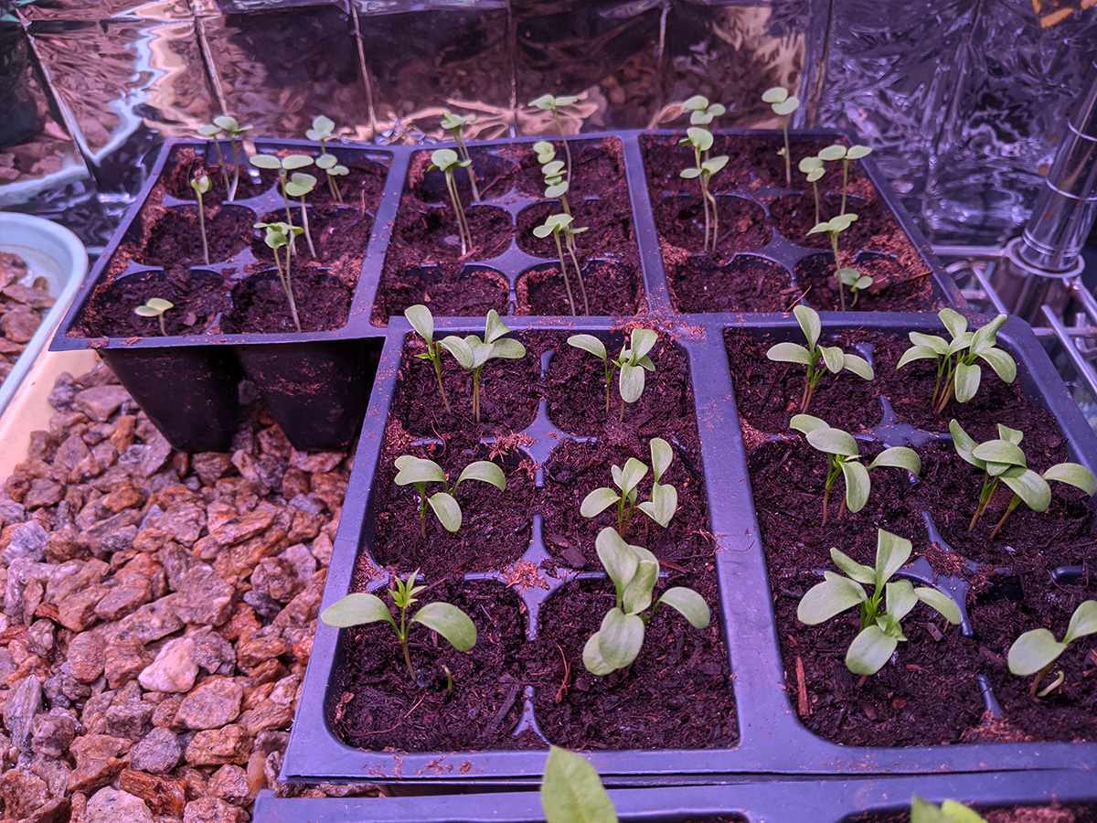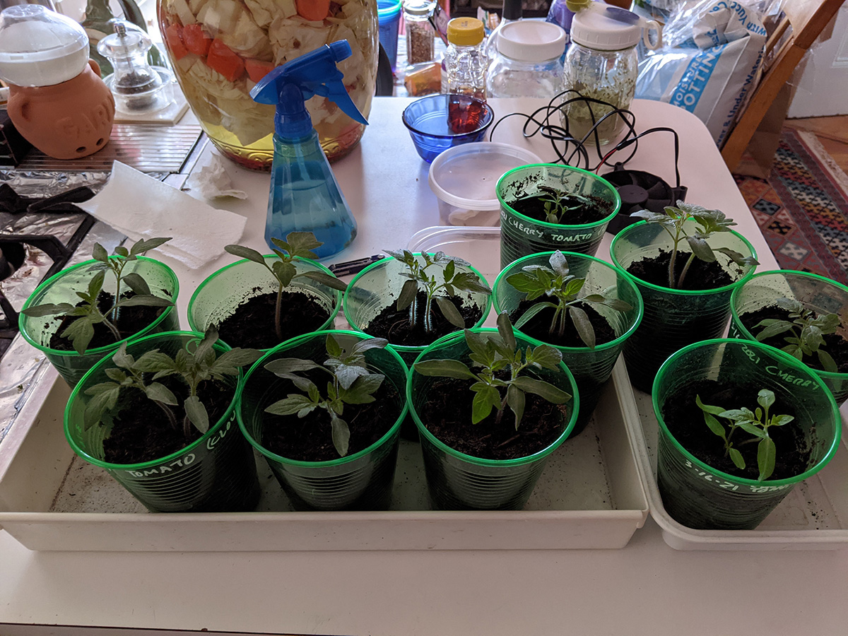 today was also the day i thinned out my seedlings: tomatoes, ground cherries, eggplants. i should've done it weeks ago when the seedlings had just emerged, but i was thinking maybe i could replant some of the additional seedlings. but now that i see i have too many seedlings. if space in my grow closet wasn't any issue i might've tried to save some more seedlings, but i need the space for other plants so i can only grow what i need, no spares. the tomato seedlings were the most developed. instead of tossing them out, i decided to save them. as for the tiny flower seedlings growing in the seed starter cells, i still don't have a strategy for them. some of them are cold hardy (like the stocks) and i feel like i can either grow them outside on the backyard deck or transplant them directly into the garden. i may transplant a few into individual pots.