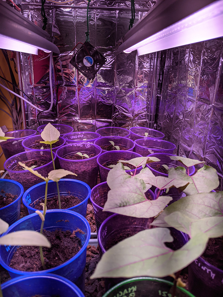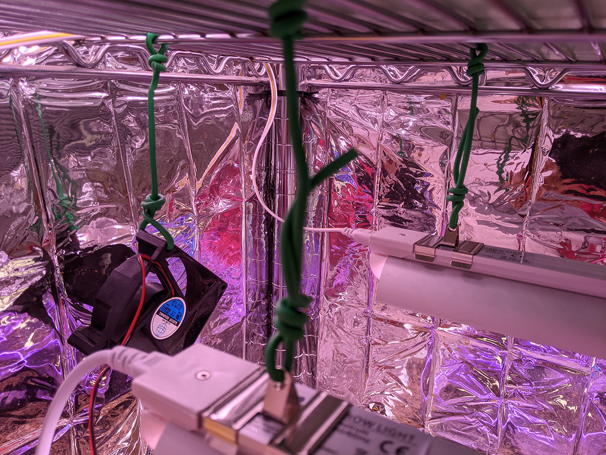 i installed the second fan in my grow closet today. i used a length of flexible tie to hang the fan. unfortunately my surge protector has a design flaw and i can't fit two flat plugs side-by-side. i ended up having to daisy-chain my led grow lights so all 6 lights use only one plug to make enough room on the surge protector to fit the two fan plugs.
