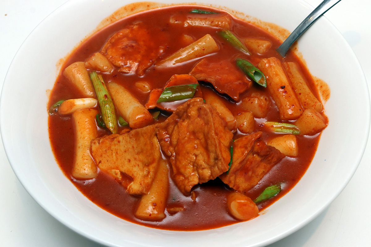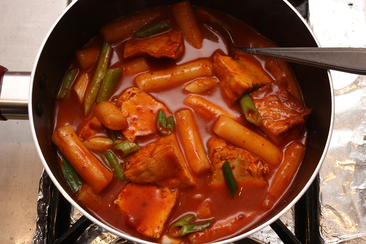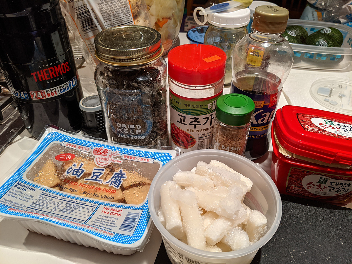 | make broth over medium heat 15 minutes combining water with hondashi and dried seaweed. discard seaweed, add hot pepper paste mixture, along with rice cakes. stir constantly to keep rice cakes from sticking to pan. midway through add tofu wedges. done when liquid reduced to shiny sauce (about 7 minutes). add scallions. | |