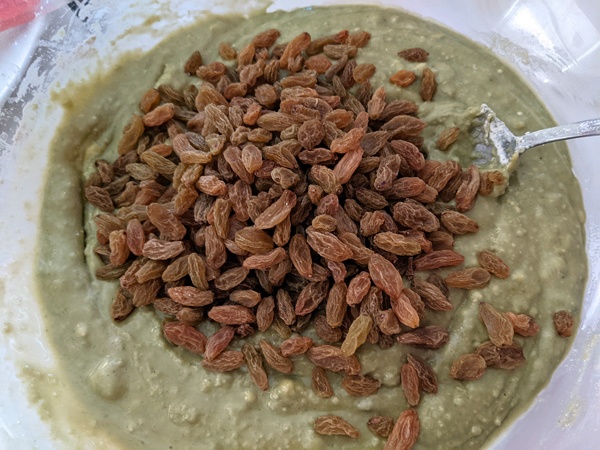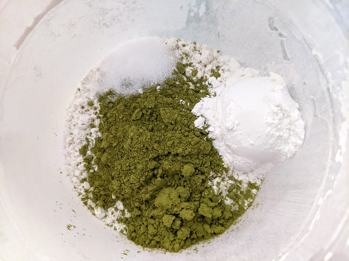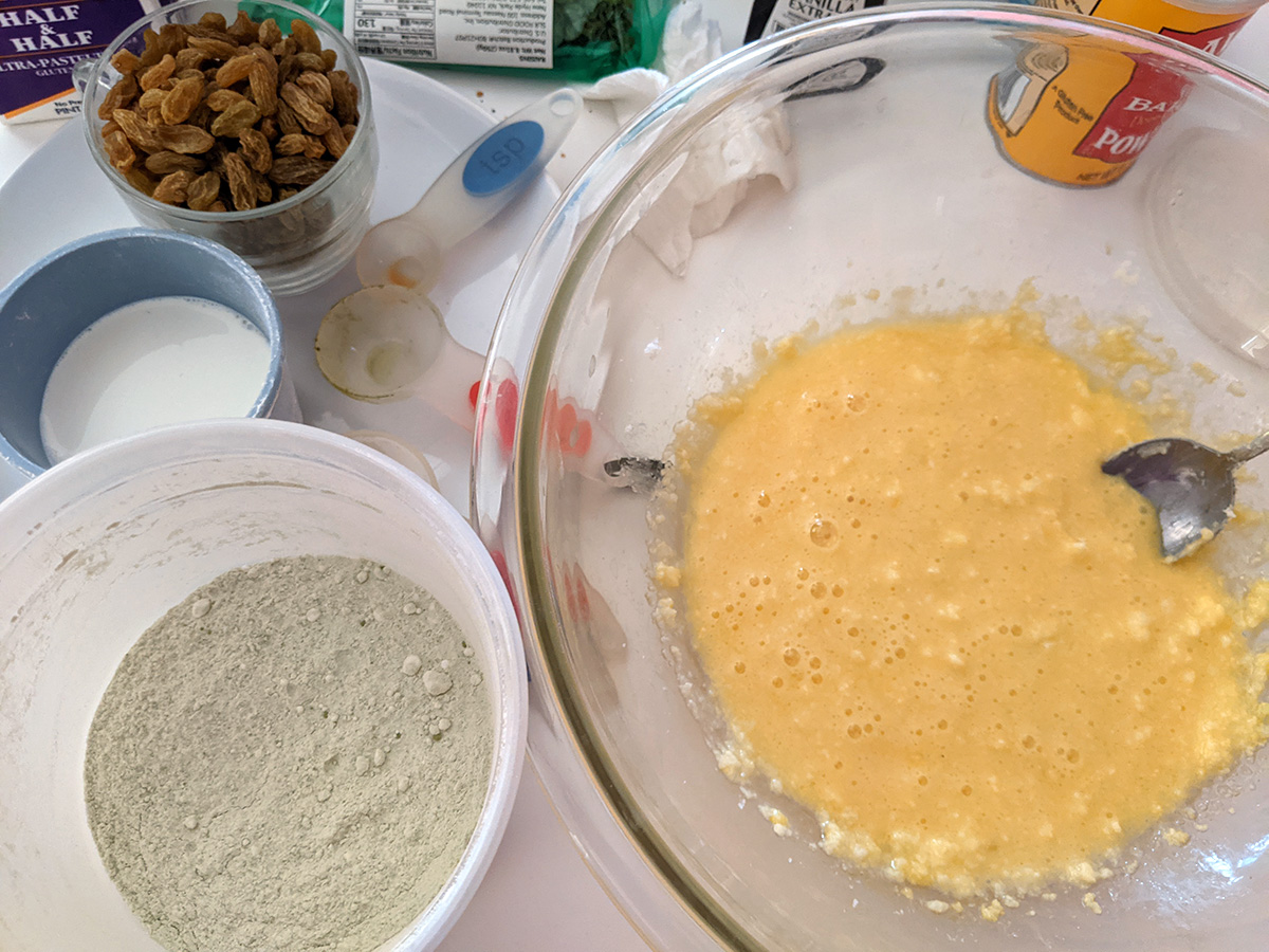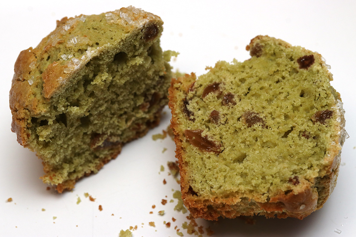 2 cups cake flour 1 tbsp matcha powder 1/2 tsp salt 1 tbsp baking powder 1/2 cup half and half 1 cup green xinjiang raisins sparkling sugar |