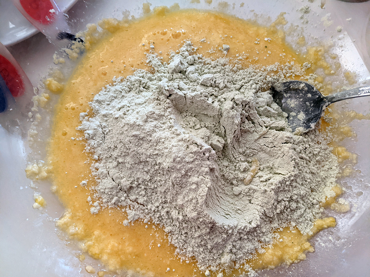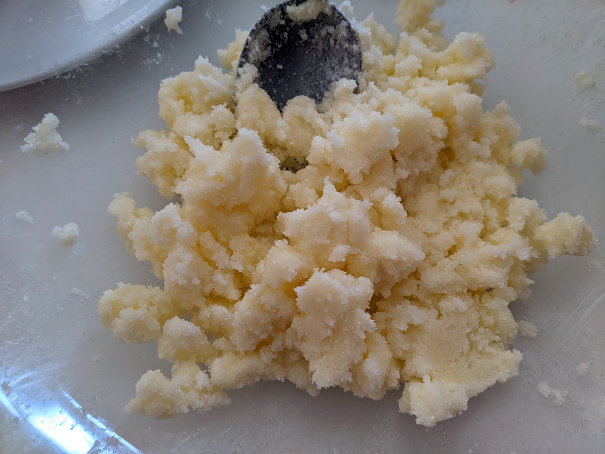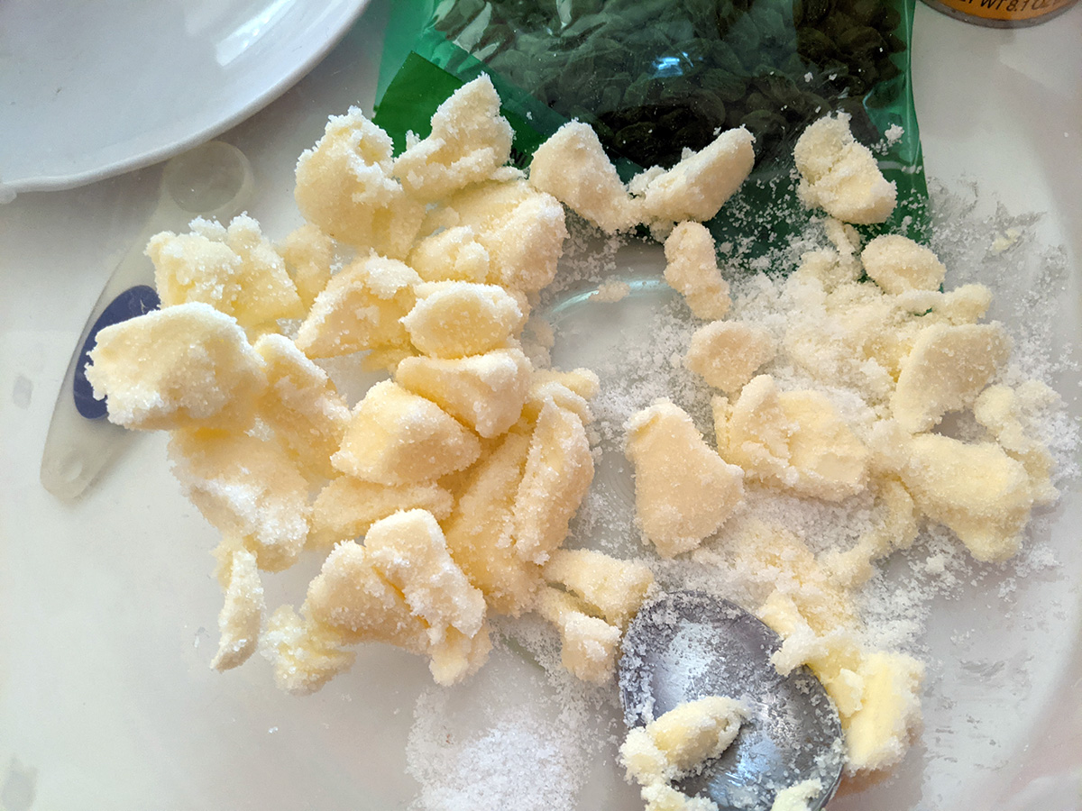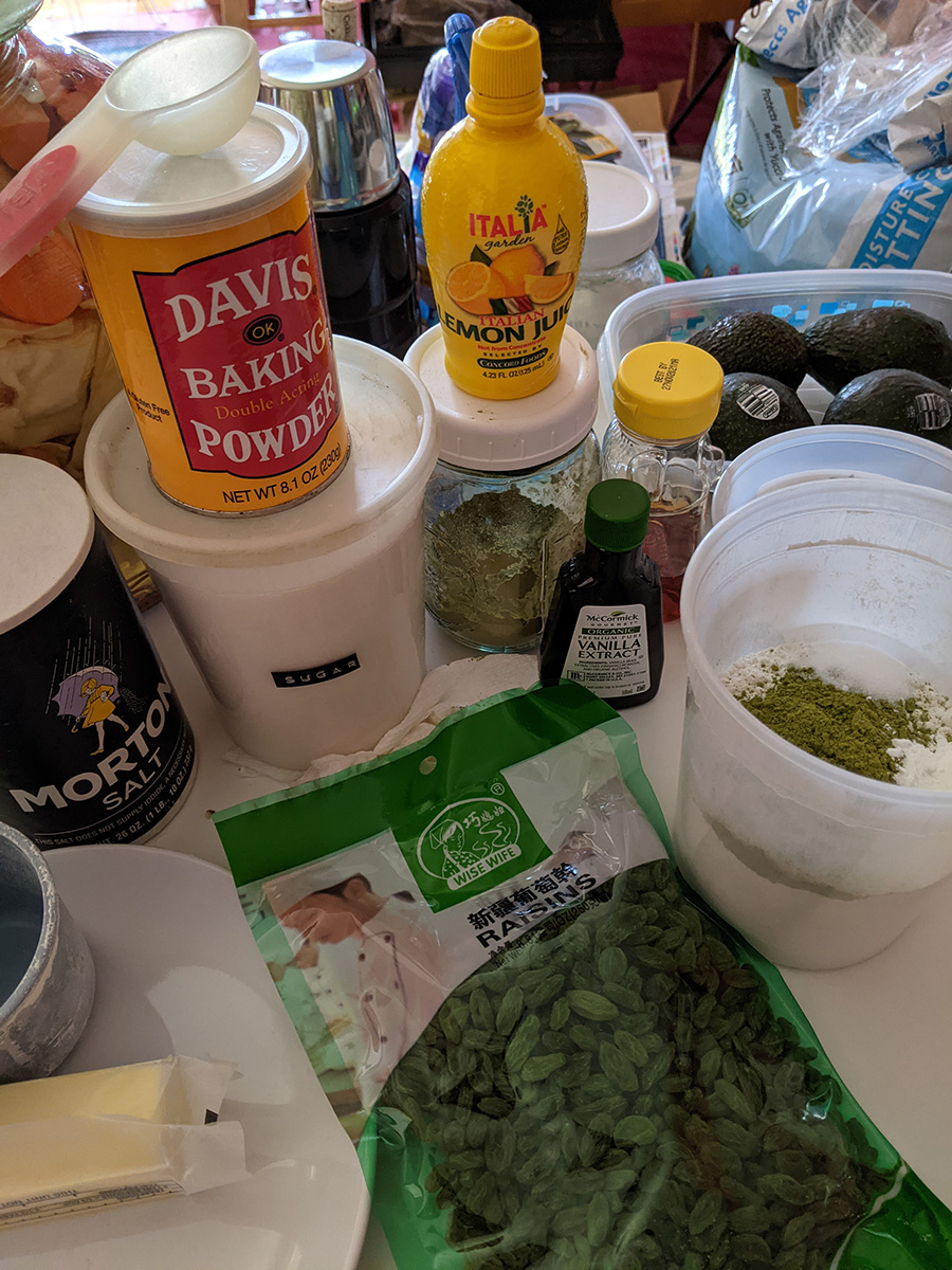 2 cups cake flour 1 tbsp matcha powder 1/2 tsp salt 1 tbsp baking powder 1/2 cup half and half 1 cup green xinjiang raisins sparkling sugar |