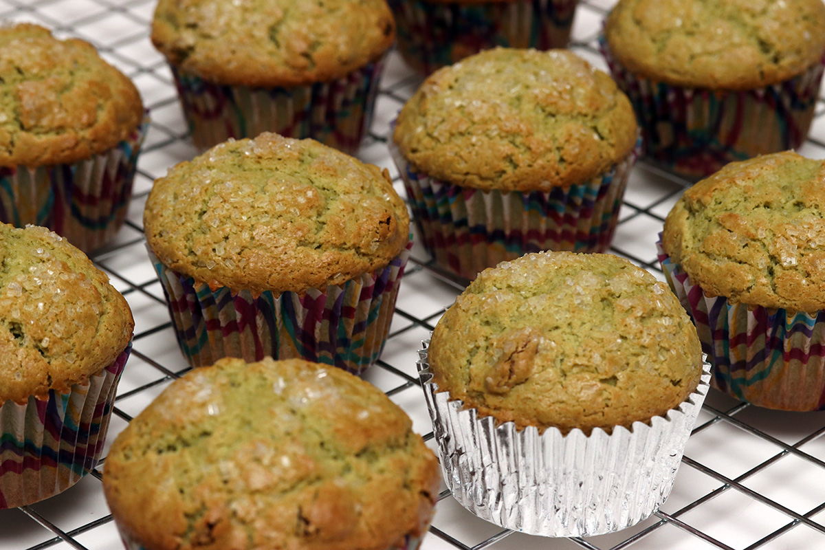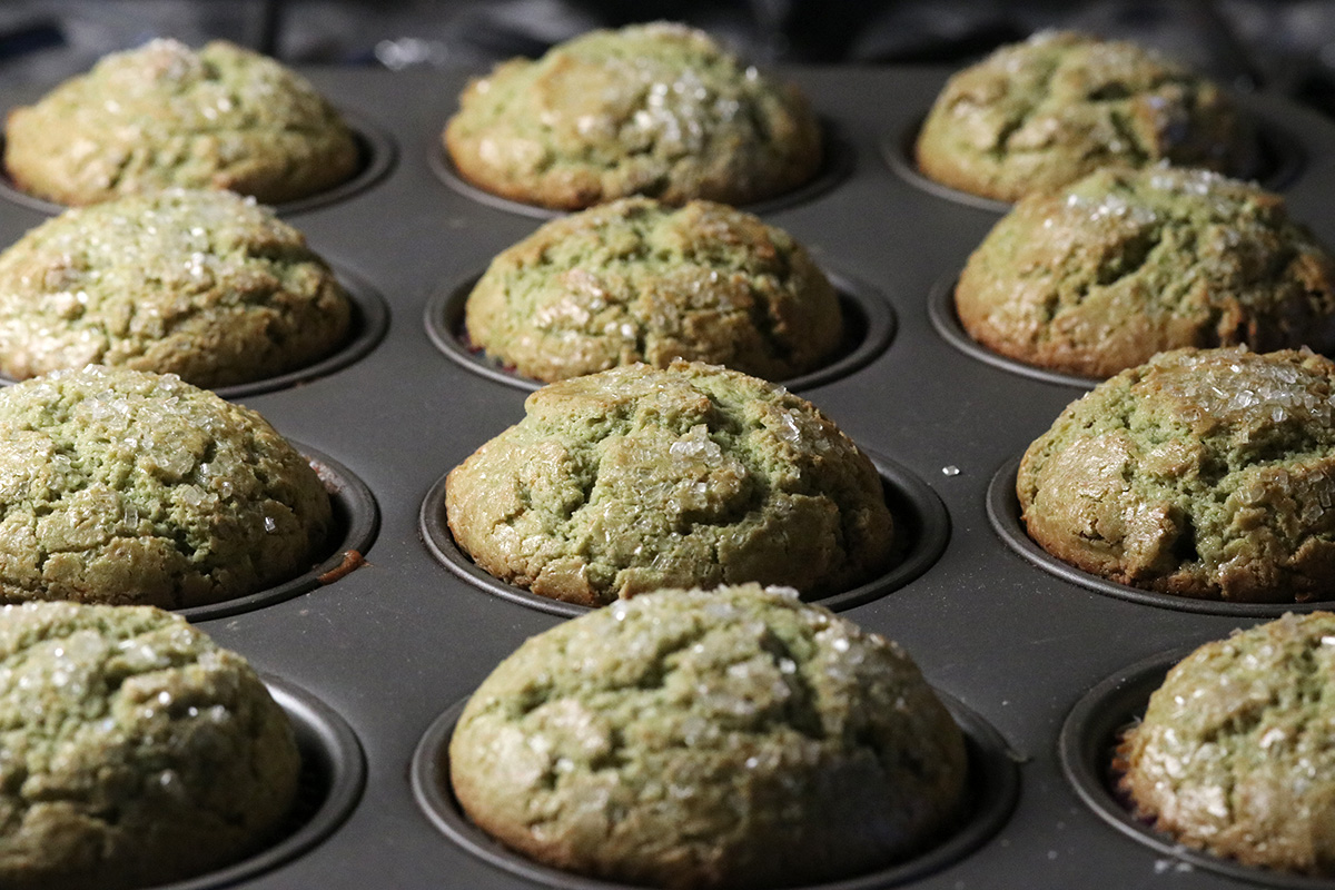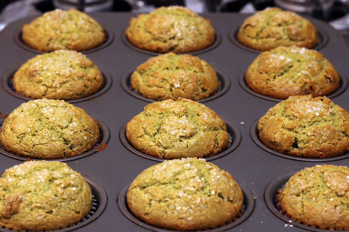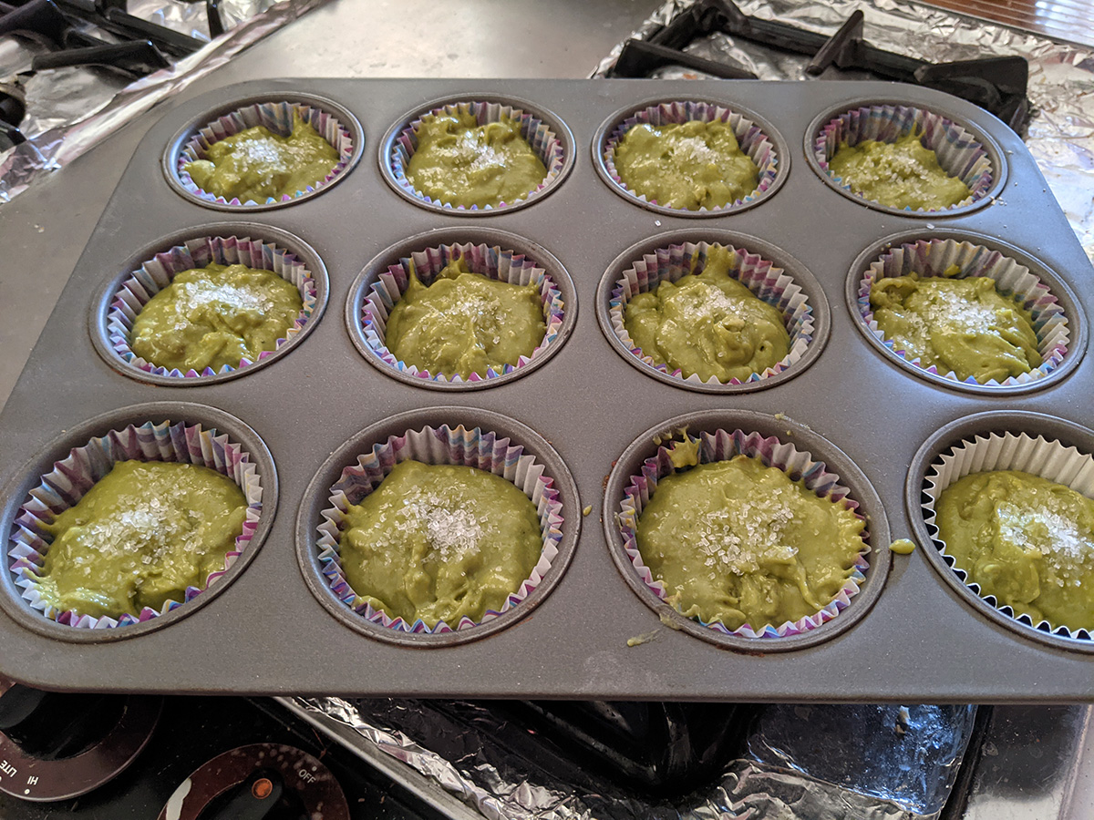 i made matcha muffins today. not knowing how they'd turn out, i used a dozen serving cupcake tray instead of my usual jumbo muffins tray. it's pretty much exactly my jumbo blueberry muffin recipe, except instead of 2 cups of frozen blueberries i used 1 cup of green xinjiang raisins and i added a tbsp of matcha powder. i also had some cupcake liners i found in my kitchen drawer and decided to use them up.