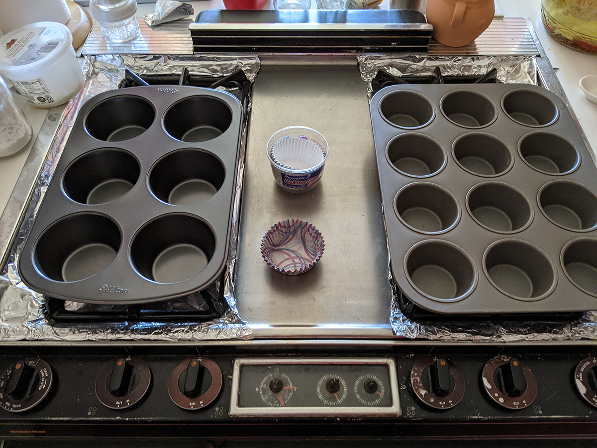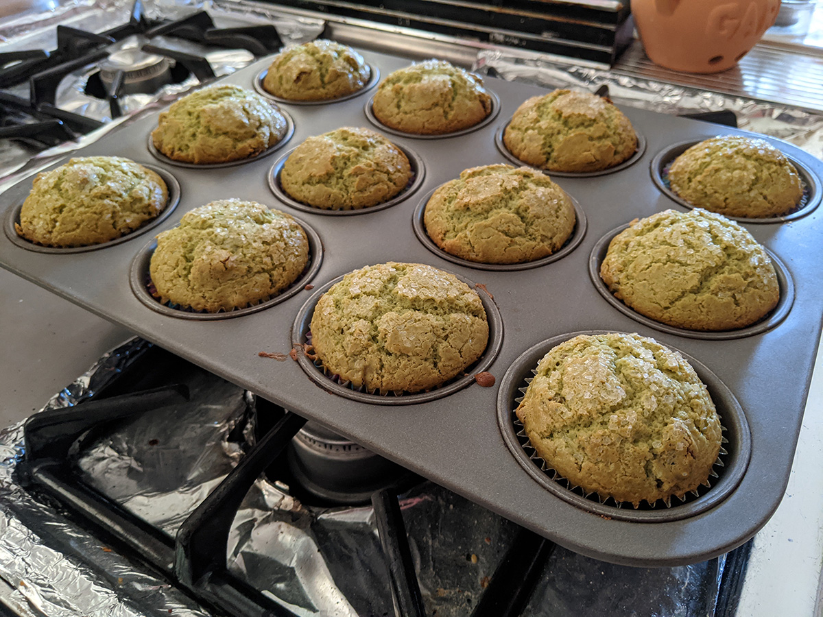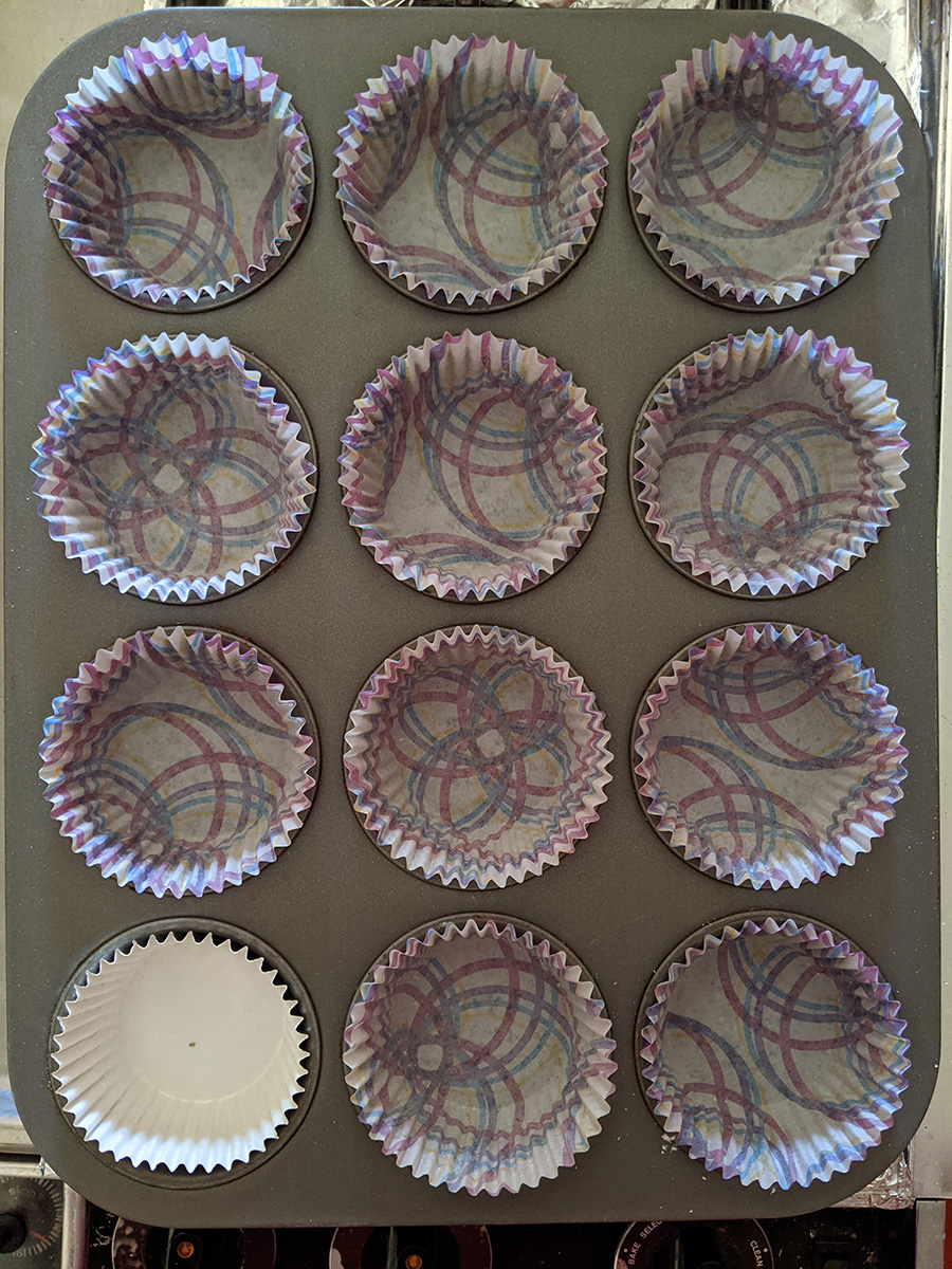 i made matcha muffins today. not knowing how they'd turn out, i used a dozen serving cupcake tray instead of my usual jumbo muffins tray. it's pretty much exactly my jumbo blueberry muffin recipe, except instead of 2 cups of frozen blueberries i used 1 cup of green xinjiang raisins and i added a tbsp of matcha powder. i also had some cupcake liners i found in my kitchen drawer and decided to use them up.