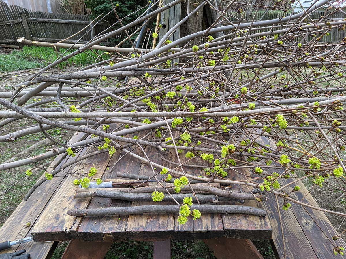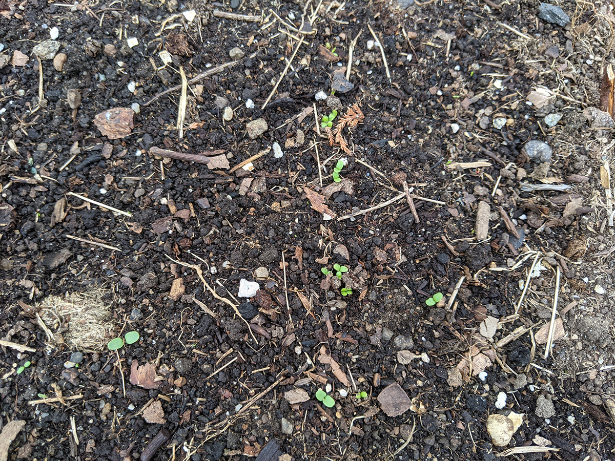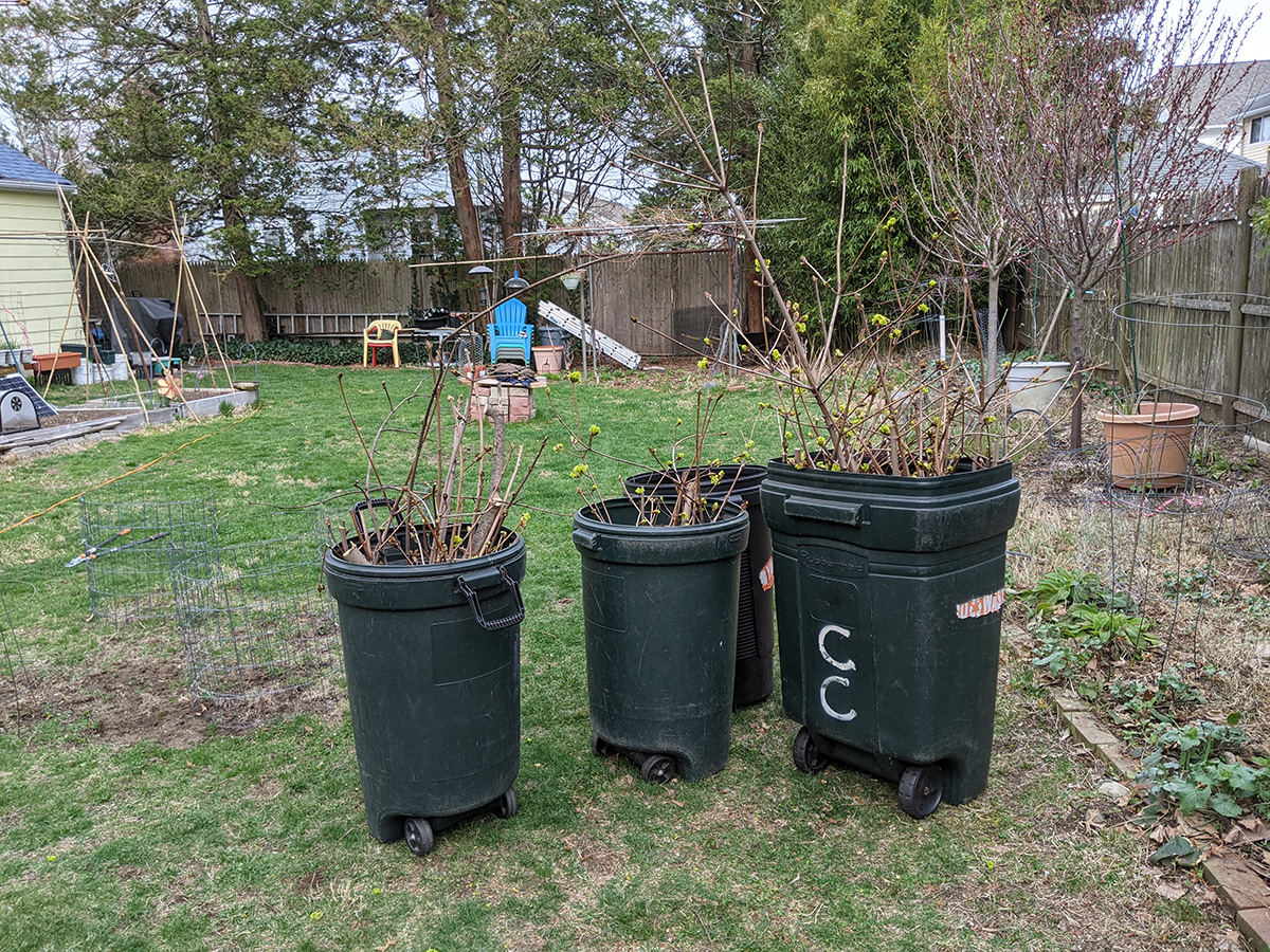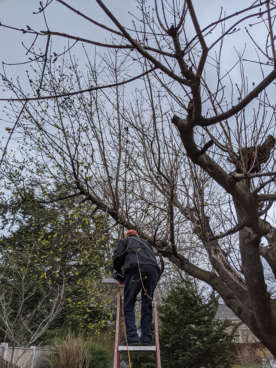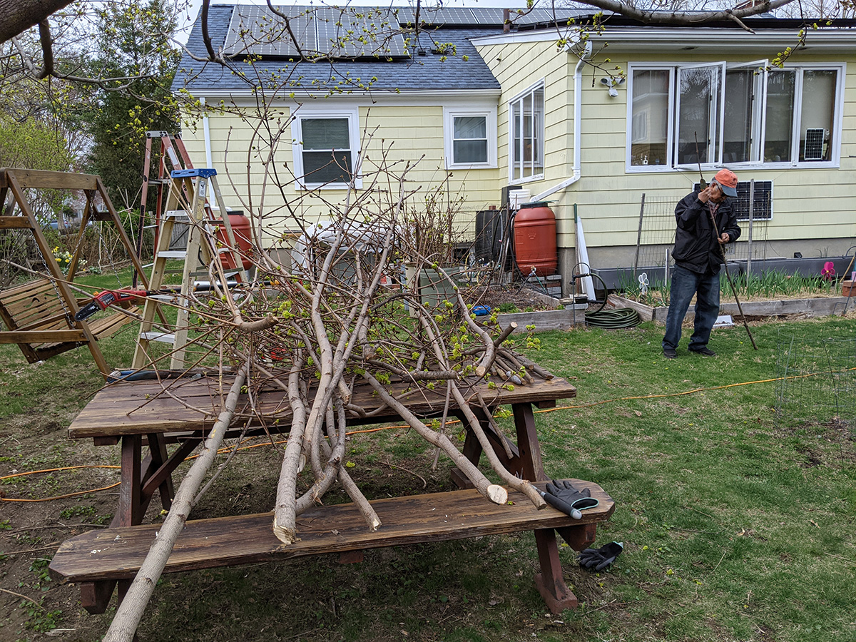 back at the house we pruned the backyard maple tree. the best time to prune would've been in late winter, when the buds are still dormant. but we've never pruned it in the winter because belmont does start its garden refuse pickup until spring, and there's usually so many branches that we end with a ton of uncollected garden refuse. we removed all the vertical suckers and trimmed back some branches to give the yard some more sunlight. after pruning, we cut up all the branches into smaller pieces so they fit the plastic garbage bins. afterwards we watered some plants and i dug out every dandelion i saw growing on the lawn. our lettuce growing under cover has also germinated.