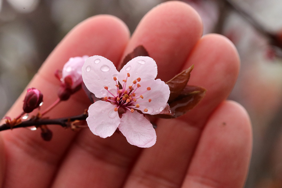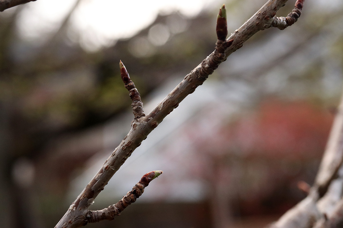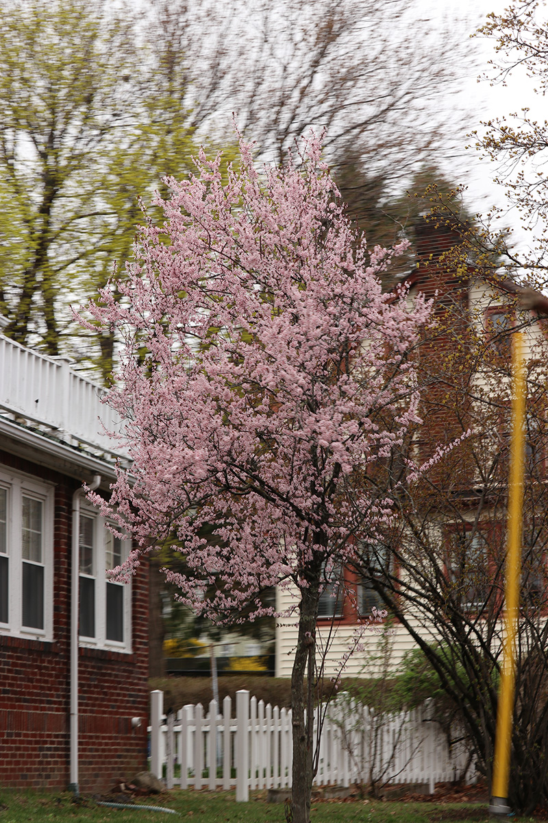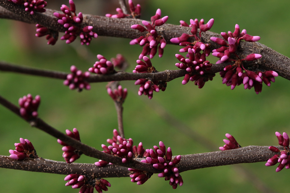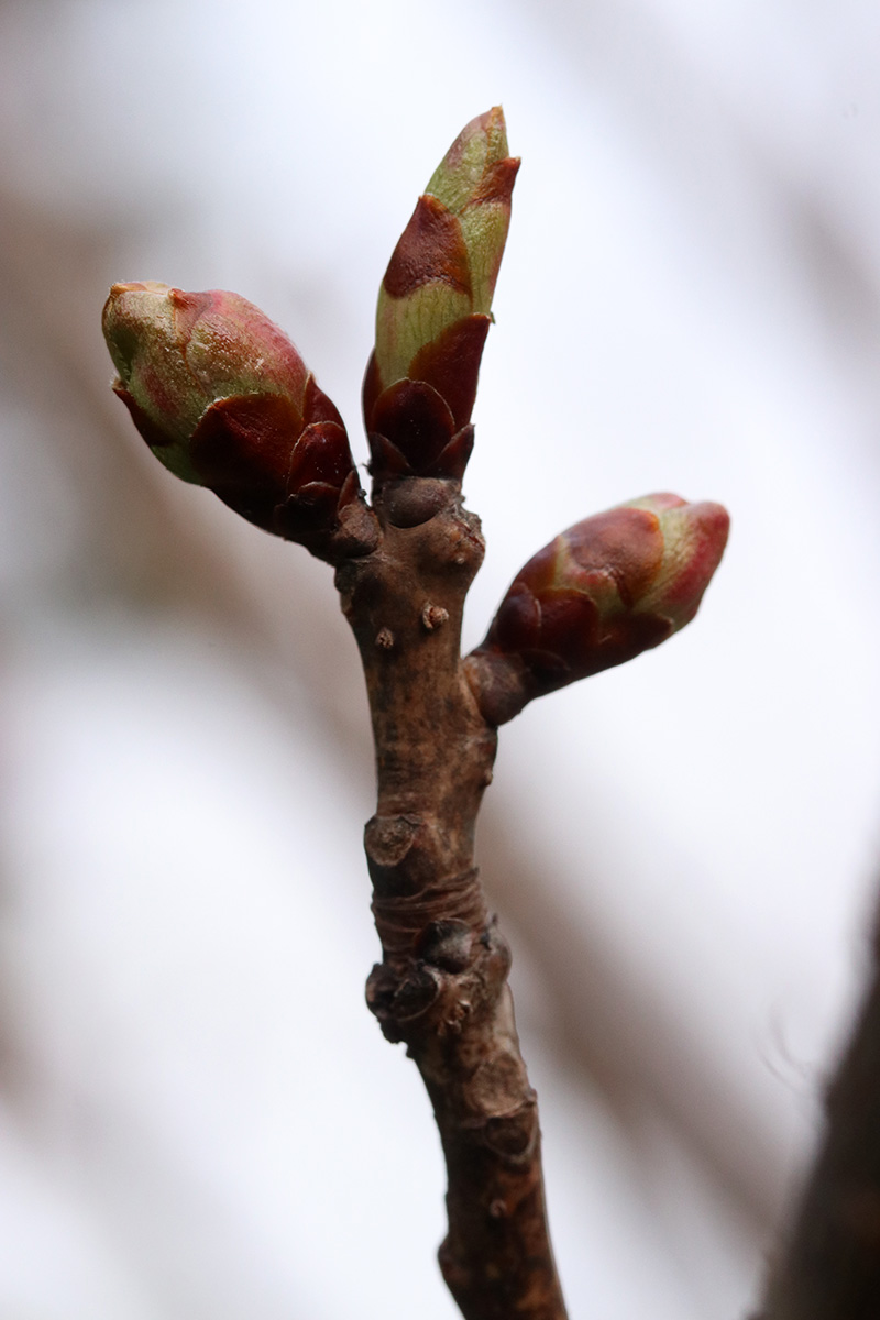 the krauter vesuvius cherry plum has started to blossom. redbud flower buds are swelling. while the kwanzan cherry still needs a few weeks for the buds to swell.
