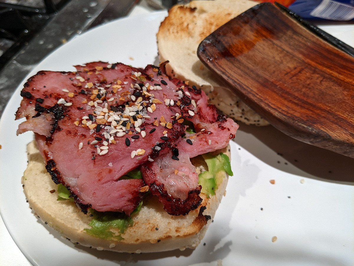 another night, another bagel sandwich. i can't eat anymore. i'm going to have last one tomorrow for lunch tomorrow, then eat something else for dinner, like maybe some savory ramen with an egg-mayonnaise-garlic soup base i saw online. good news is i continue to lose weight with my matcha latte for lunch and only dinner diet (down to 153.4 lbs. as of this morning). i don't know how long i can keep it up. i'm not sure i'll enjoy matcha latte quite so much once the weather warms up, but nobody said matcha latte can't be made with cold milk instead. my matcha powder supply is dwindling too. should i order more, or go back to my regular lunch-dinner routine?