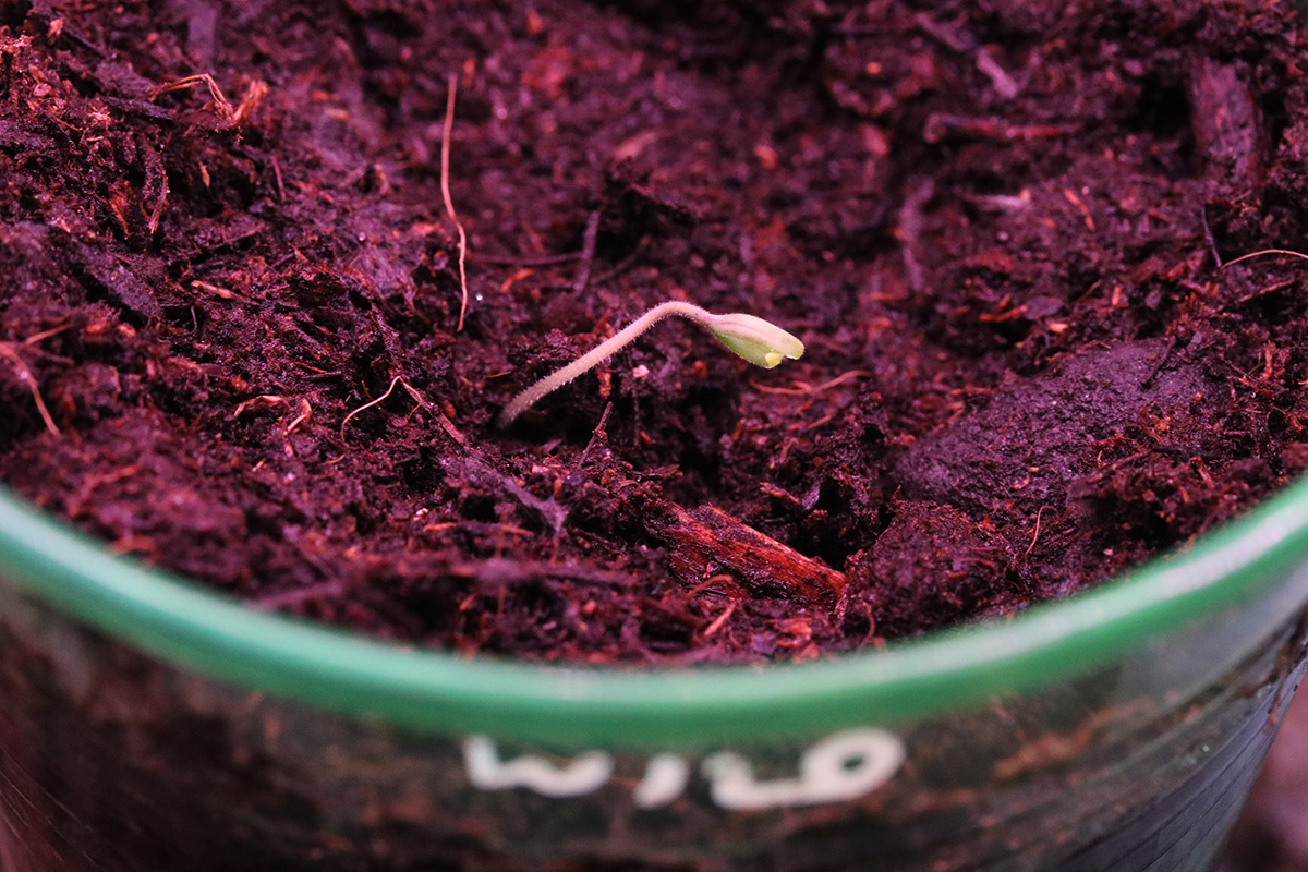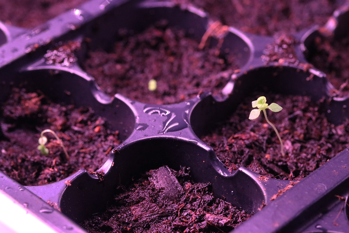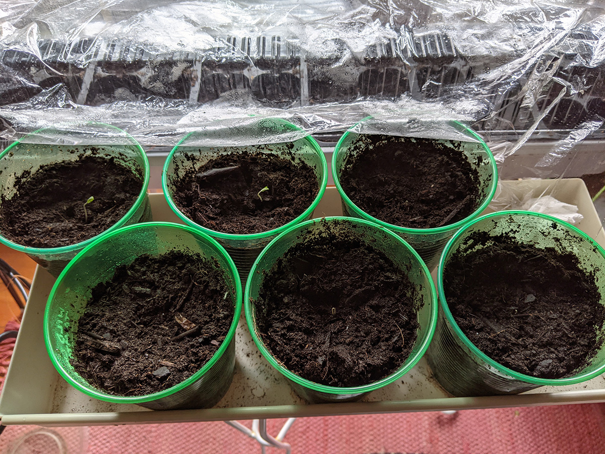 the wild cherry tomato seeds surprised me this morning by all sprouting (6). it was just two days ago when i removed the pre-germinated seedlings and planted them into pots. they looked deformed, the roots all crooked, i figured i'd be lucky if one or two ended up emerging from the soil, wasn't excepting them all to survive. and i wasn't sure how many more days i had to wait, but it took just 2 days, from pre-germinated sprouts to emerging-from-soil seedlings. i may have to reconsider the idea of pre-germinate for future seed germination. i ended up locating them into my grow closet so they can get some led light.