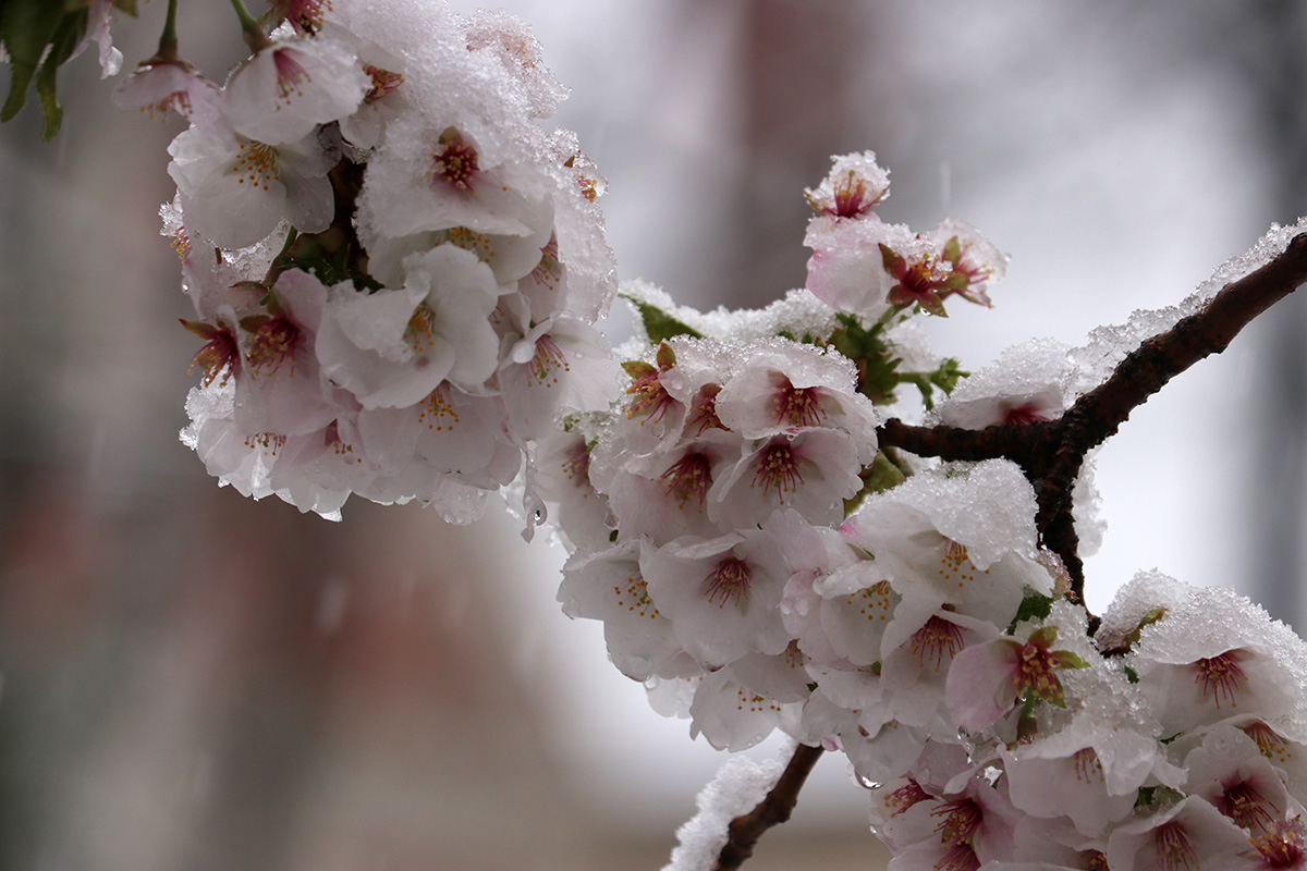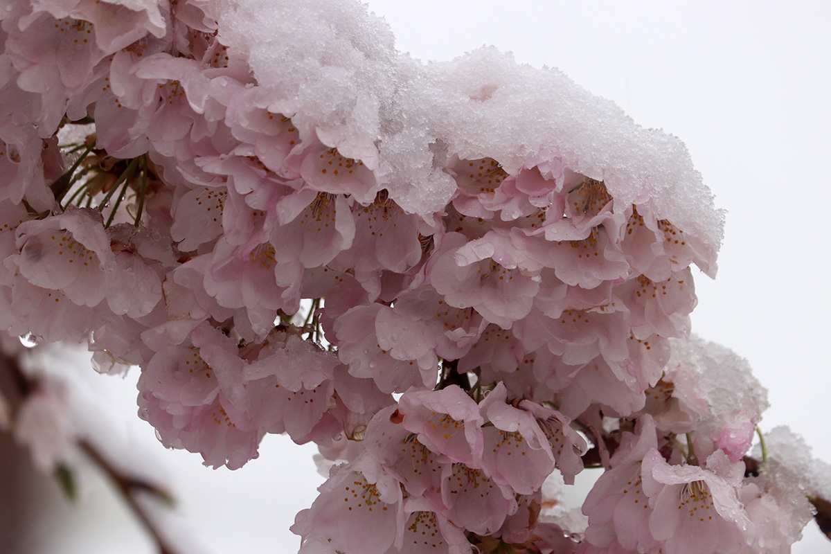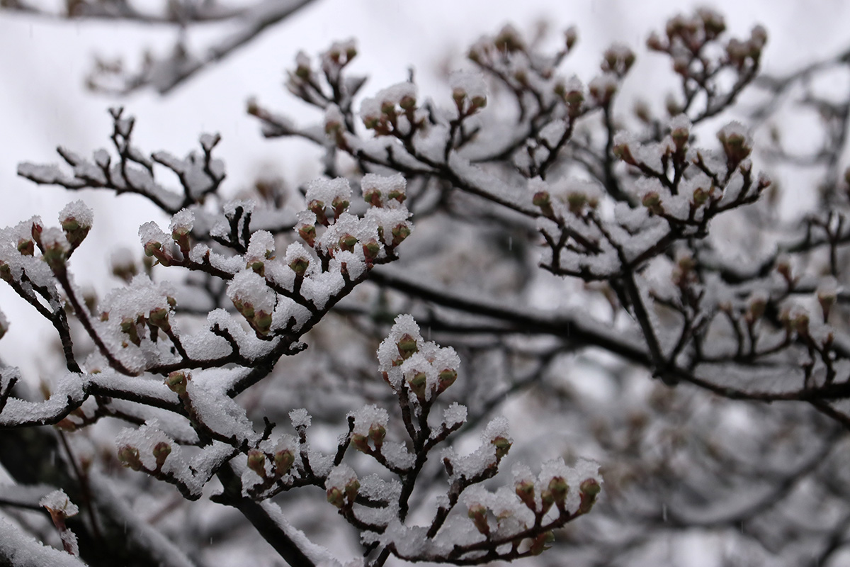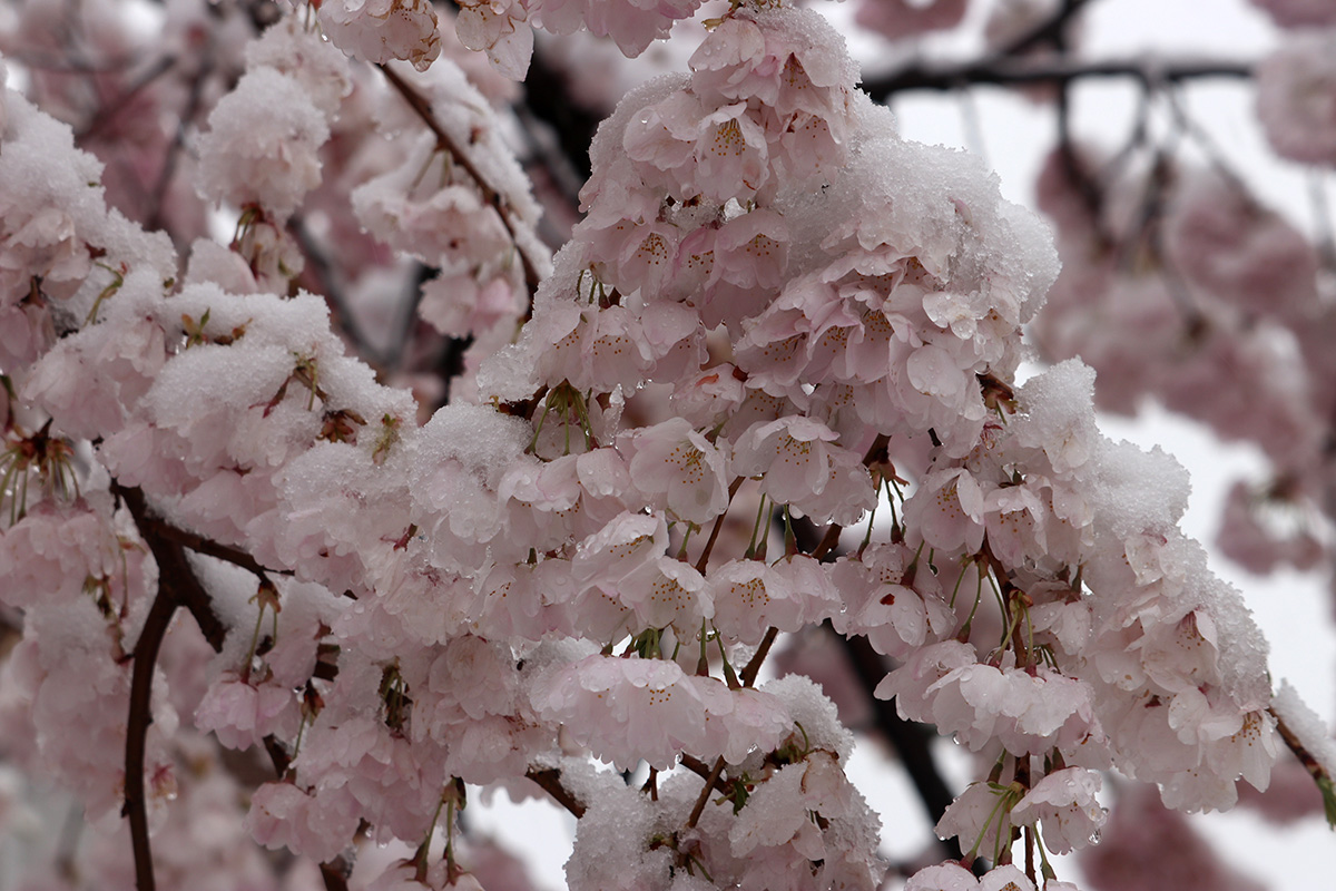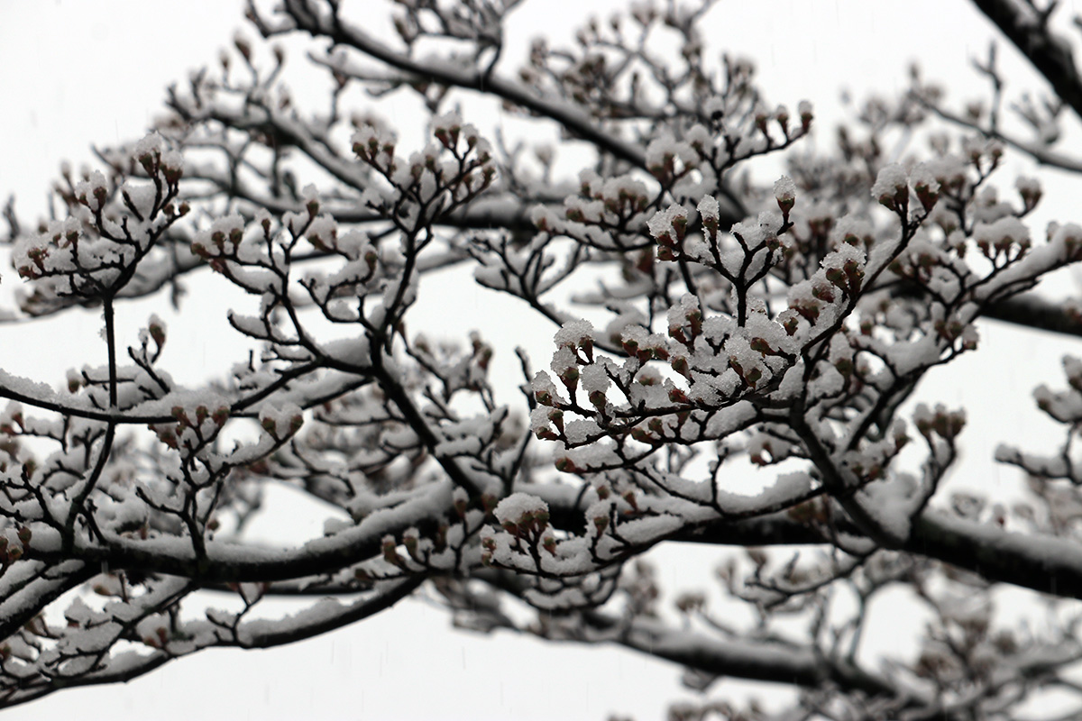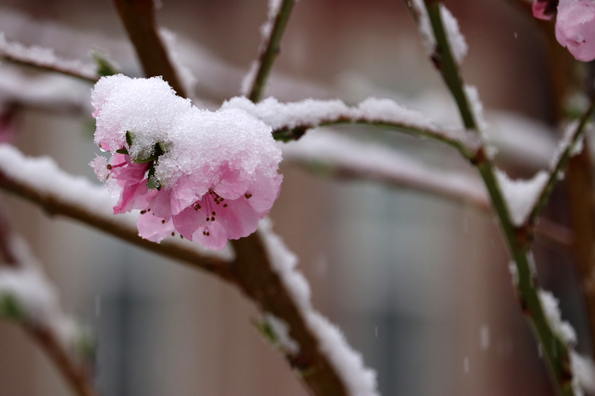 i circled the block, photographing some flowering trees, including yoshino cherries and peach blossoms. i seemed to be the first person out there since it snowed because i didn't see any other foot prints.