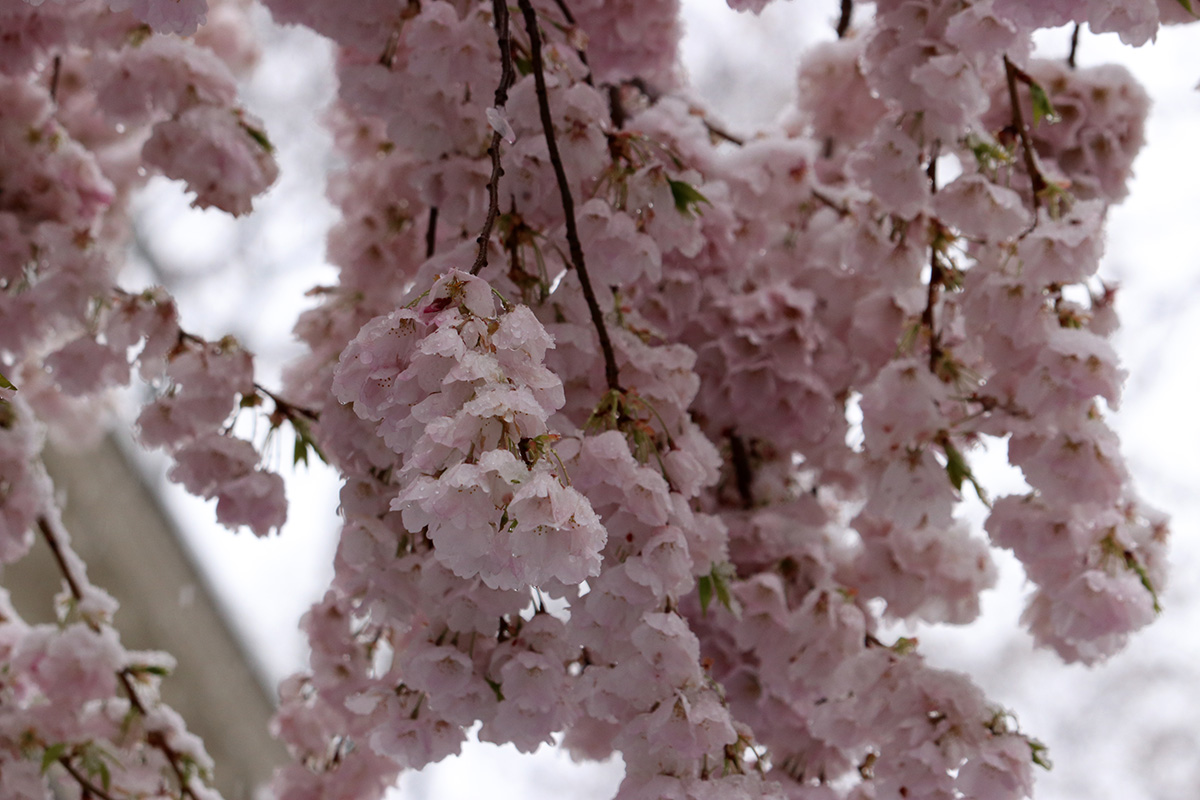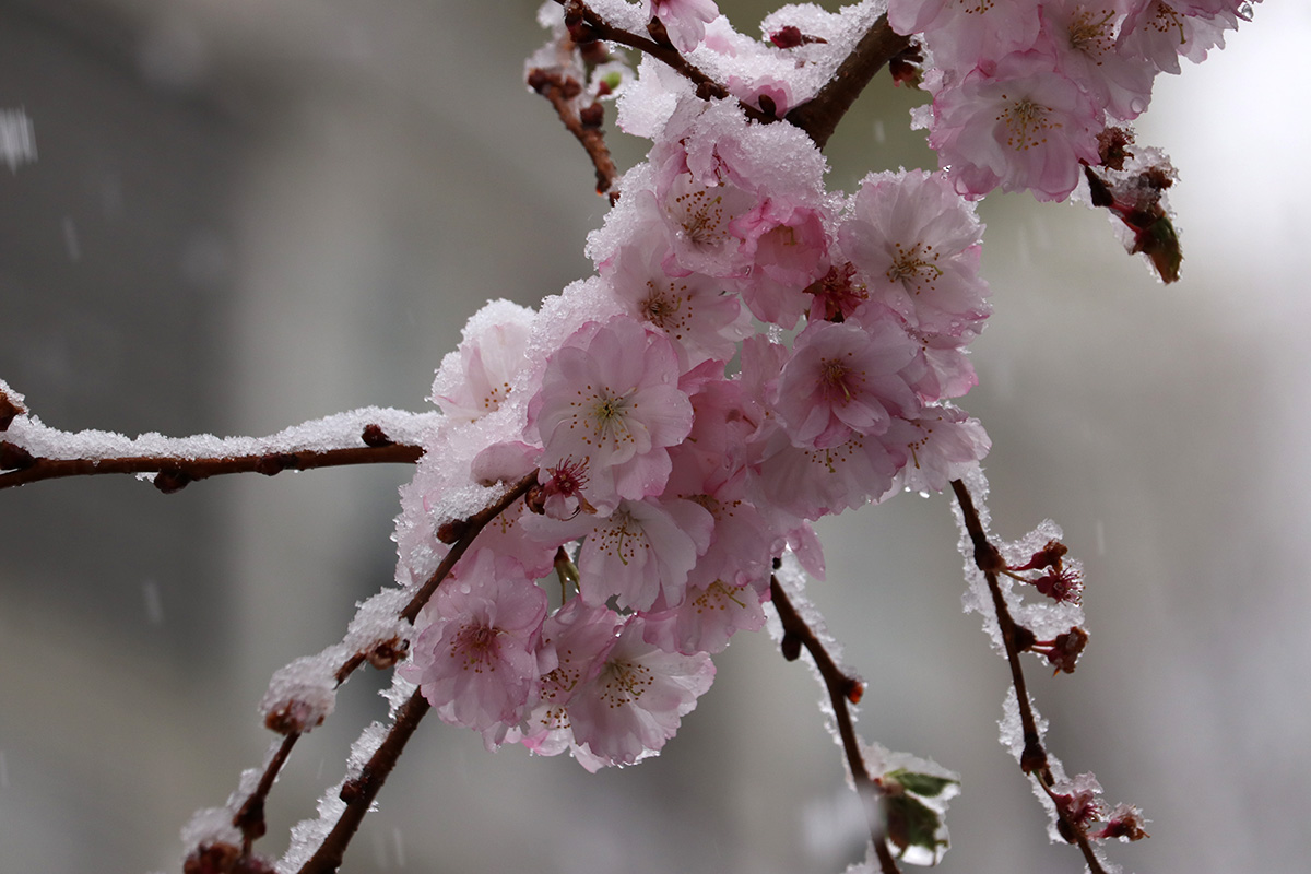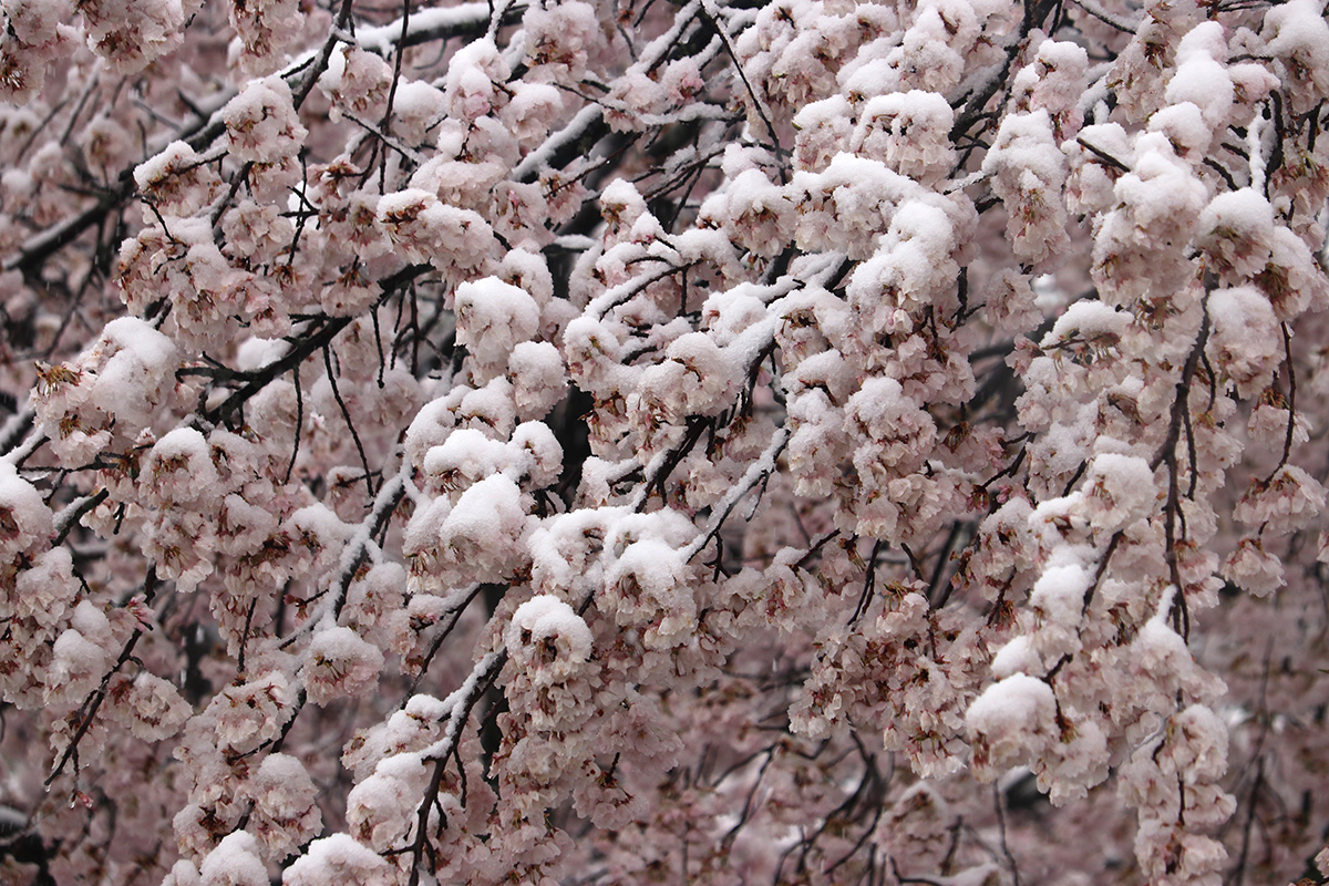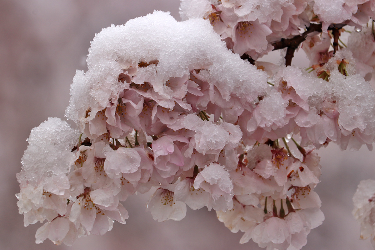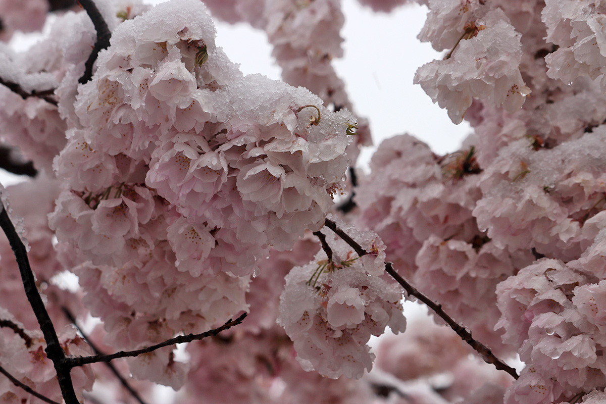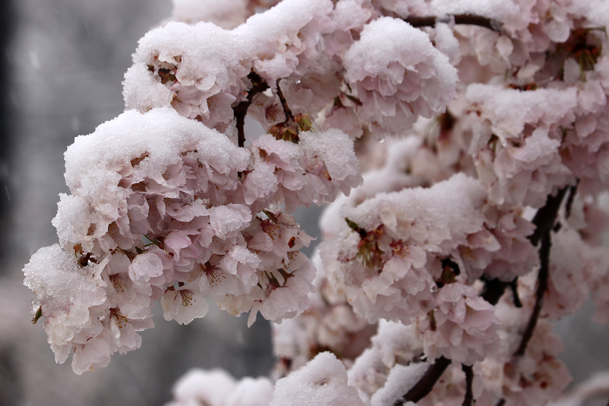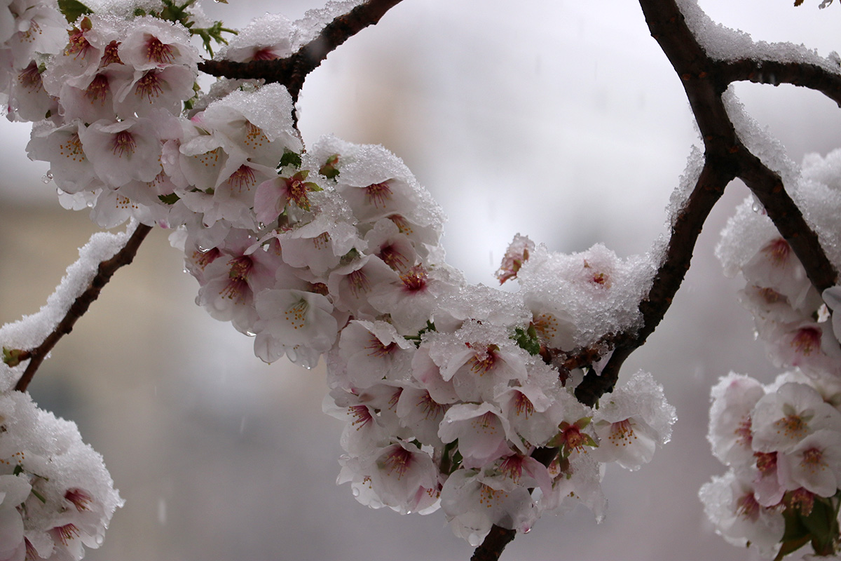 i circled the block, photographing some flowering trees, including yoshino cherries and peach blossoms. i seemed to be the first person out there since it snowed because i didn't see any other foot prints.