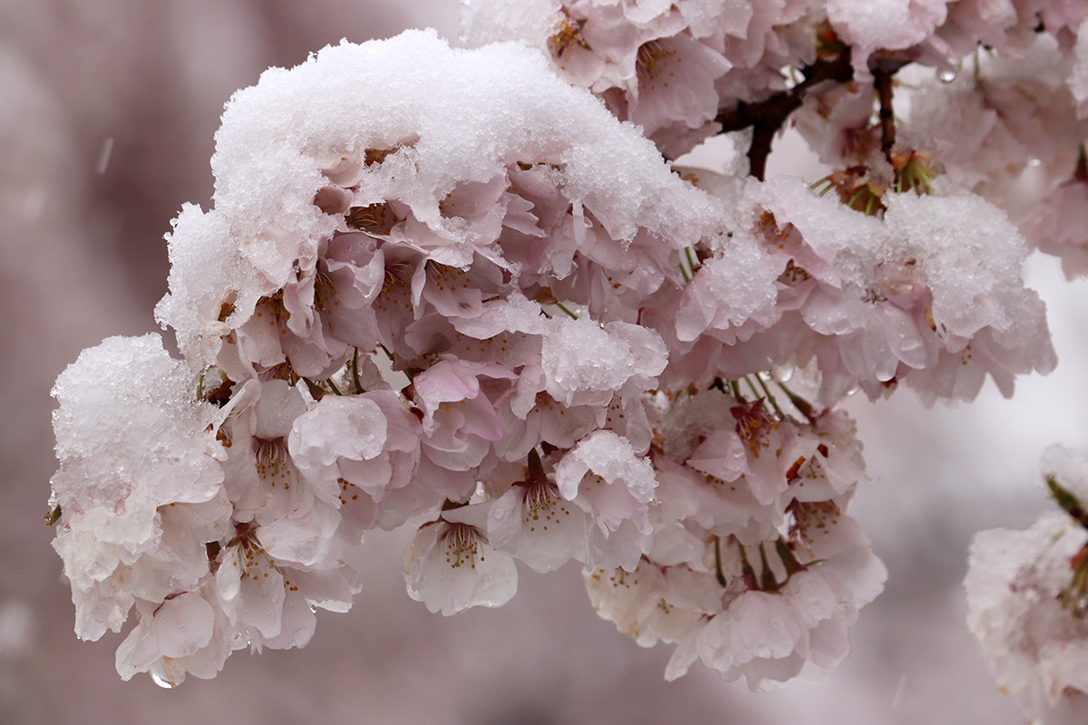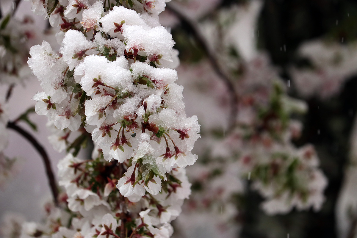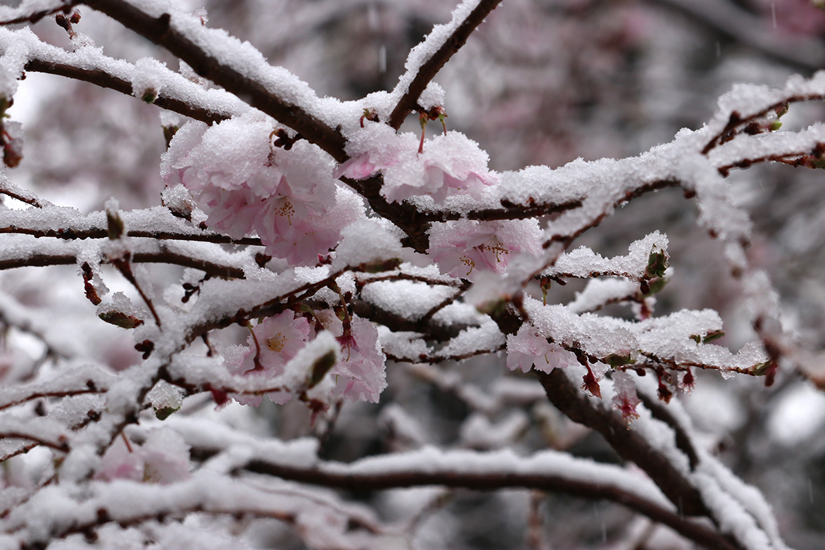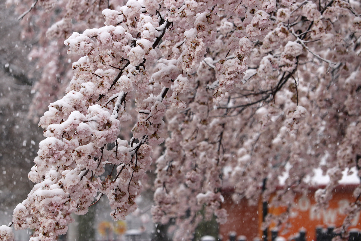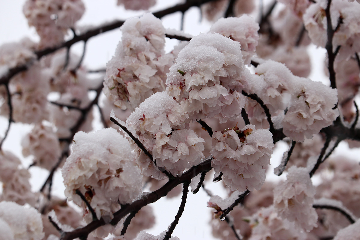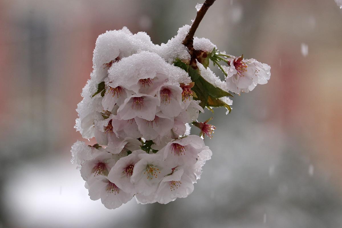 i circled the block, photographing some flowering trees, including yoshino cherries and peach blossoms. i seemed to be the first person out there since it snowed because i didn't see any other foot prints.