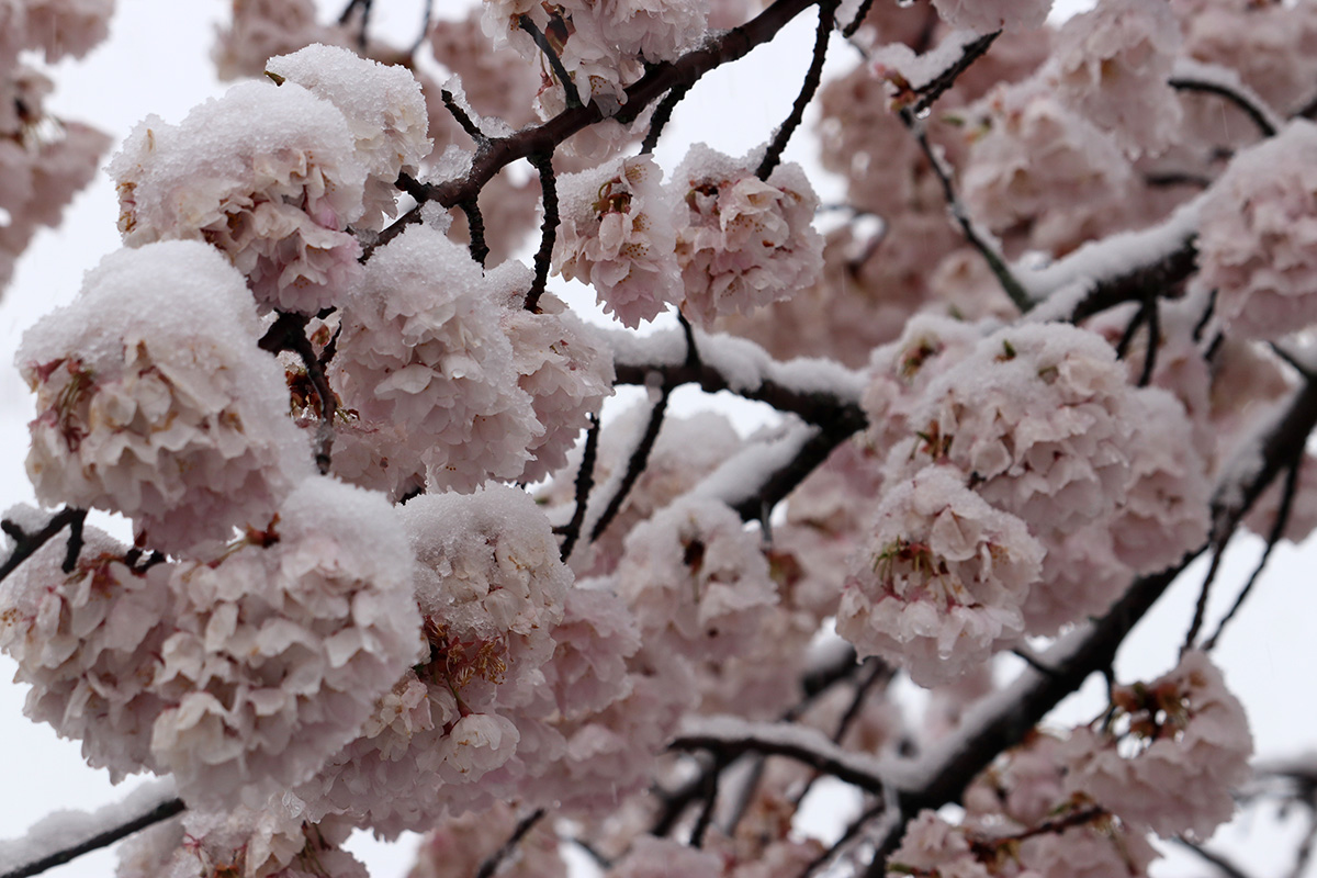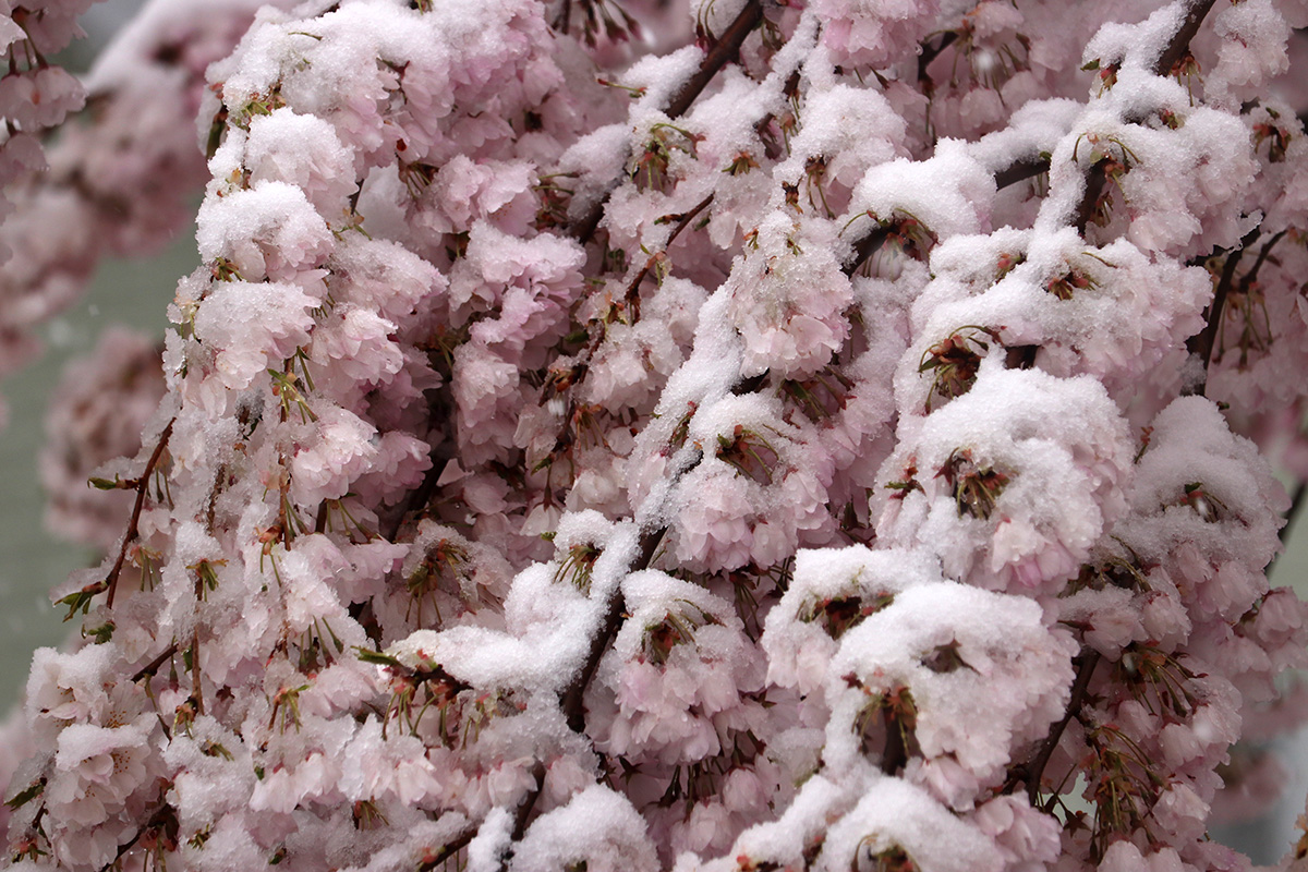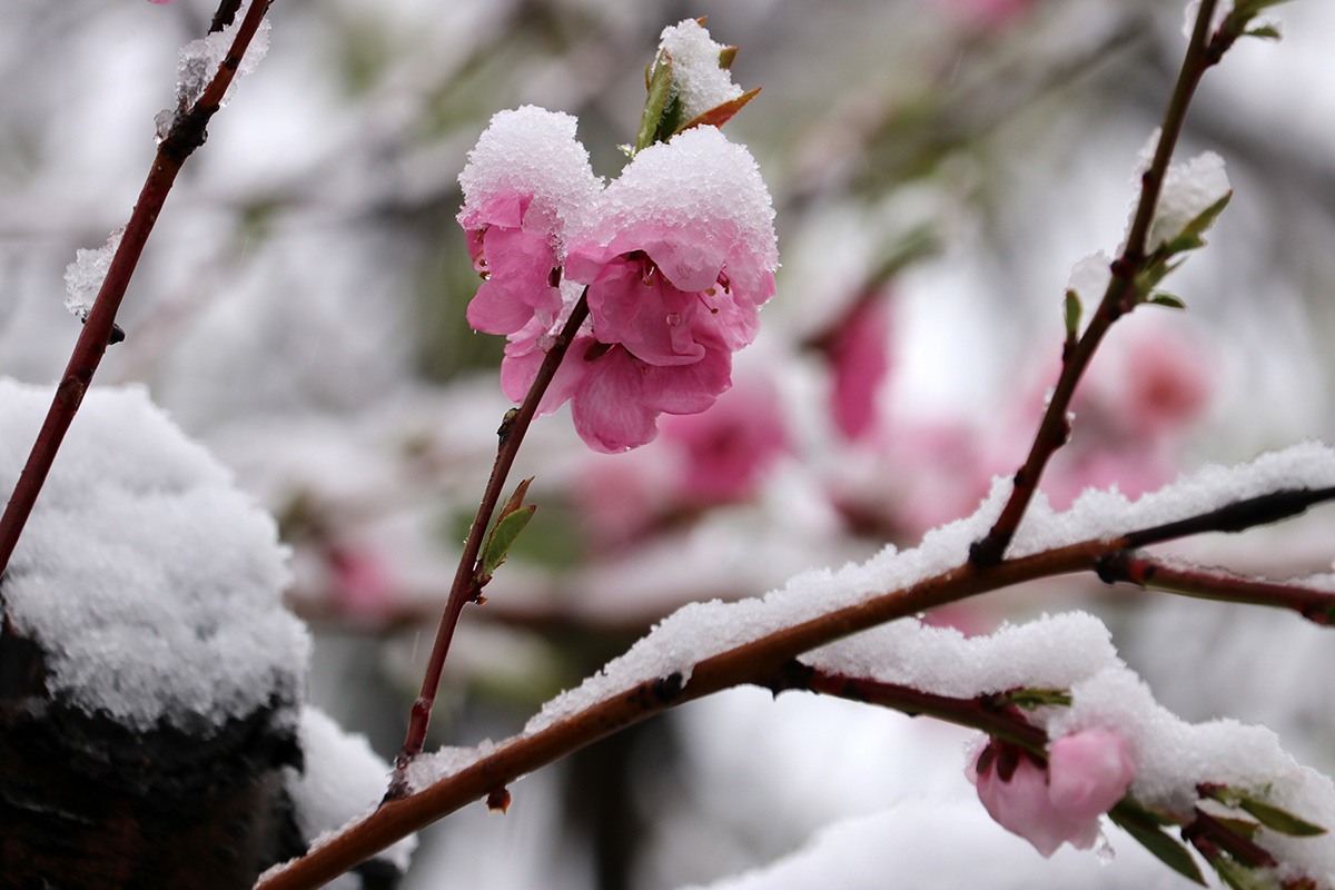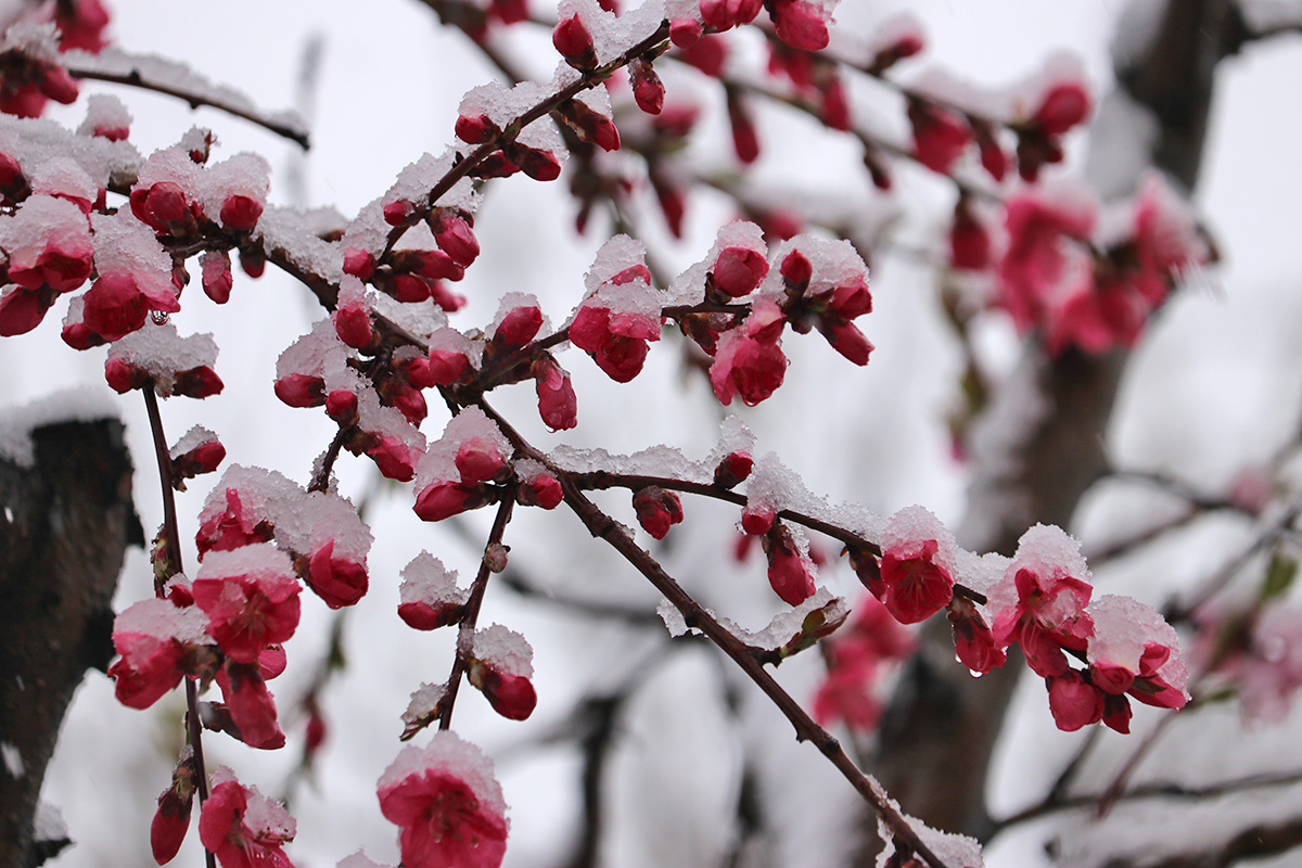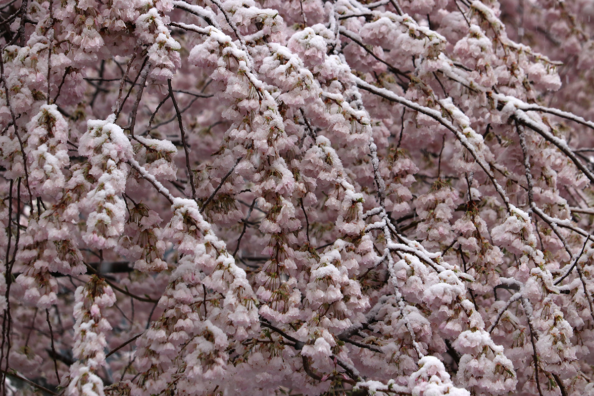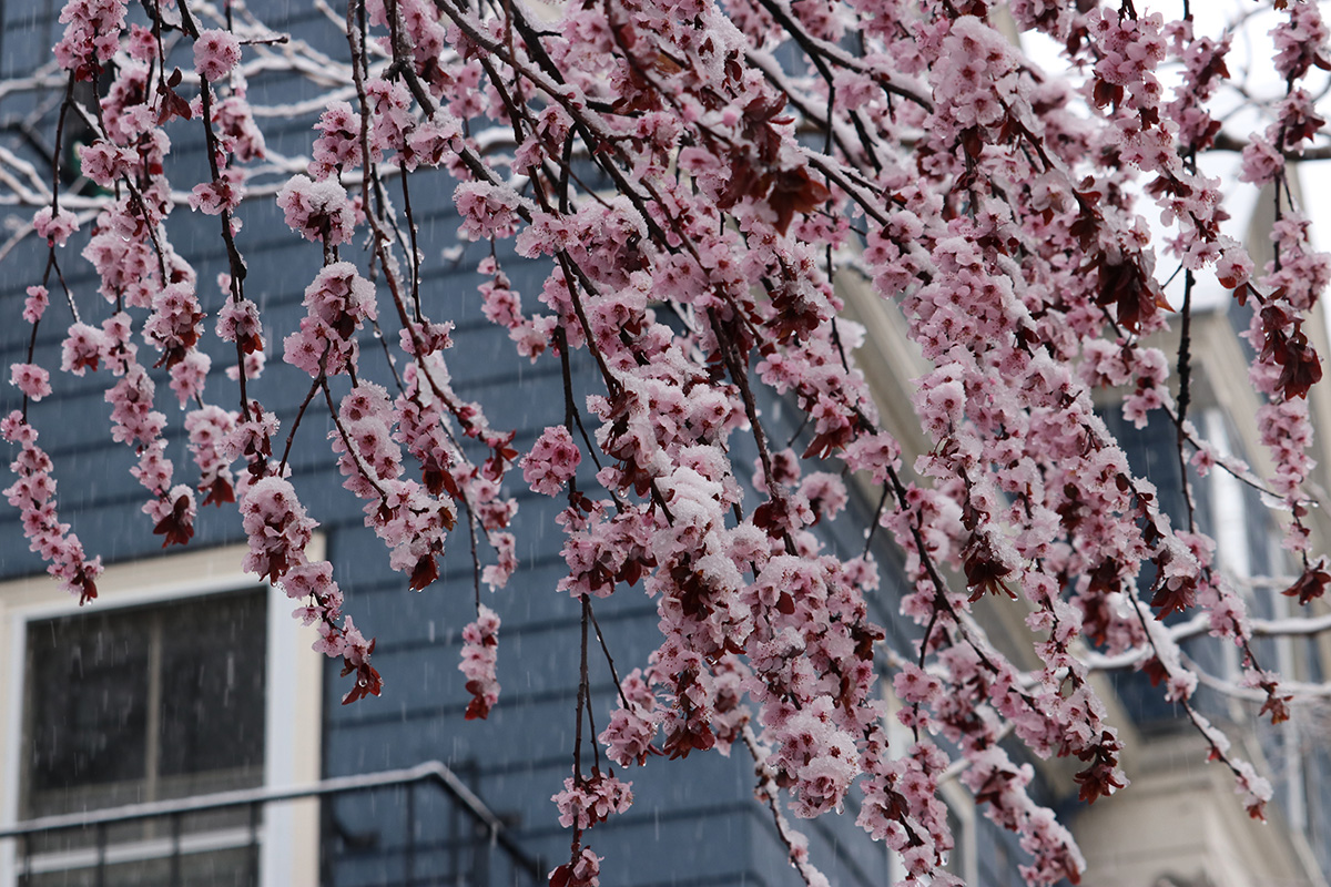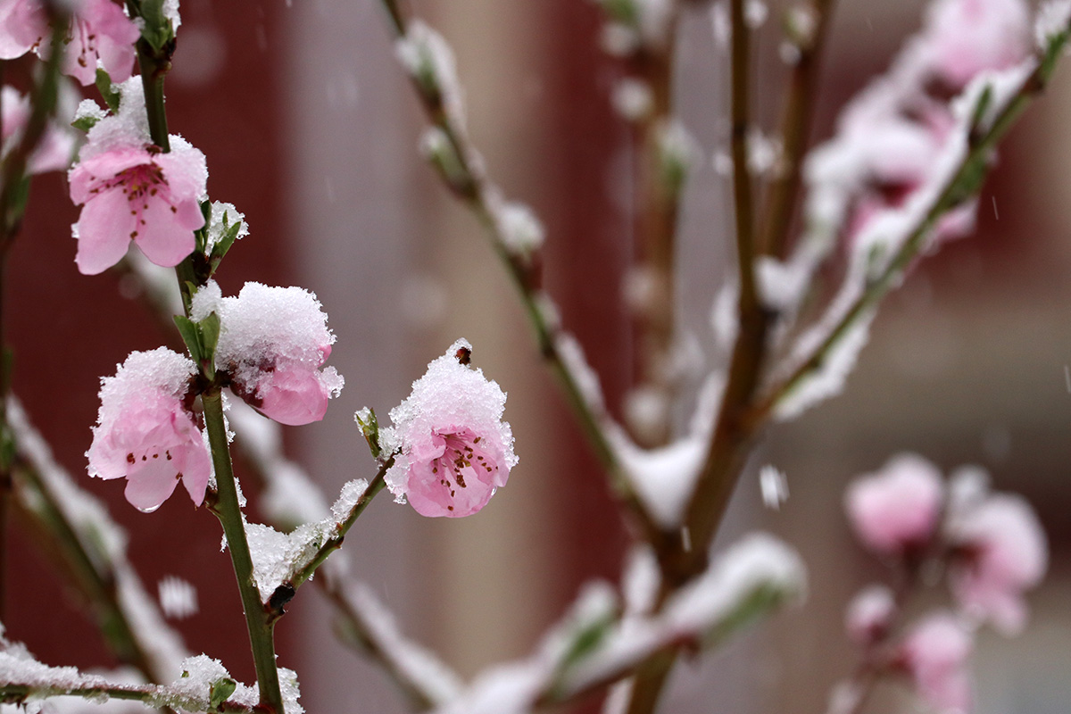 i circled the block, photographing some flowering trees, including yoshino cherries and peach blossoms. i seemed to be the first person out there since it snowed because i didn't see any other foot prints.