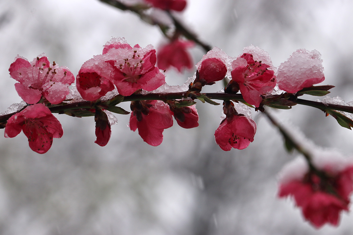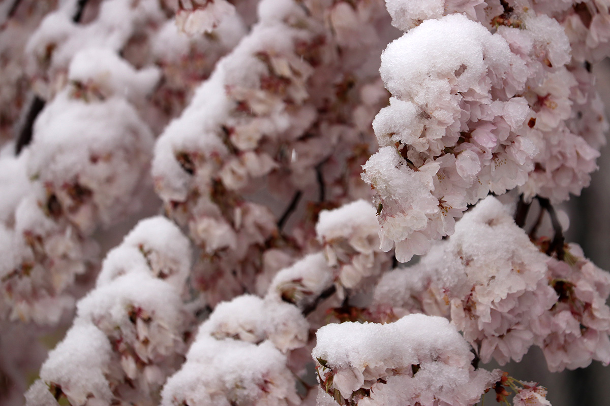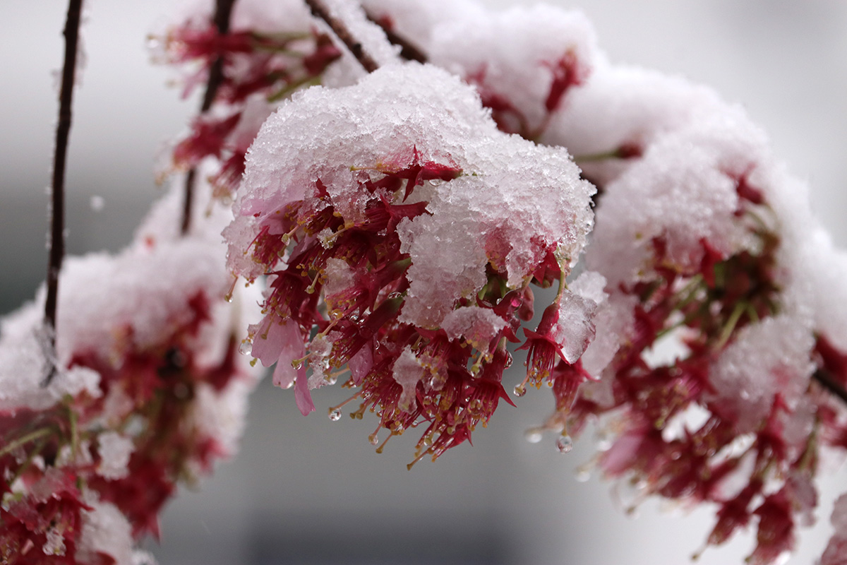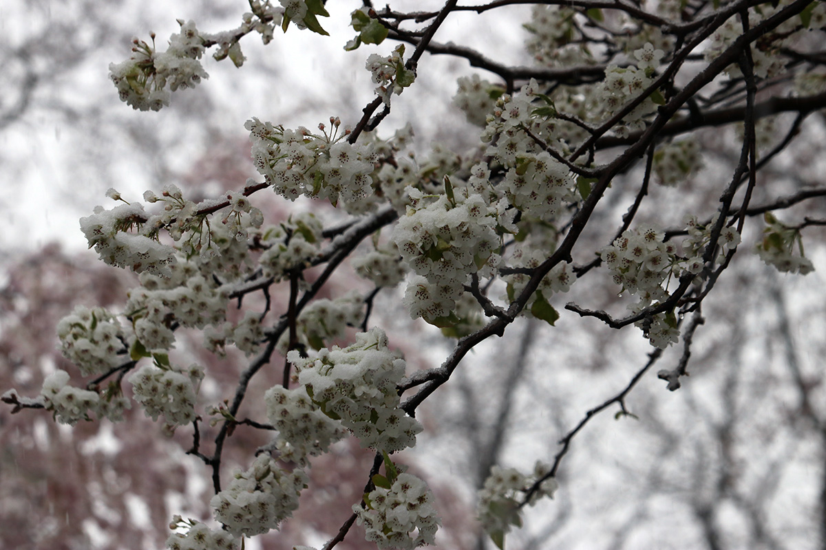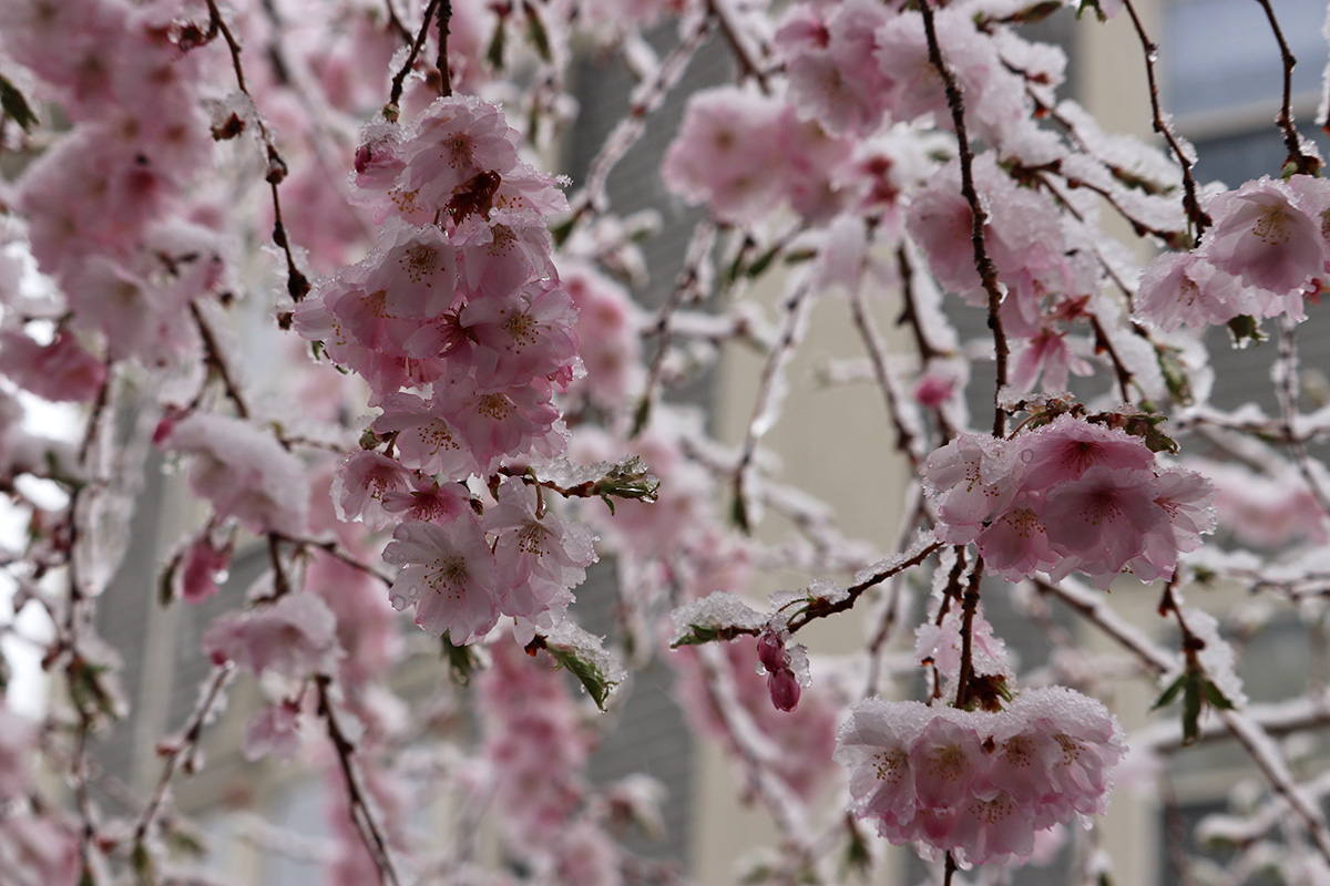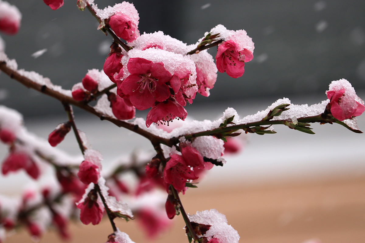 i circled the block, photographing some flowering trees, including yoshino cherries and peach blossoms. i seemed to be the first person out there since it snowed because i didn't see any other foot prints.